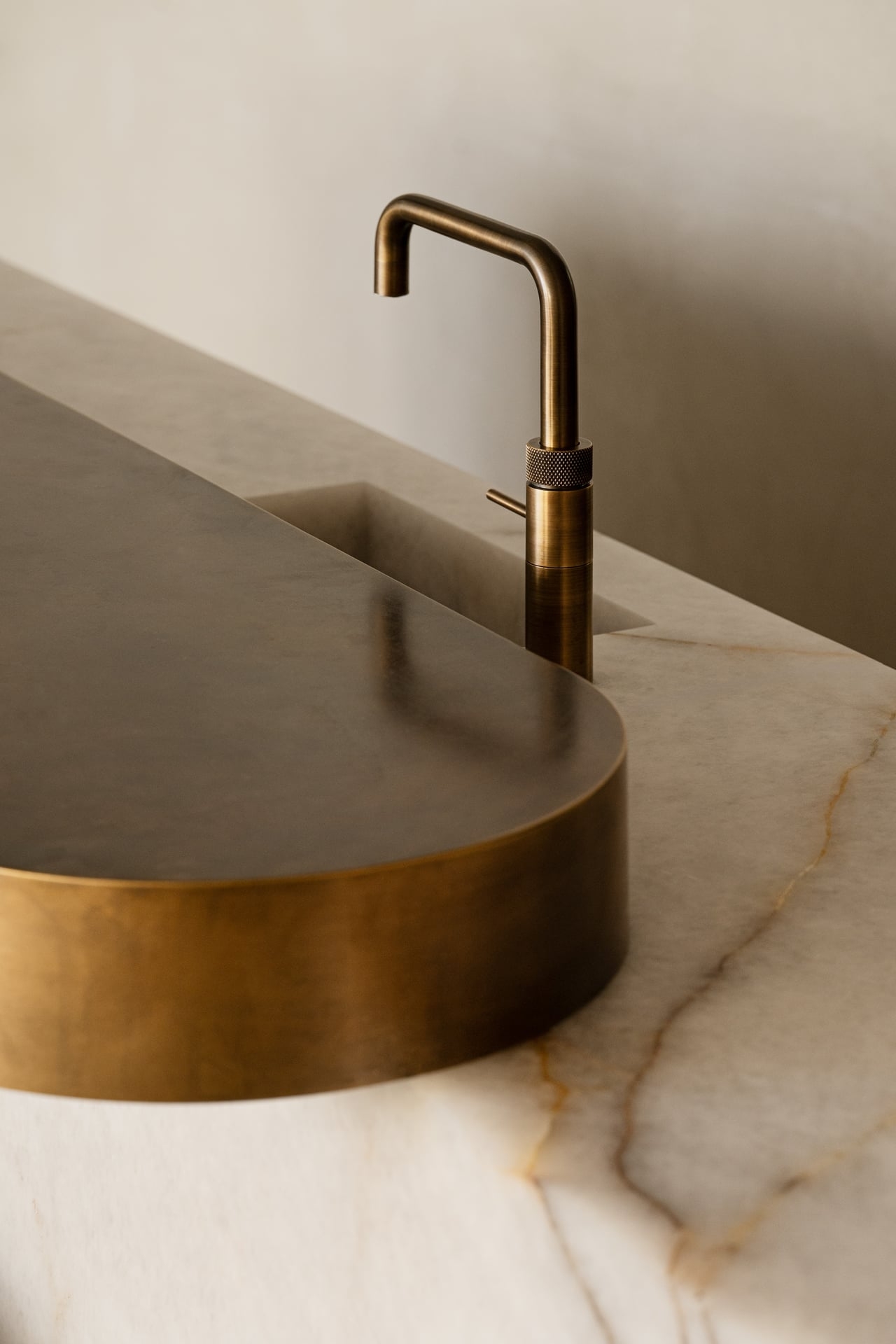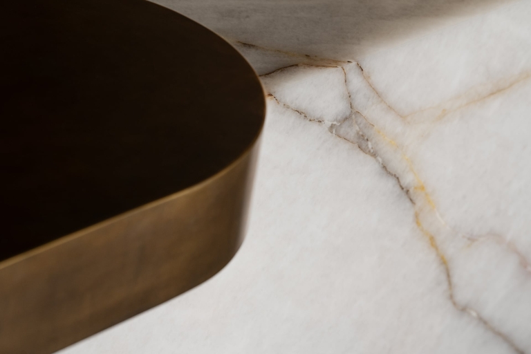 The central element is the imposing counter made of natural stone with a brushed metal top, which runs across the room, intersecting different areas and cleverly concealing the back office, bar and storage space.