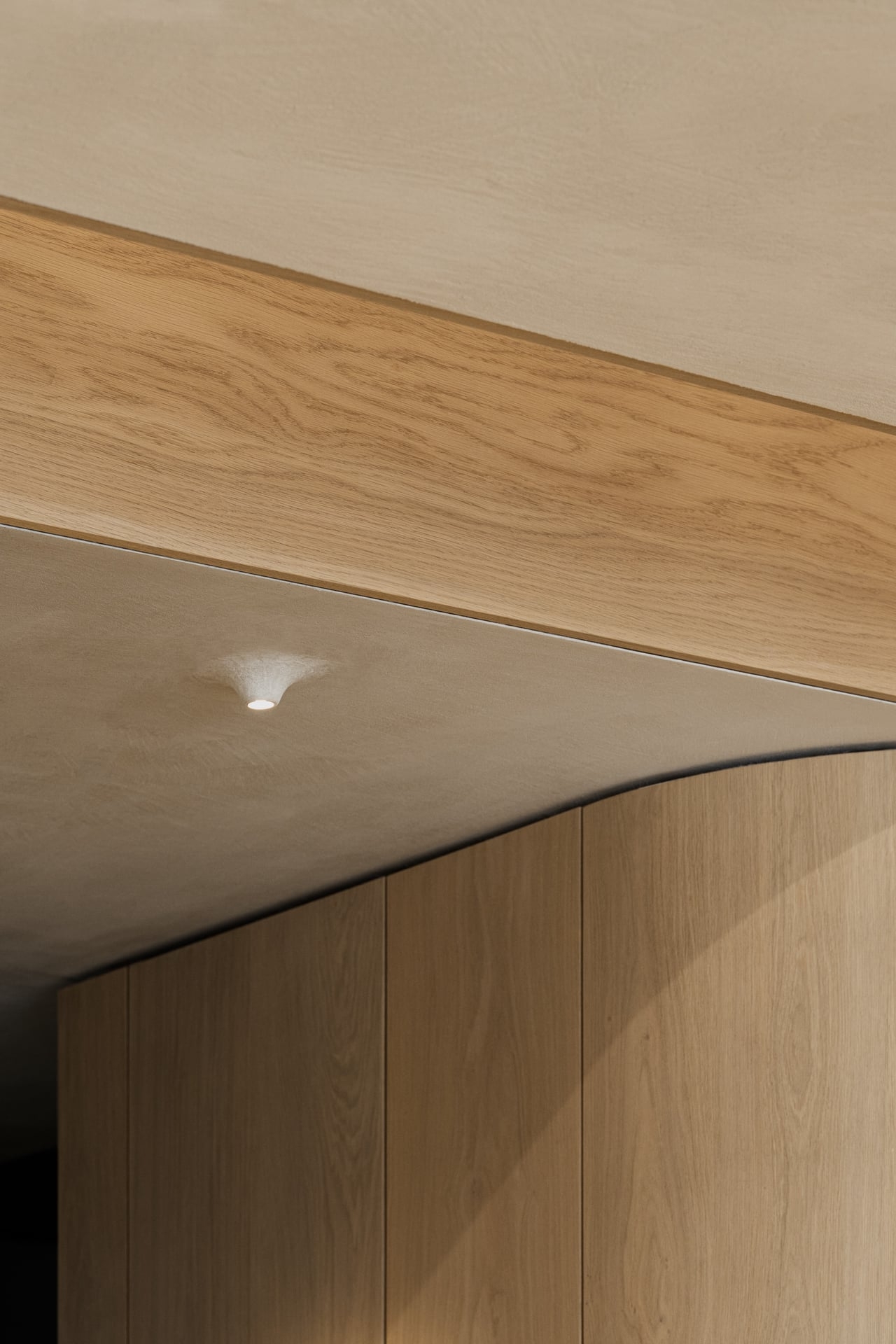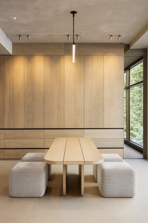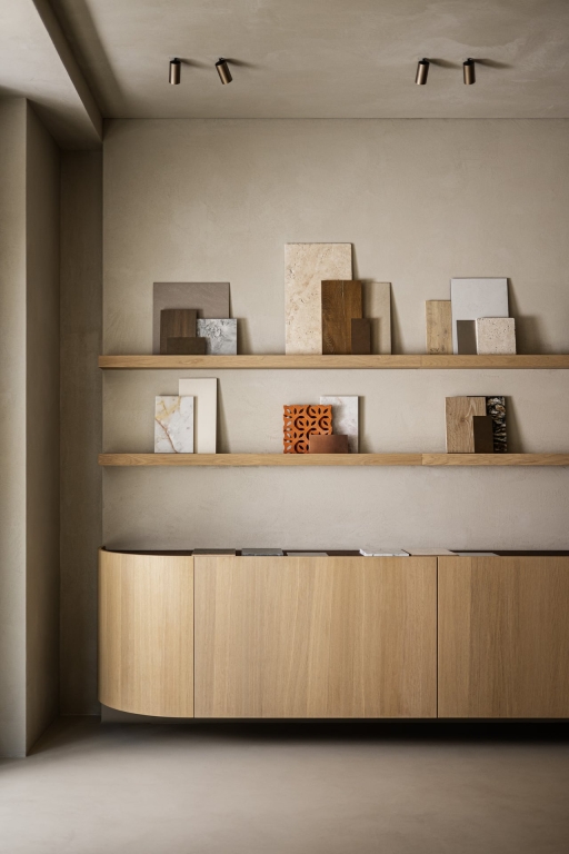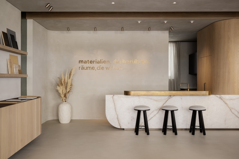 Our creative premise was to consciously curate the material possibilities in their interior design and to "whet the appetite for more" with a selection of materials instead of displaying everything the company has to offer in a colorful patchwork quilt. To give the plain space more excitement, the interior designers have constructed supposed skylights with mirrored ceiling cut-outs. These architectural breaks provide dramatic lighting and give the room its stage-like character. The products are not displayed like in a store, but in the applied form of a lounge area.