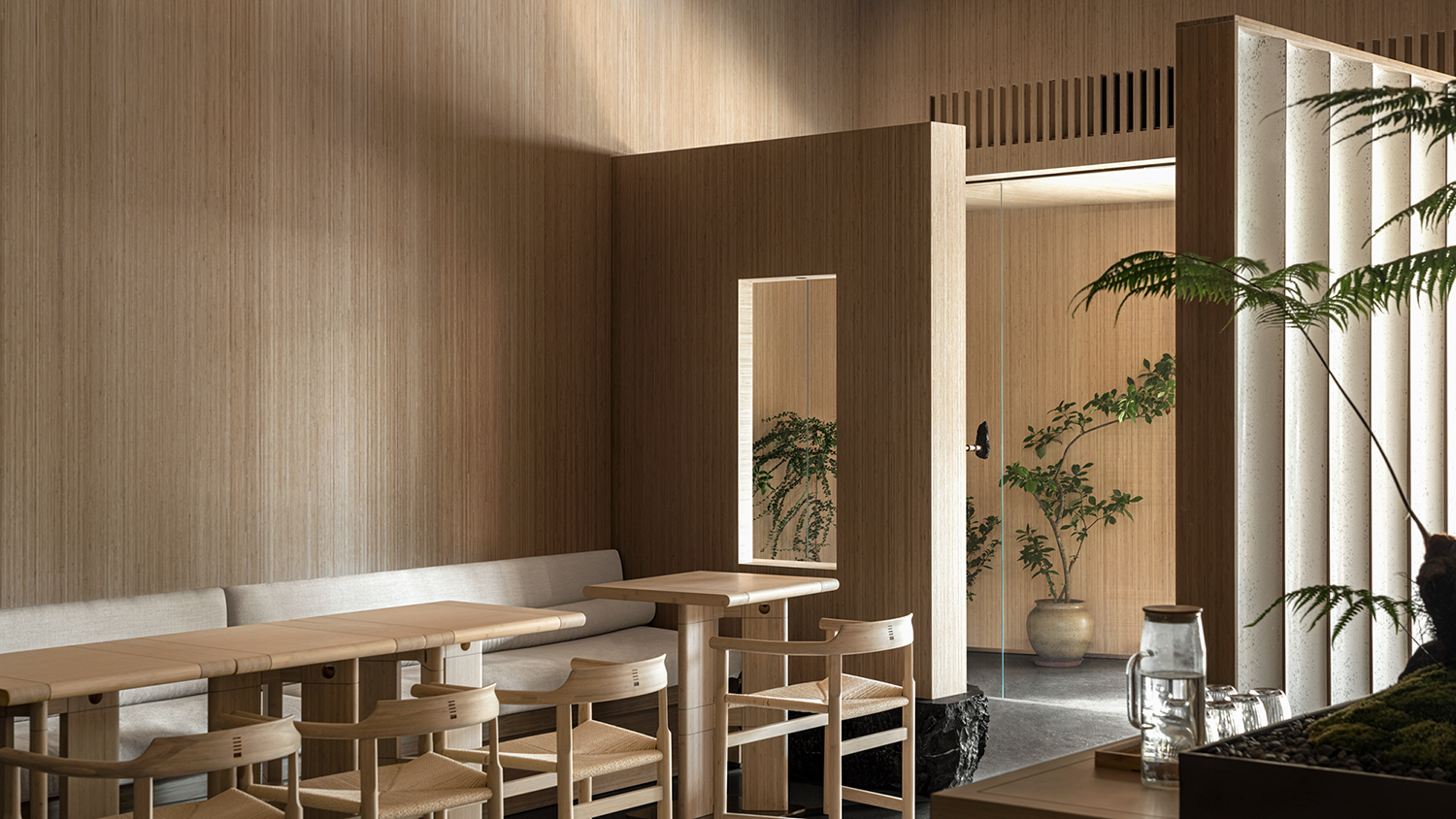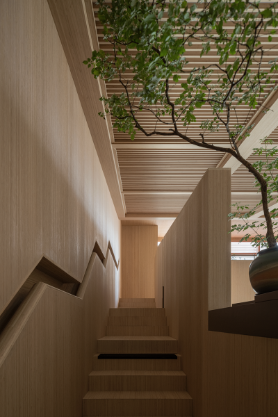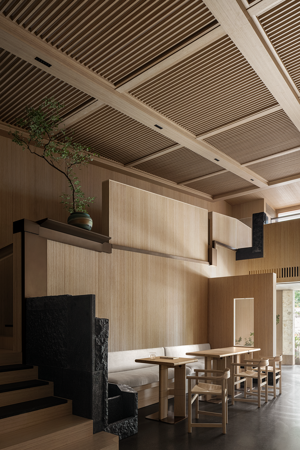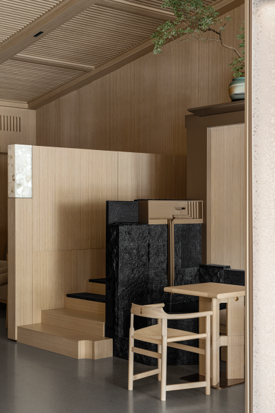 Drawing from traditional garden design, the space is carefully crafted to offer a dynamic, rich experience within a confined setting. Engineered bamboo veneers dominate the interior, chosen not only for their aesthetic warmth but also for their symbolic resonance in Chinese culture. The authentic textures of bamboo bring warmth and simplicity, while accents of jade and black stone create striking contrasts, adding depth and dimension.