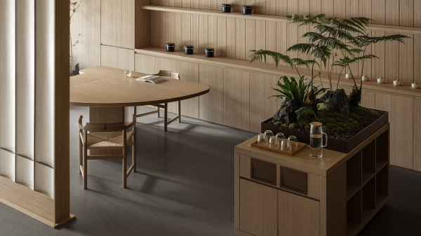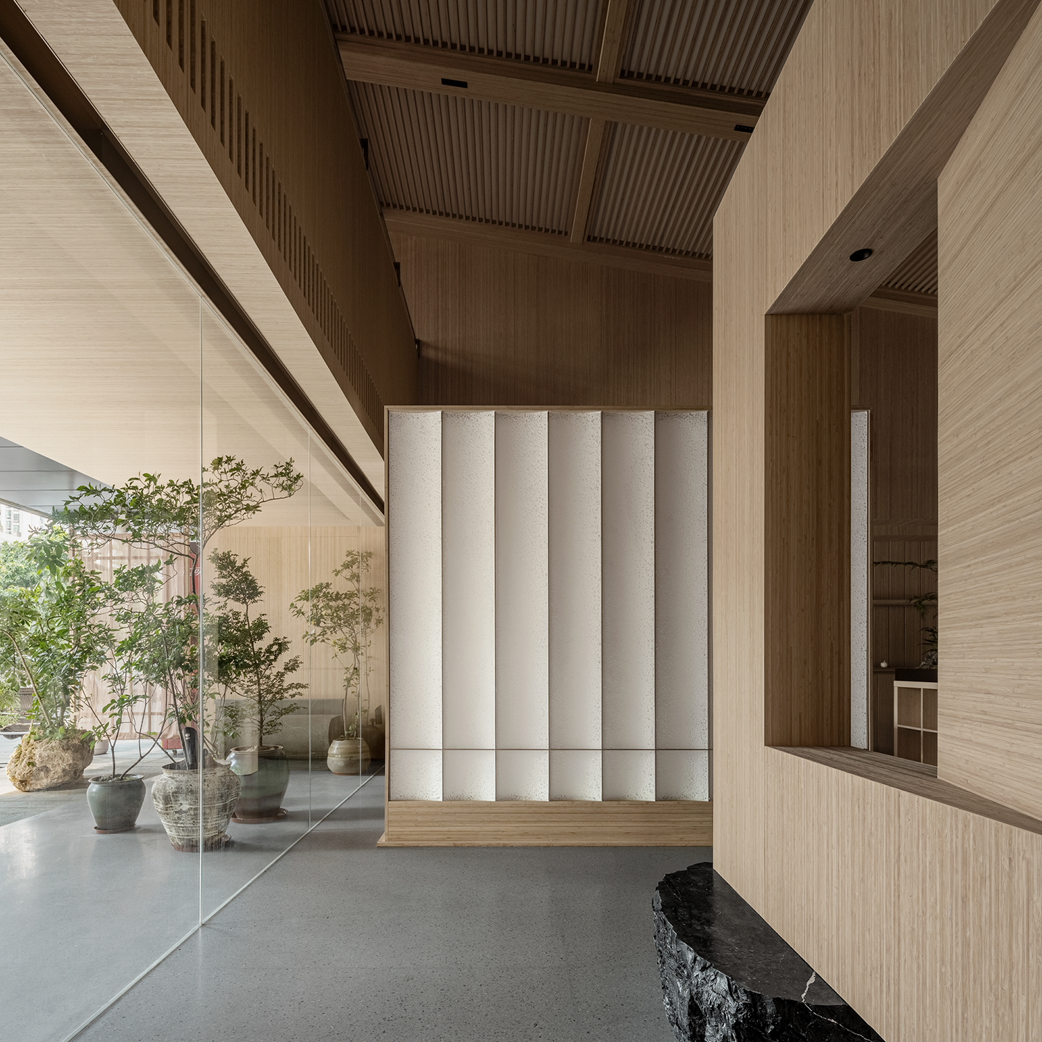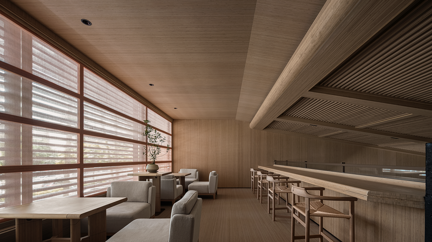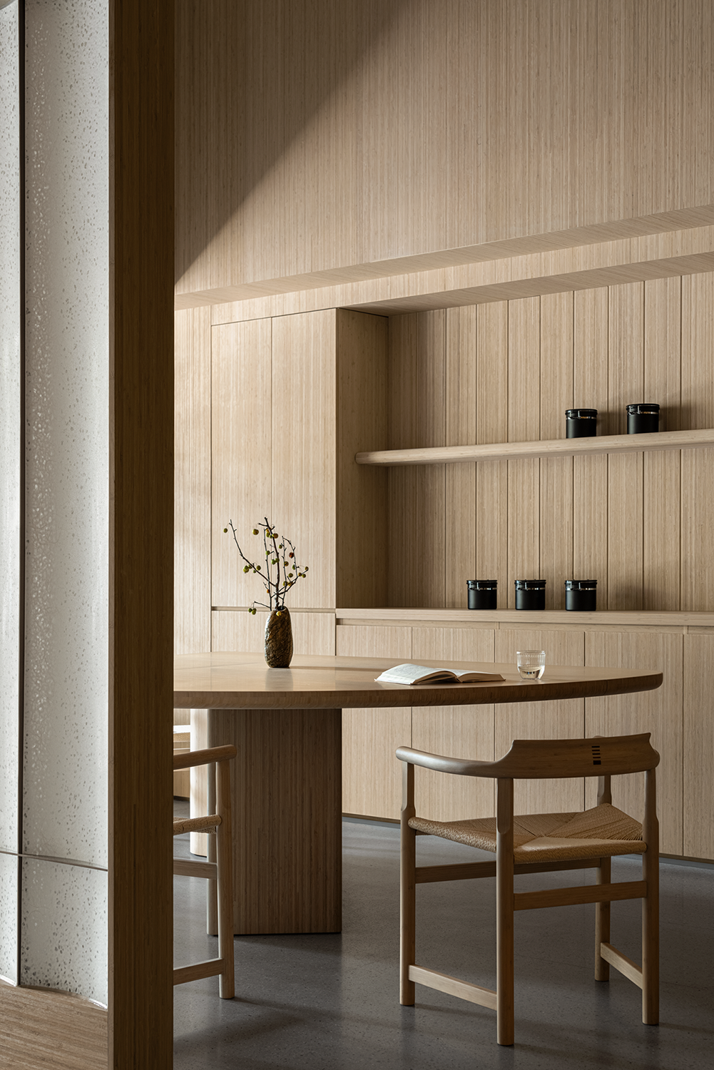 Drawing from traditional garden design, the space is carefully crafted to offer a dynamic, rich experience within a confined setting. Engineered bamboo veneers dominate the interior, chosen not only for their aesthetic warmth but also for their symbolic resonance in Chinese culture. The authentic textures of bamboo bring warmth and simplicity, while accents of jade and black stone create striking contrasts, adding depth and dimension.