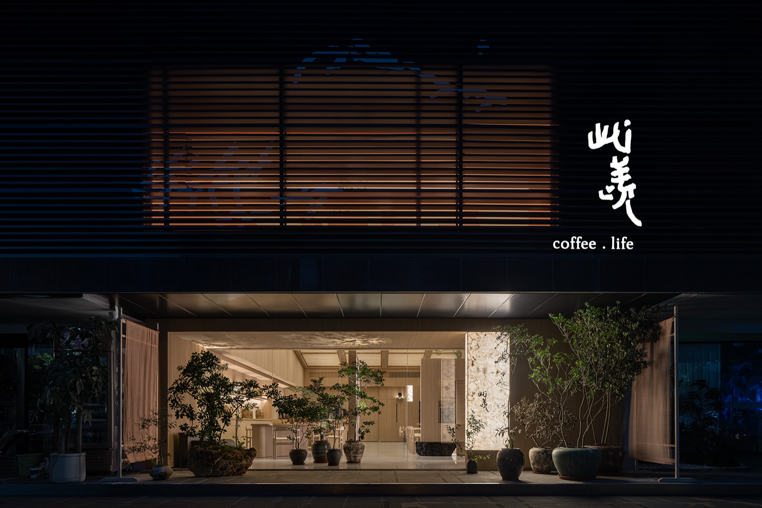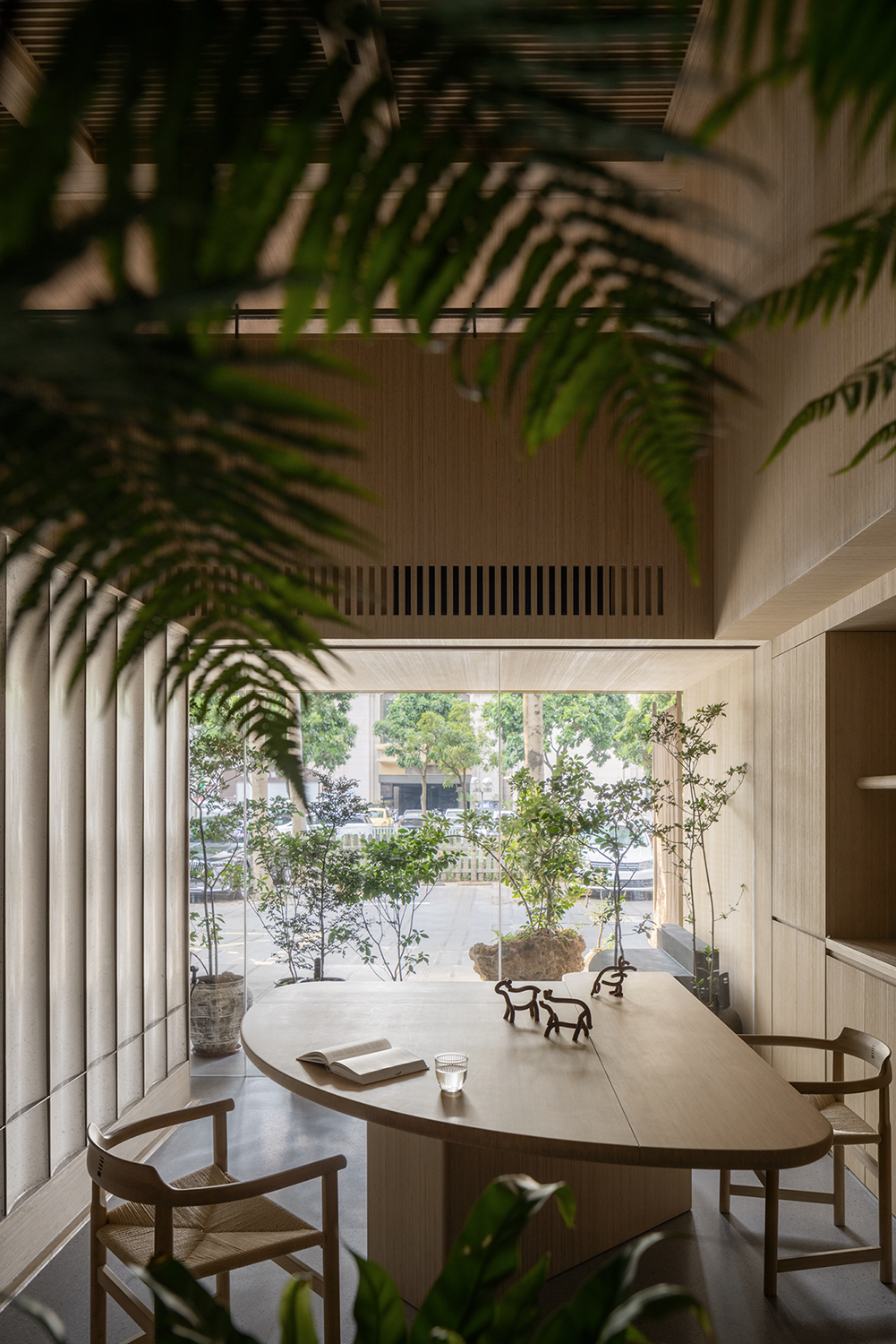The entrance, recessed from the street, opens into an expansive resting area, blending private and public environments in harmony. Lush greenery surrounds the entrance, evoking the serenity of forests, subtly veiling the café within.