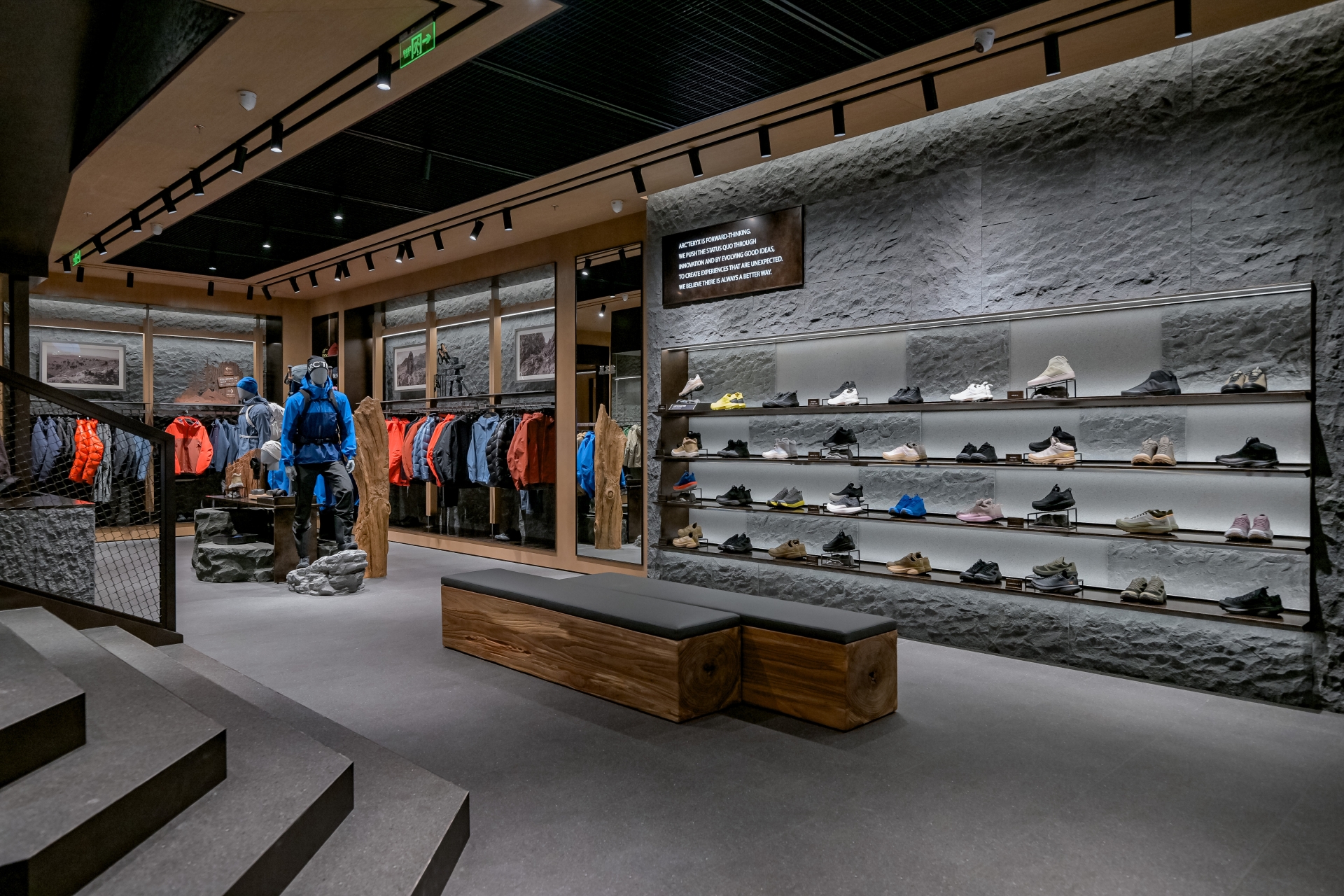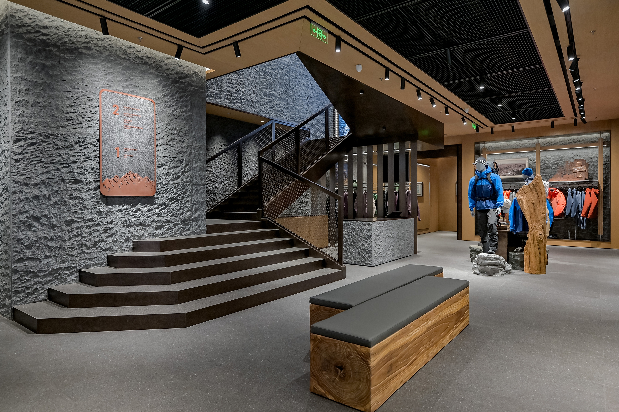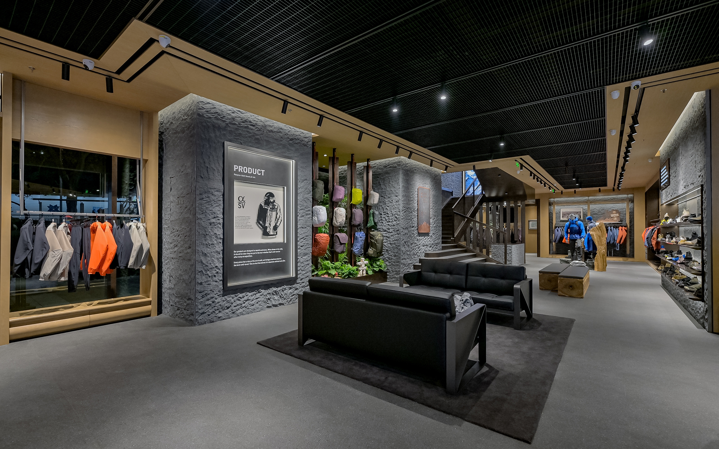 The interior evoke a rugged alpine atmosphere through natural materials: Climbing-rope display racks, a mountain-shaped service counter, and imagery of North American peaks create an immersive "mountains refine the self." experience. Through revitalized craftsmanship and material dialogues, the space achieves a harmonious symbiosis of nature, culture, and commerce.