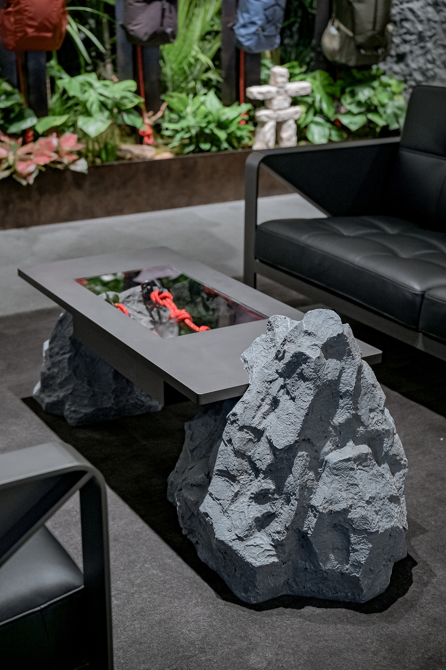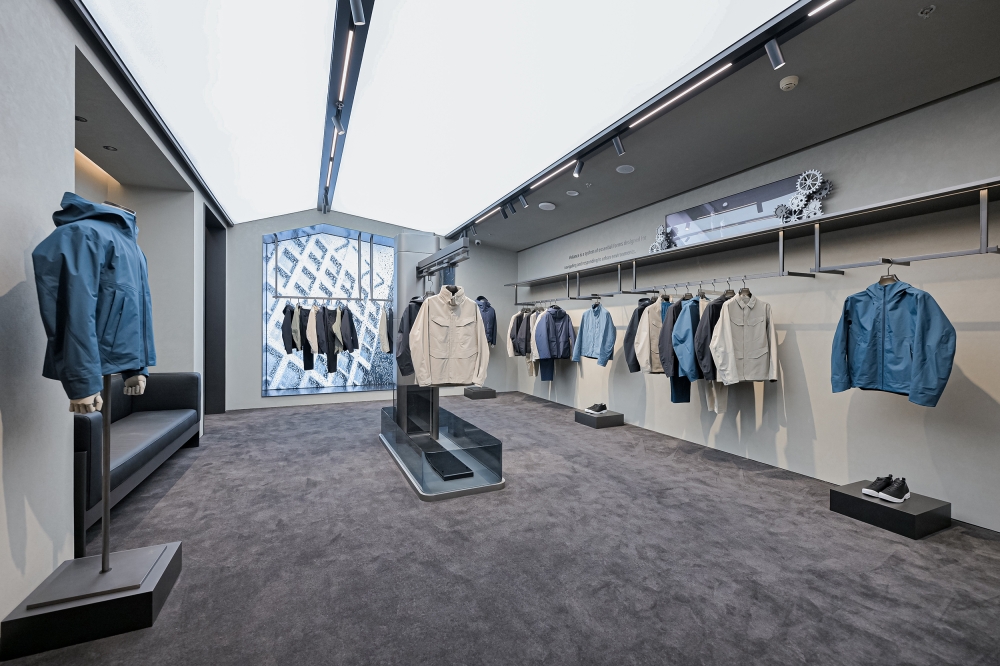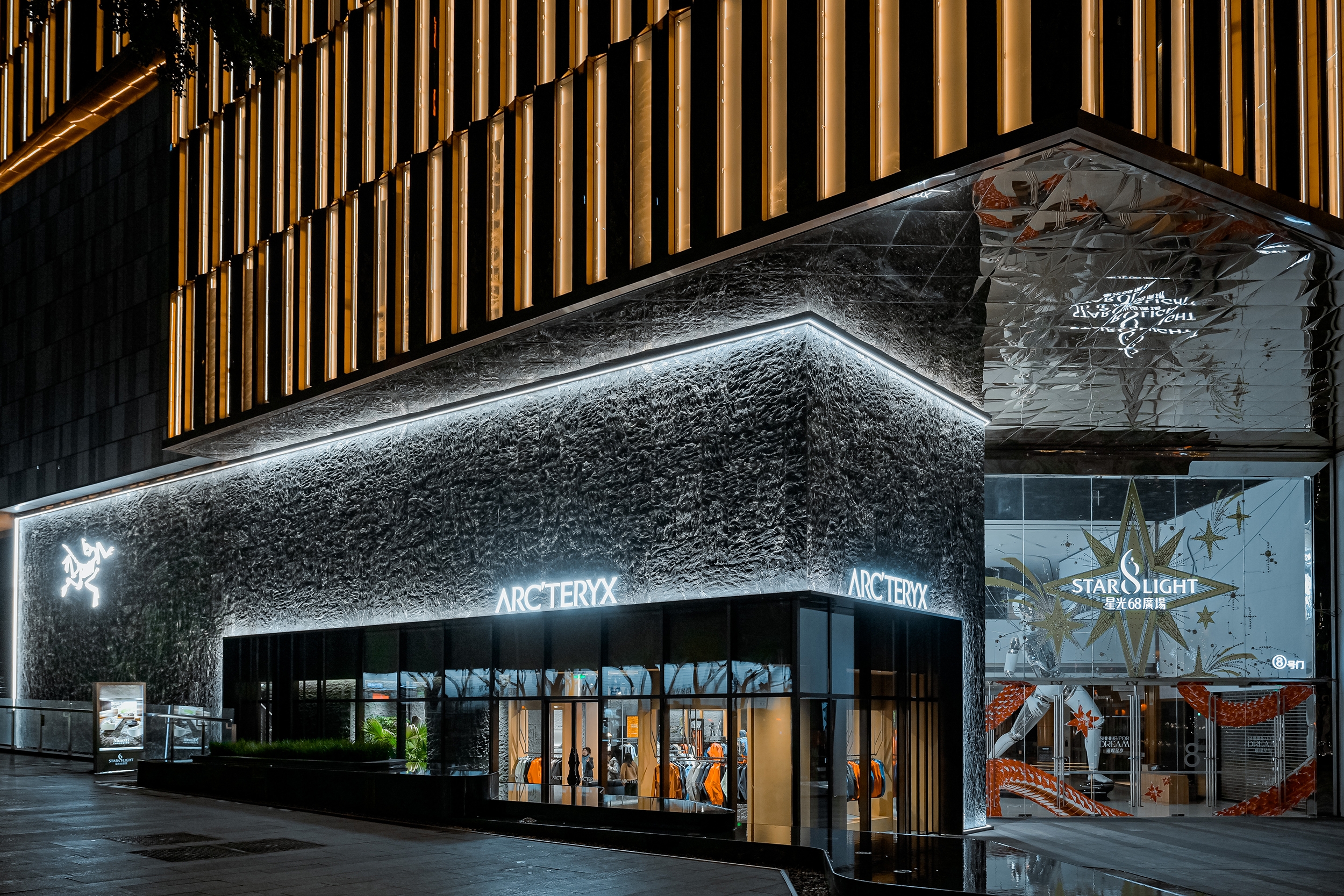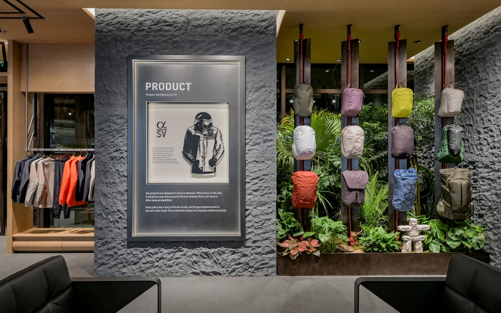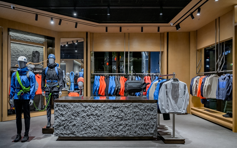 The exterior features a striking three-dimensional rock texture, echoing both the raw power of North America’s coastal mountains—the birthplace of Arc’teryx—and the undulating terrain of Chongqing’s undulating "mountain city" landscape.