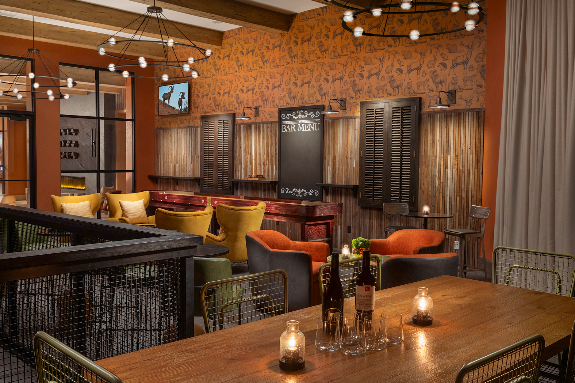The Lobby Bar provides a lively social hub with soft lounge seating, craft cocktails, and shuffleboard, while the Bar & Grill serves up hearty, all-American comfort food in a relaxed, nostalgic setting. The Guestrooms are inspired by the modern camping style, offering a sophisticated retreat with nature-infused details, bold accents, and a serene atmosphere—your perfect base camp for exploring Zion and beyond.