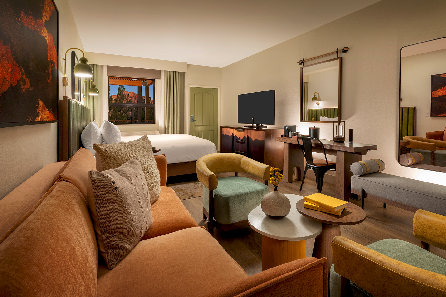 Set in a prime location just steps from the entrance of the beautiful Zion National Park, this destination hotel is designed to capture the adventurous spirit and breathtaking beauty of its surroundings. Blending contemporary comfort with rugged elegance, it offers an immersive experience that makes every stay feel like an extension of the park itself.