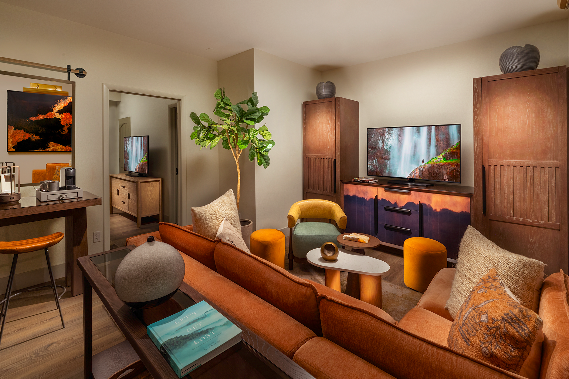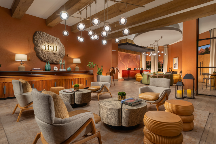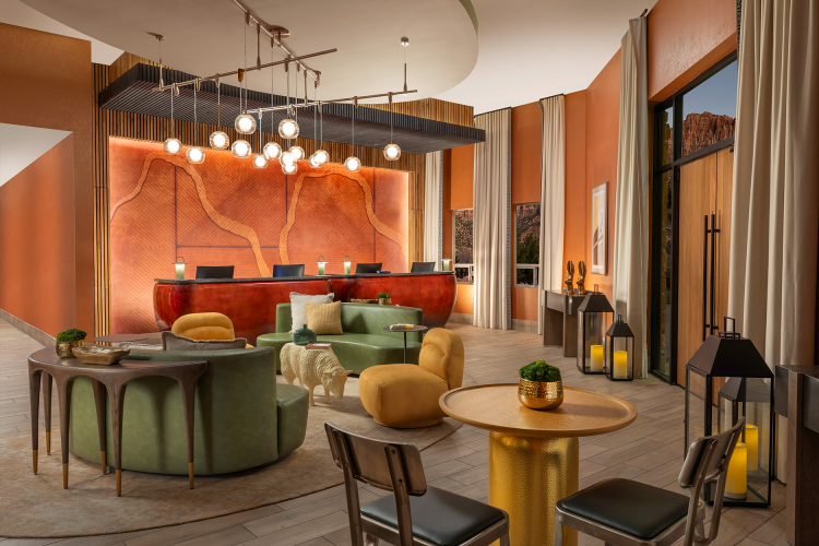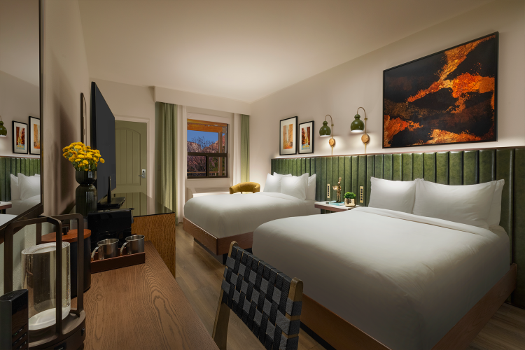 Inspired by the essence of hiking, biking, and camping, the property is a haven for nature lovers and explorers. At its heart is the Lobby “Campsite,” a vibrant yet cozy gathering space reminiscent of a campfire, where guests can relax, reconnect, and share their adventures. Thoughtful design elements, like a weathered front desk echoing the park’s wind-brushed rock formations, evoke curiosity and tranquility.