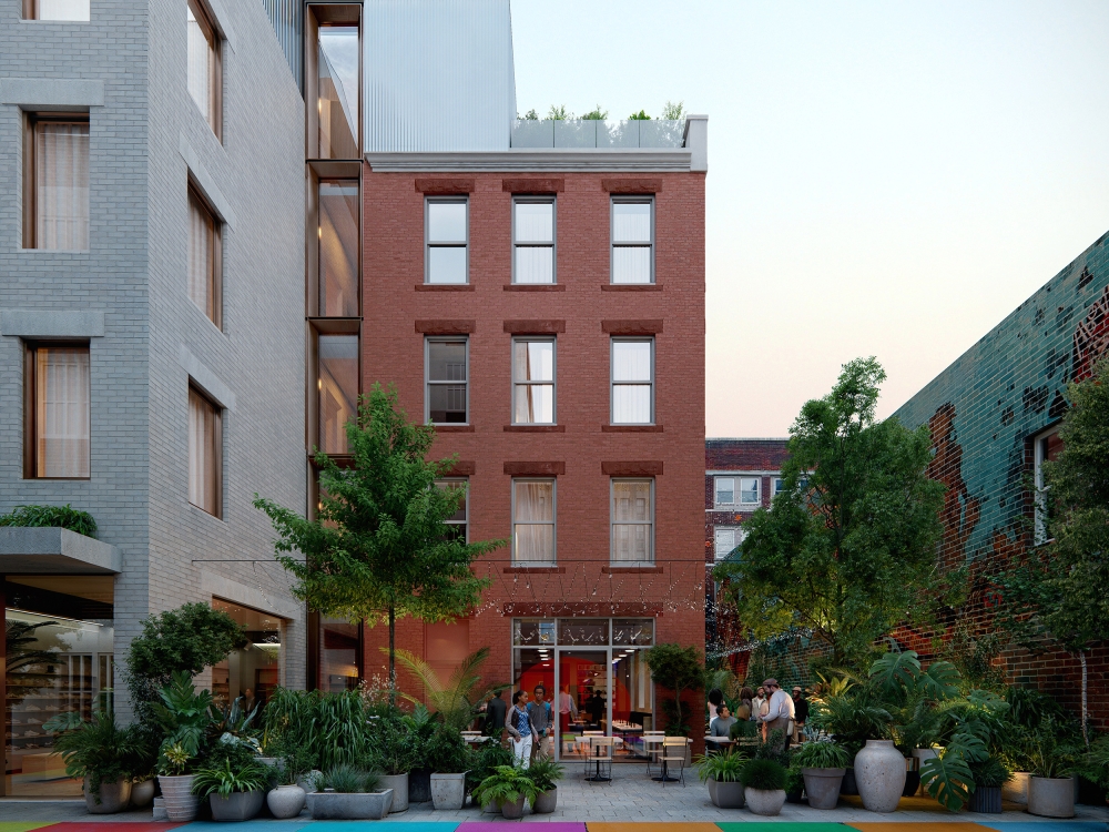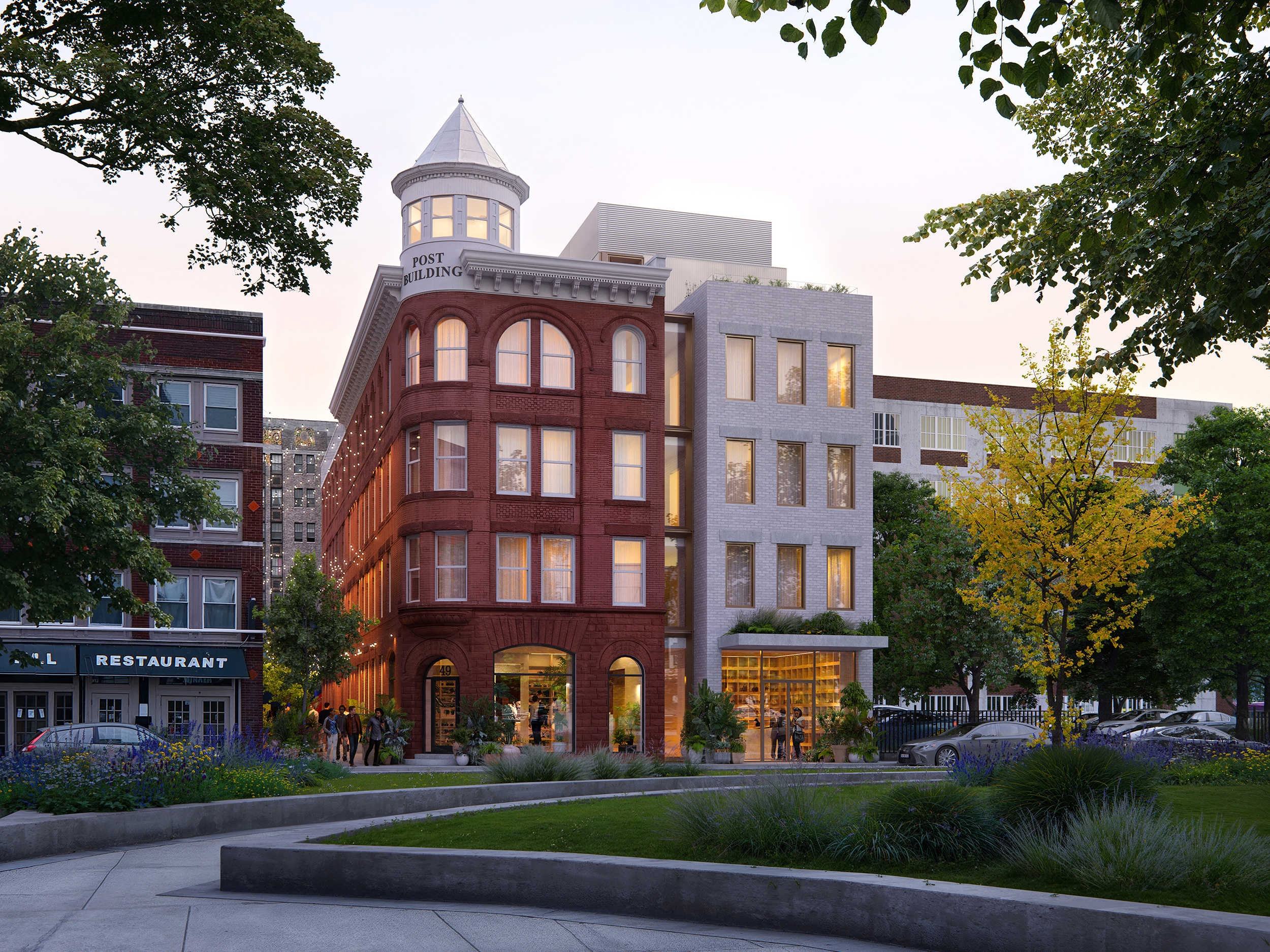 The Post Hotel rehabilitates a historic building in downtown Bridgeport, Connecticut, and marries it with a ground-up, modern addition to create a dynamic, 36-room boutique hotel. The design juxtaposes the classical, c. 1892, red brick edifice with the minimally embellished, light brick façade of the similarly scaled companion building. While there’s a dynamic tension between the buildings’ complementary styles, each retains its own presence and design integrity. A massive plate glass window under a landscaped canopy at the front of the new, five-story tower relate in scale with the tall, arched windows of the Post building. A glass gasket connects the two structures, marking the nexus of old and new and serving as the central artery of the hotel’s interior plan. Ground-floor retail and restaurants, a lower-level speakeasy, and a rooftop terrace/bar on the new tower will complete the 27,252-square-foot hospitality destination that will open in 2026.