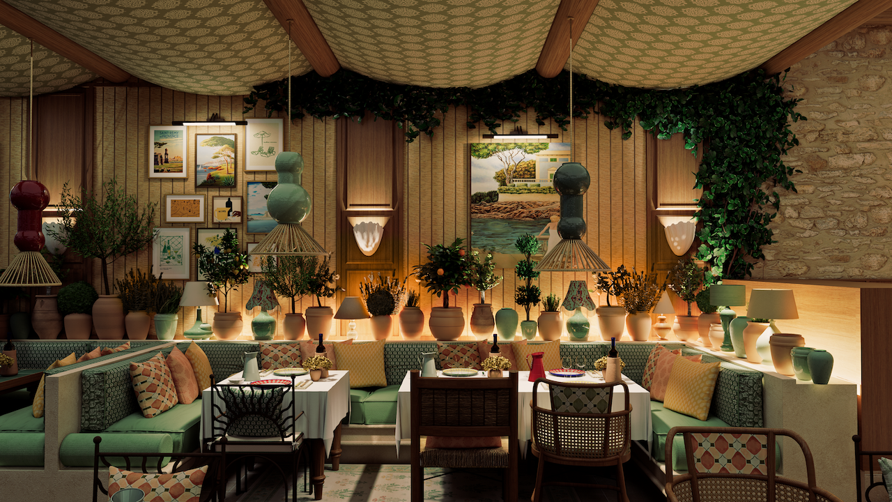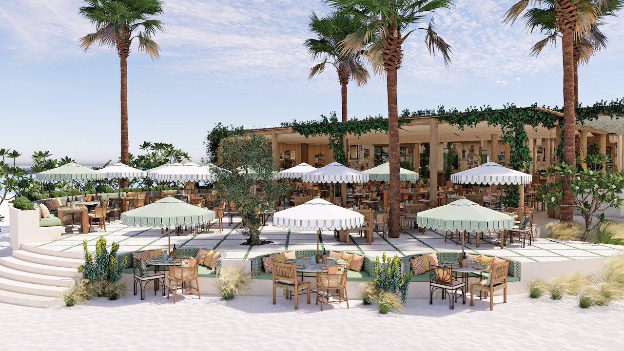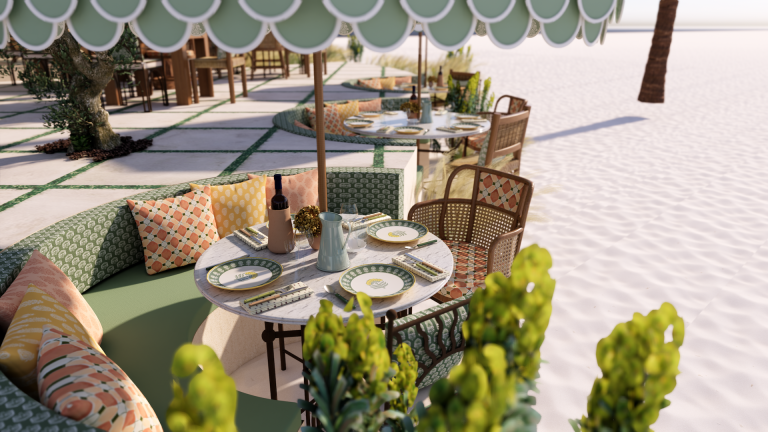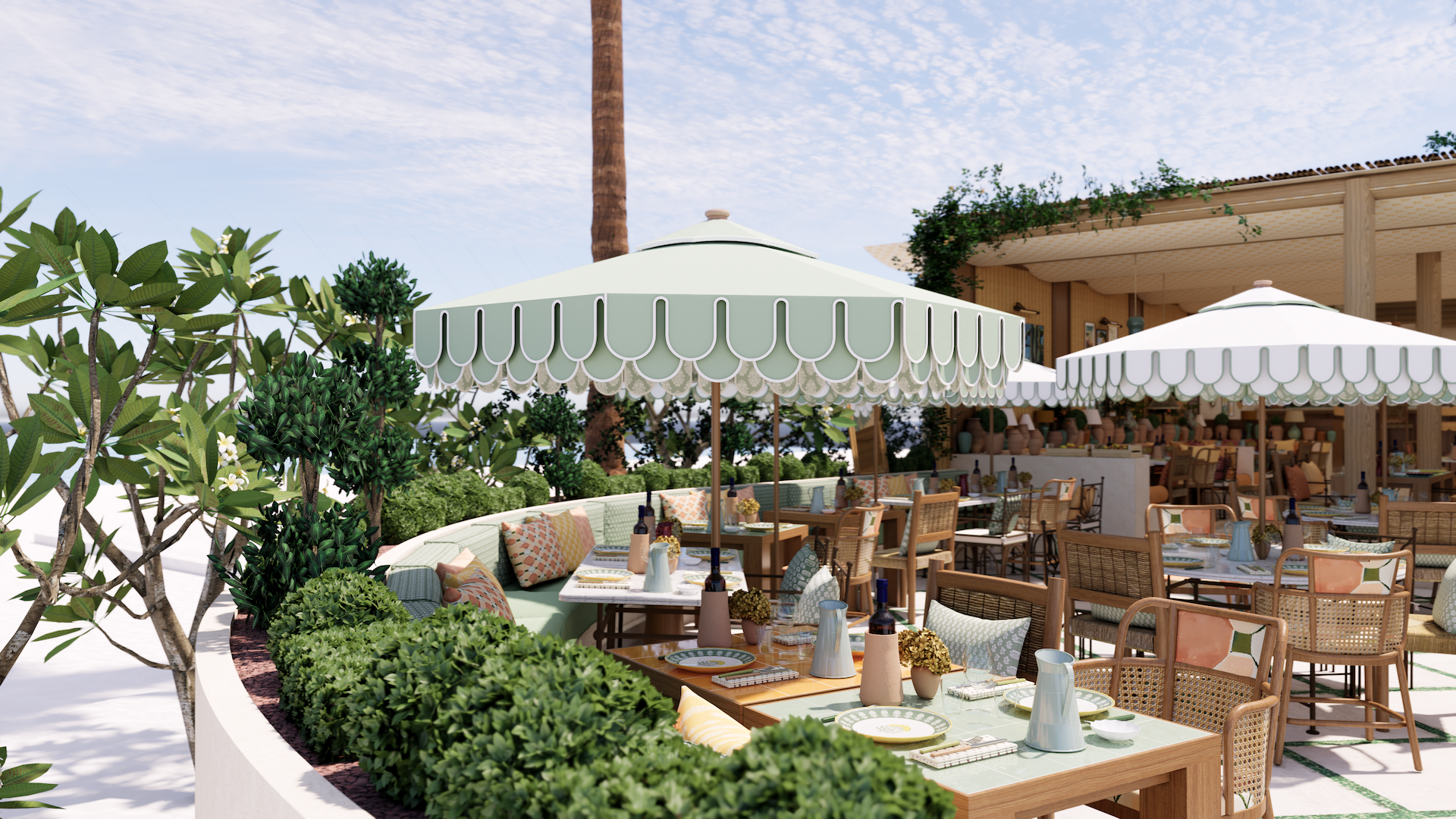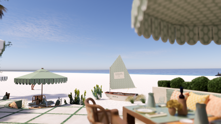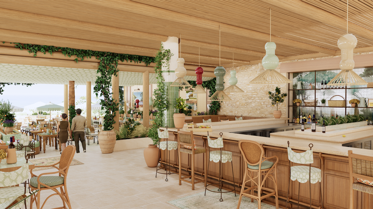 Outside, scalloped parasols and mosaic flooring bring rhythm to a terrace, where rattan chairs and built-in booths invite long lunches and lingering moments. From the patinated piano in the corner to the anchored sailboat visible just beyond the deck, every element contributes to a cohesive story. The result is immersive & transportive, a place designed not as a set piece, but as a living home by the sea.