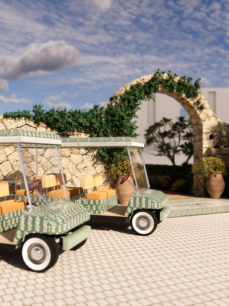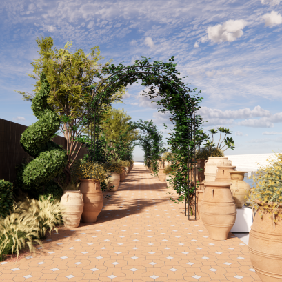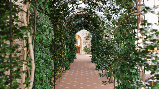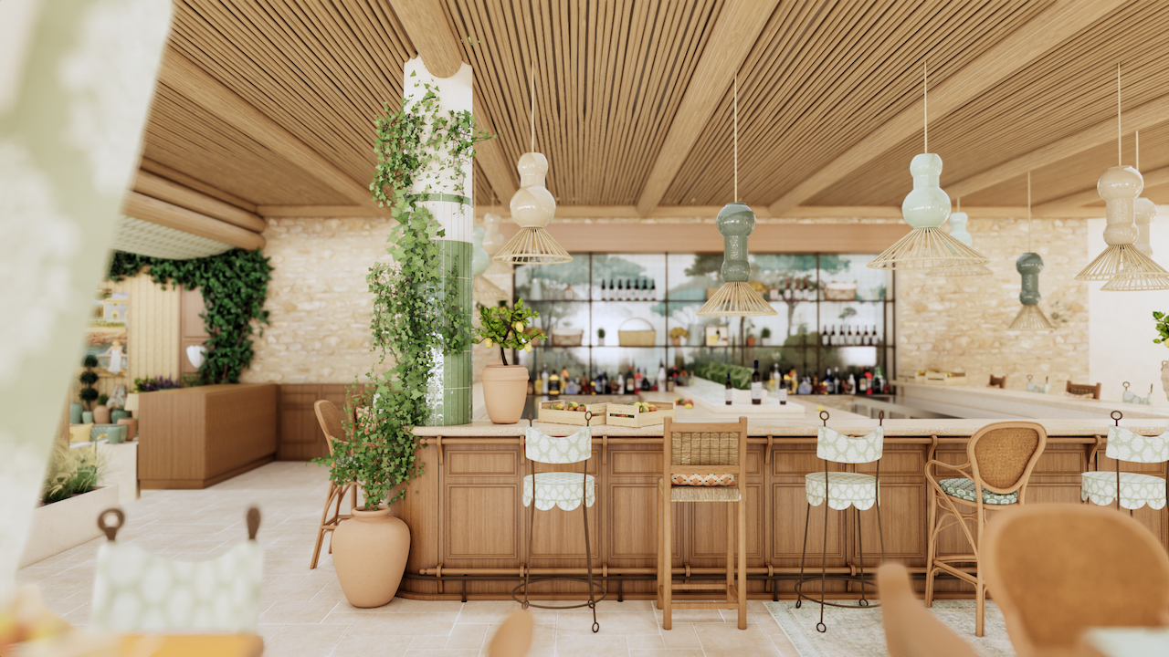 The dining room unfolds as a series of layered environments: vaulted ceilings, arched portals framing sea views, curved banquettes, and hand-tiled tables. Light filters through linen sheers and vines, softening the structure without losing its form. An oak bar anchors the space, framed by ceramic pendants and antique mirrors.
