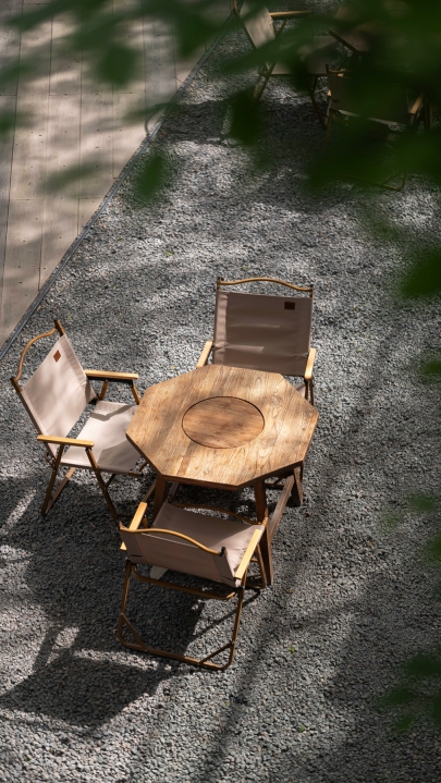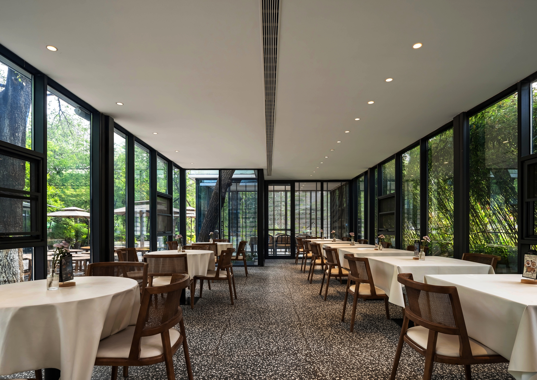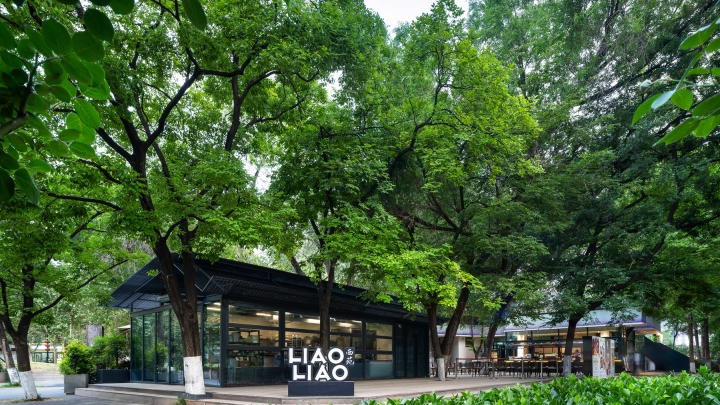LIAOLIAO Café is a semi-sunken café and dining pavilion located in Luoyang’s Xiyuan Park - an urban forest in one of China’s historic capitals. The project responds to the site’s natural and civic setting through minimal, precise intervention. A radial layout organizes coffee, tea, Western dining, and bar zones around a central courtyard, creating fluid circulation and varied atmospheres.