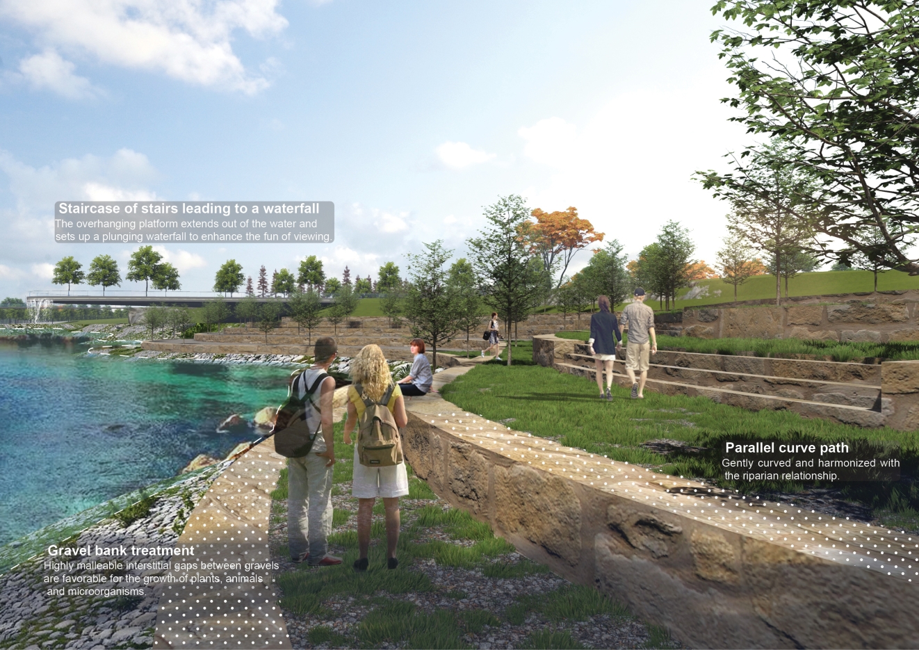 Return to the Riverbank restores and expands the concept of the riverbank to include healthy bio-filtered stormwater tributaries connected to the river, transportation and information flows, flows of people, capital, and green revenue sources. We aligned the renewal of the Littoral Est riverfront with municipal needs to develop a green economy, provide jobs, provide a healthy environment for the community and improve the ecological health of the St. Lawrence River.
