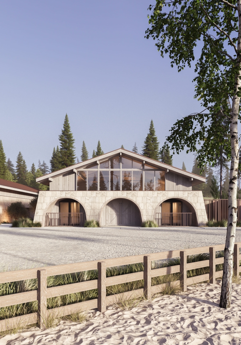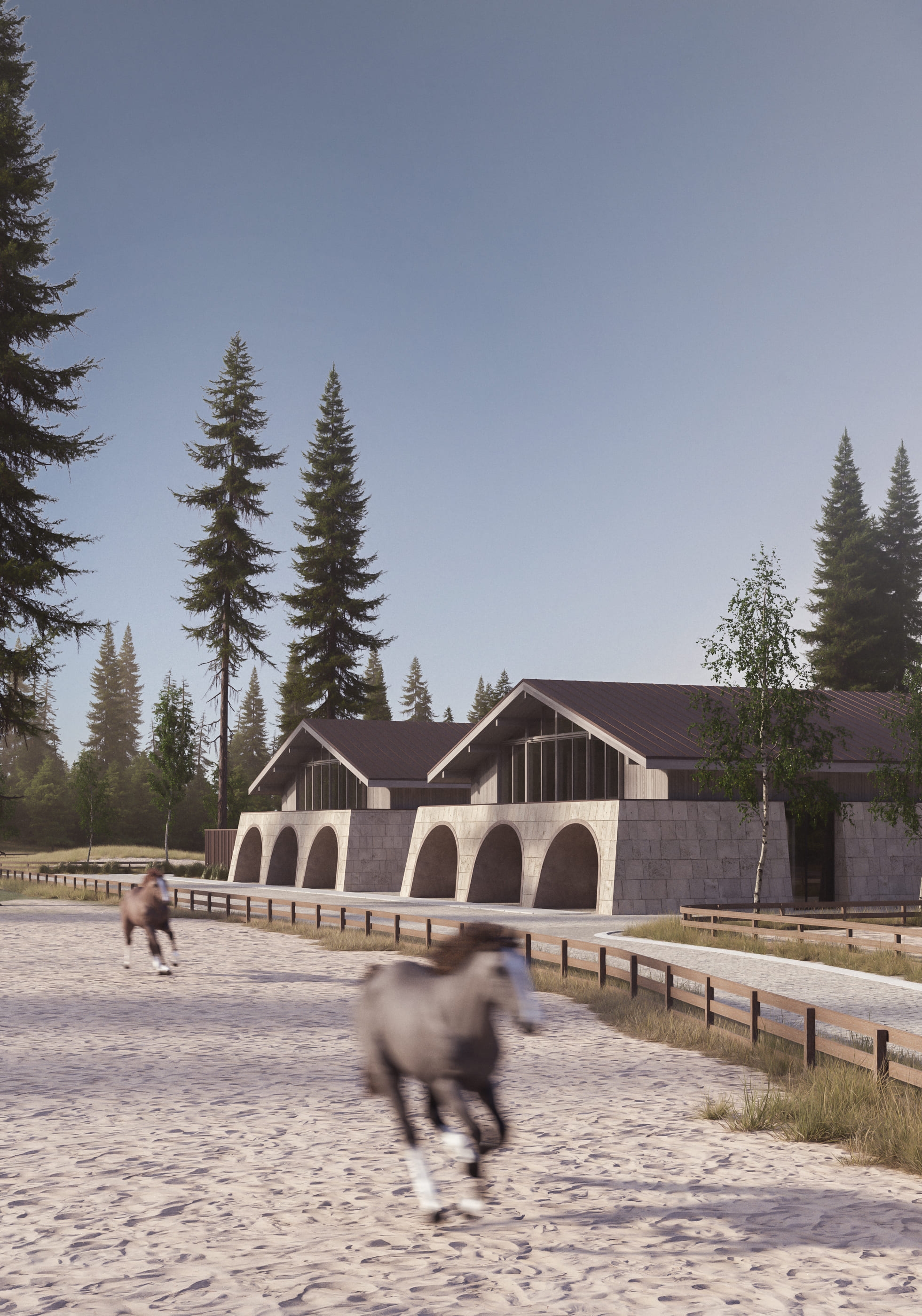 The layout is divided into two wings: one for horses, one for dogs. A central sunken lobby connects them and introduces natural light into the lower level, which hosts public and educational functions: donation-based retail, classrooms, flexible workspaces, and private adoption rooms. These zones support community engagement while enabling sensitive first encounters between animals and adopters.