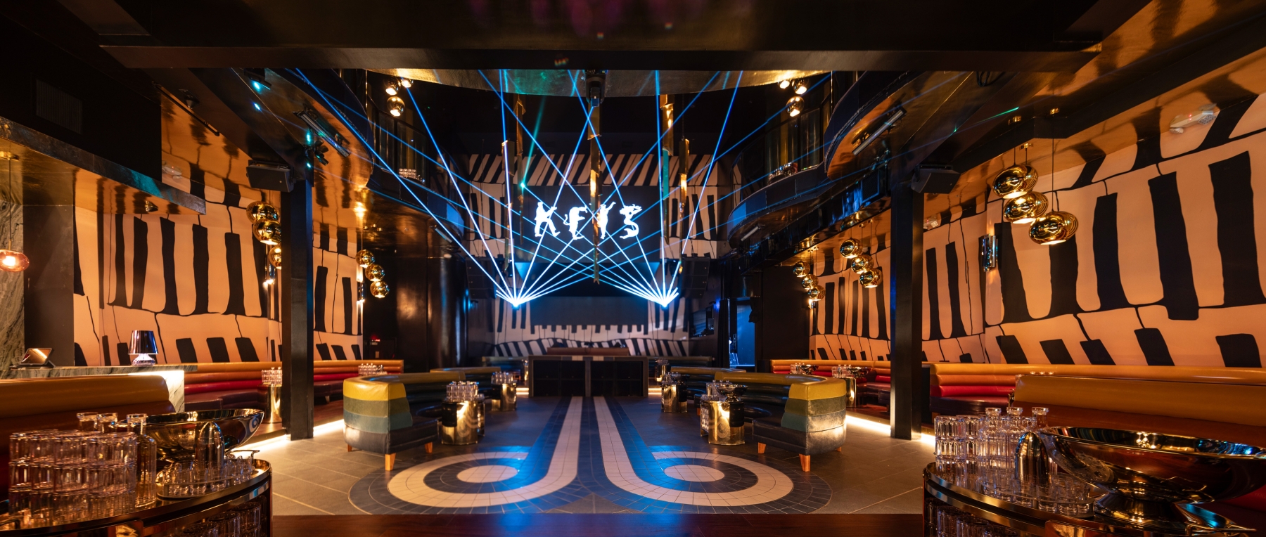 An iconic element of Keys is the large-scale, theatrical piano keys wallpaper. Seen throughout the space, it creates an immersive experience for the guests.The LED screen at Keys is a large folded plane that drapes over the DJ booth in the main room. Super high res at 1.2mm, the magnetic LED panels enable insanely vibrant visuals throughout the night.