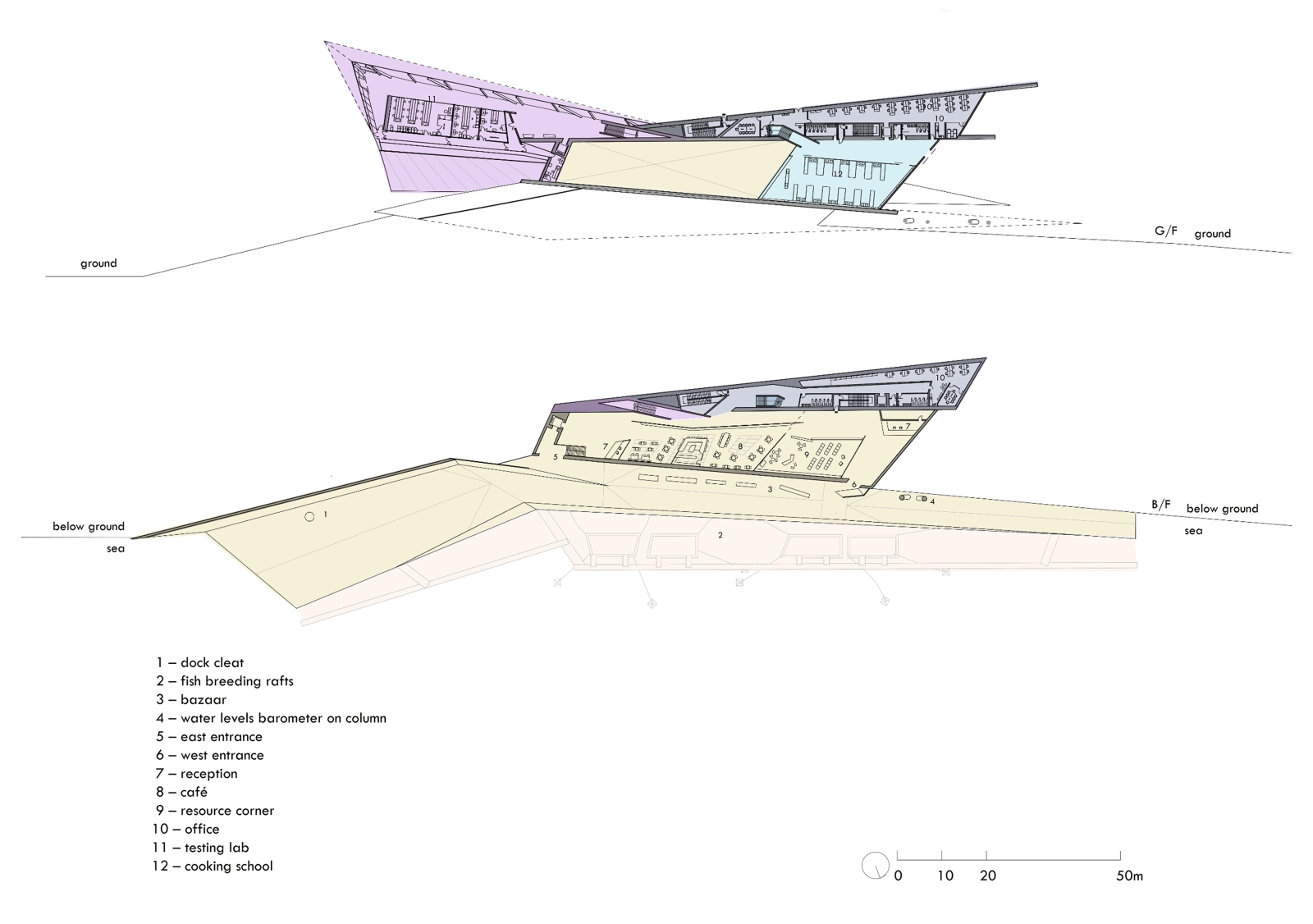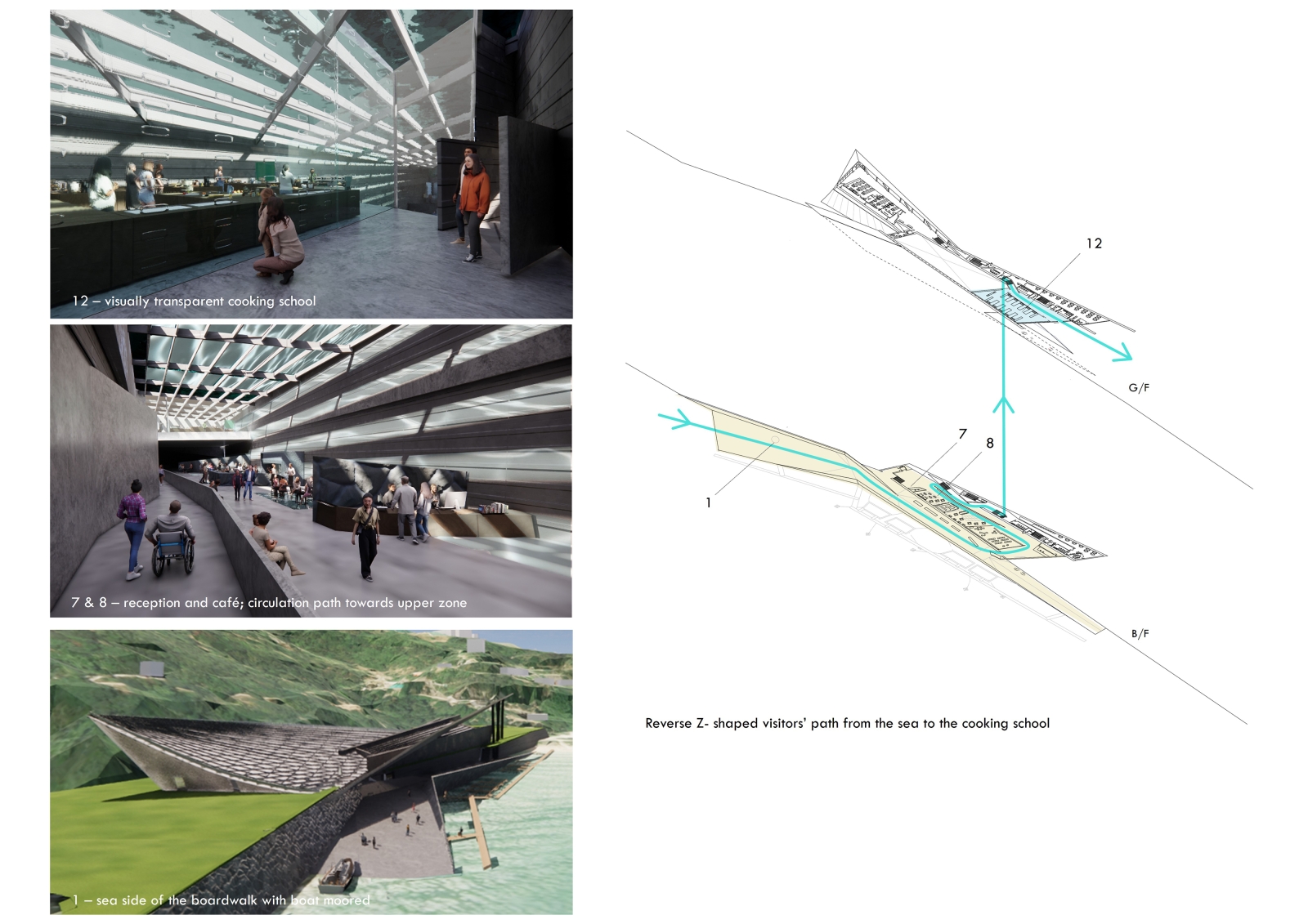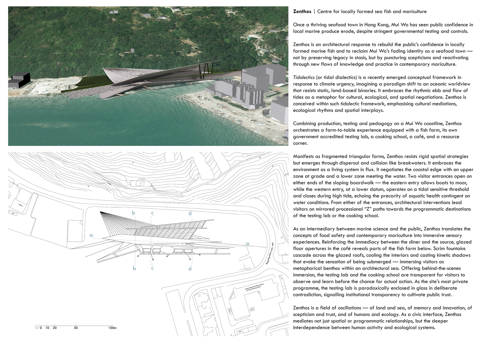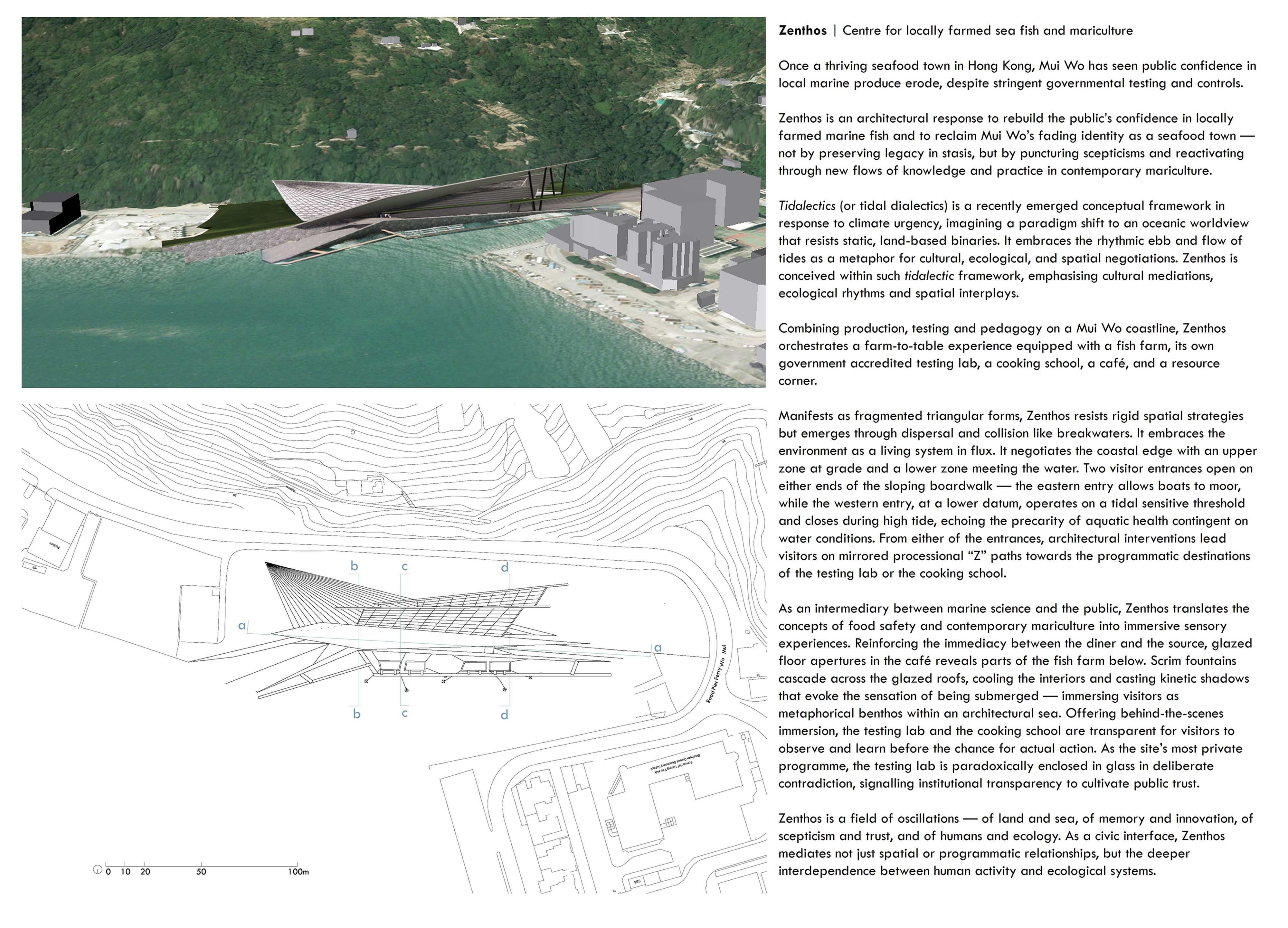 Combining production and pedagogy, Zenthos offers farm-to-table experience with fish farm, testing lab, cooking school, café, and resource corner. It embraces the environment as a living system in flux, mediating land and sea. One access allows boats to moor, the other closes at tidal threshold, echoing the precarity of aquatic health contingent on water conditions.