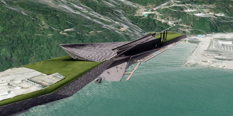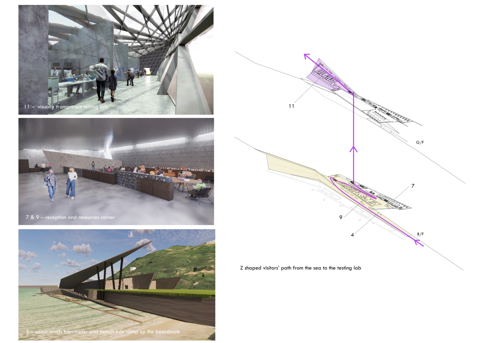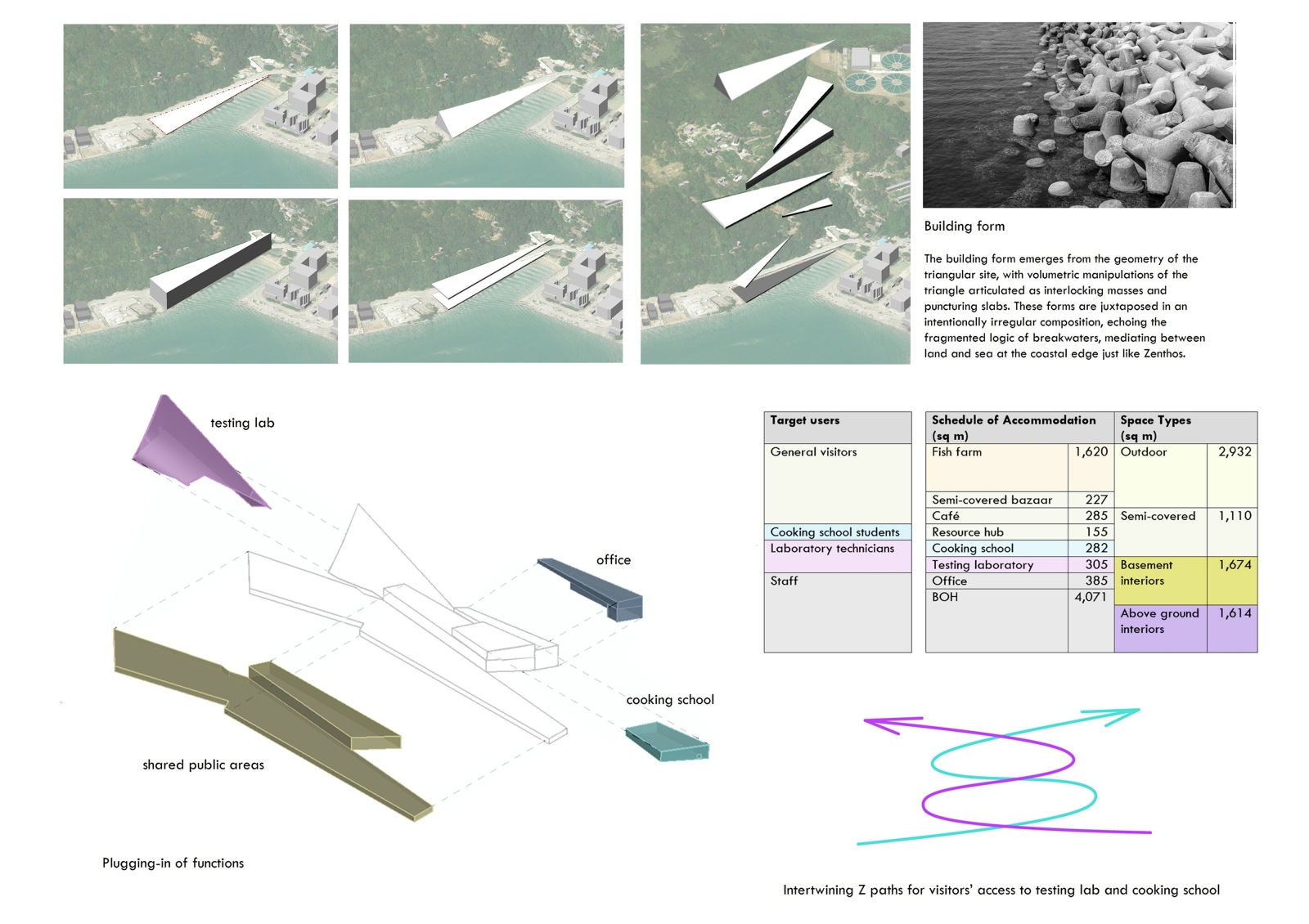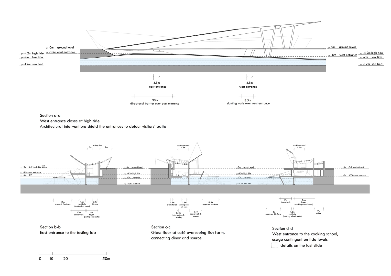 Combining production and pedagogy, Zenthos offers farm-to-table experience with fish farm, testing lab, cooking school, café, and resource corner. It embraces the environment as a living system in flux, mediating land and sea. One access allows boats to moor, the other closes at tidal threshold, echoing the precarity of aquatic health contingent on water conditions.
