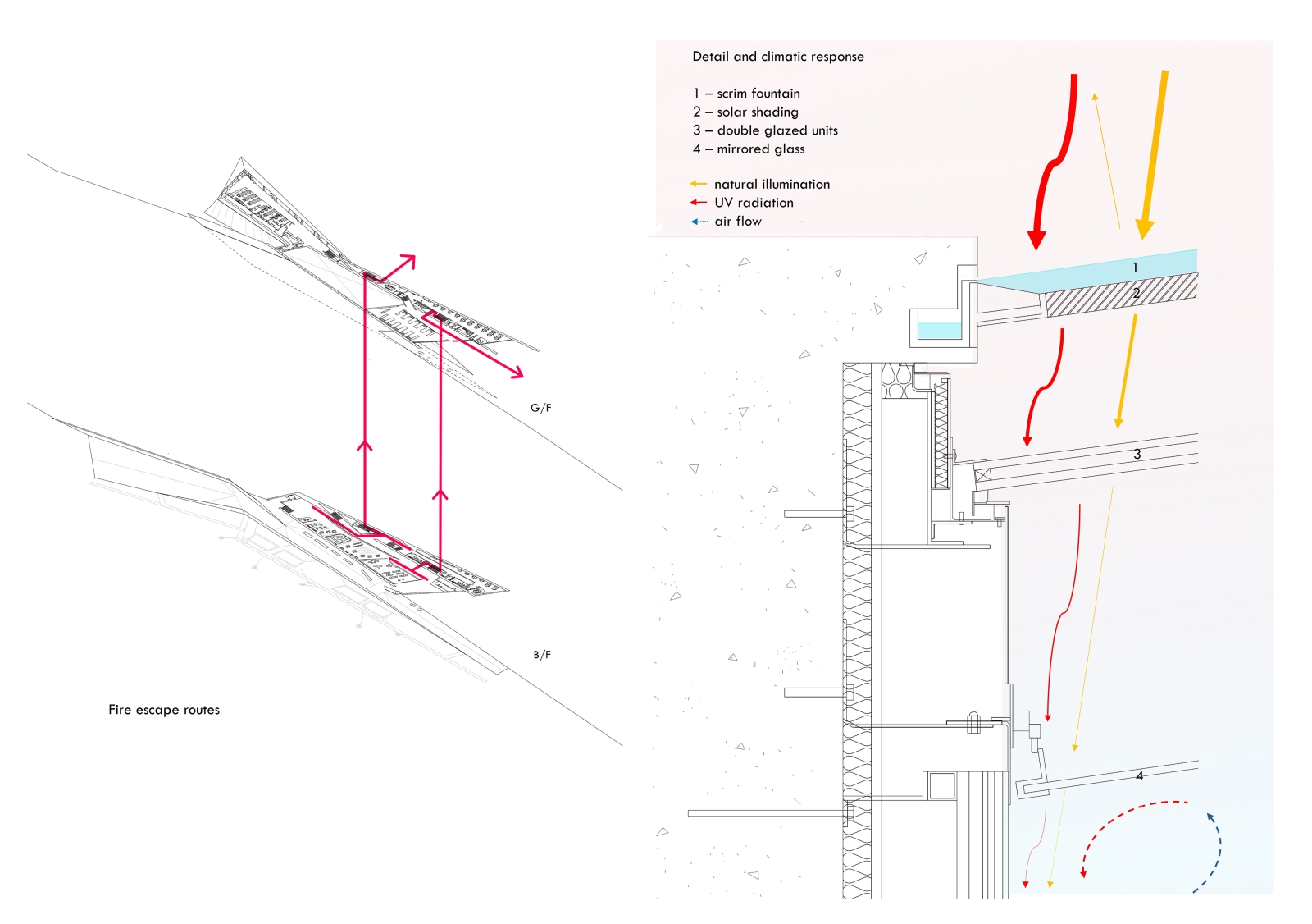 Zenthos translates marine concepts into immersive experiences. Scrim fountains on the glazed roofs cast dynamic shadows on visitors moving in mediated Z paths, evoking the sensation of being submerged as benthos in the sea. The private program of lab is ironically glass encased to signal transparency.