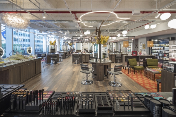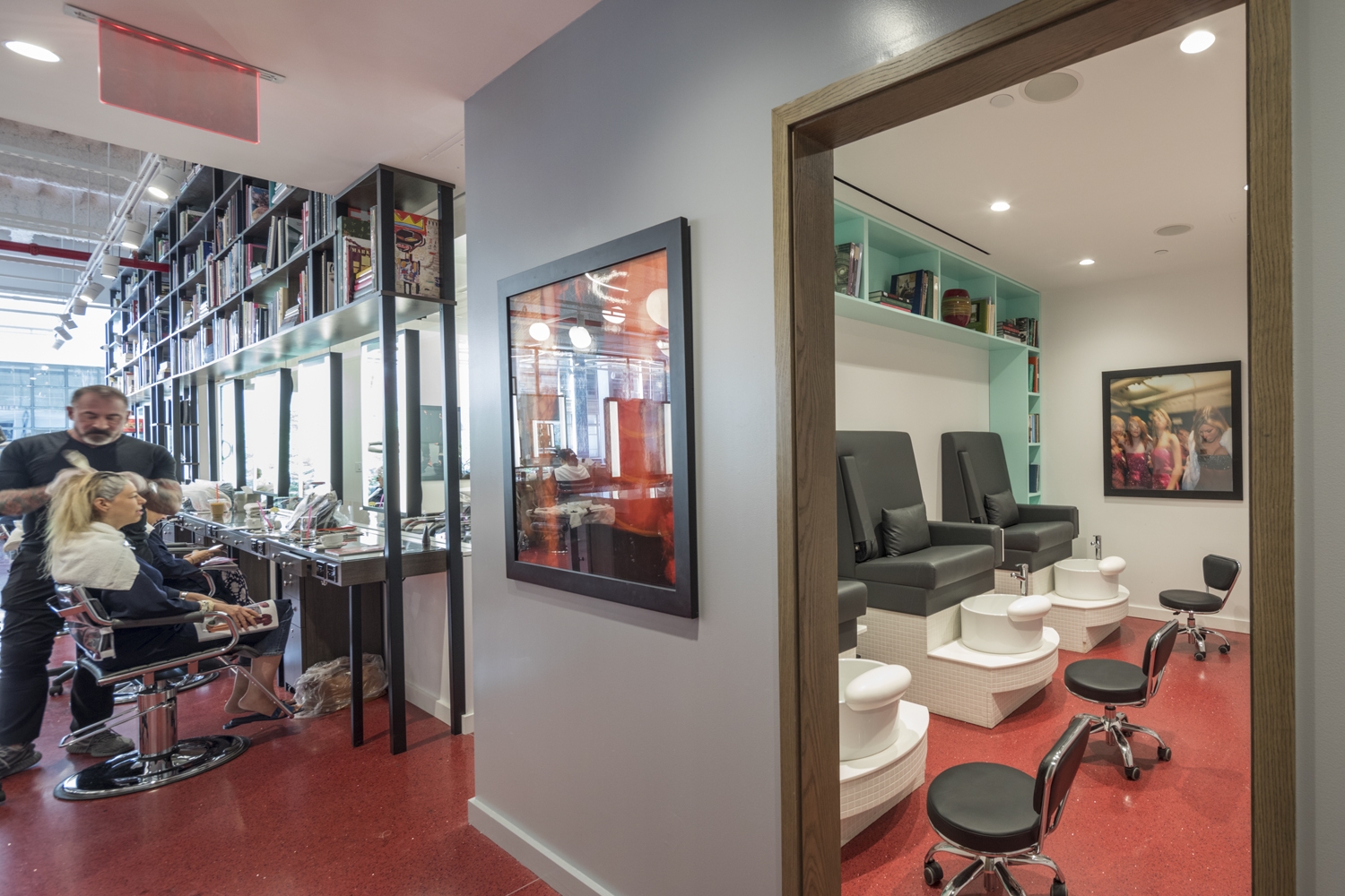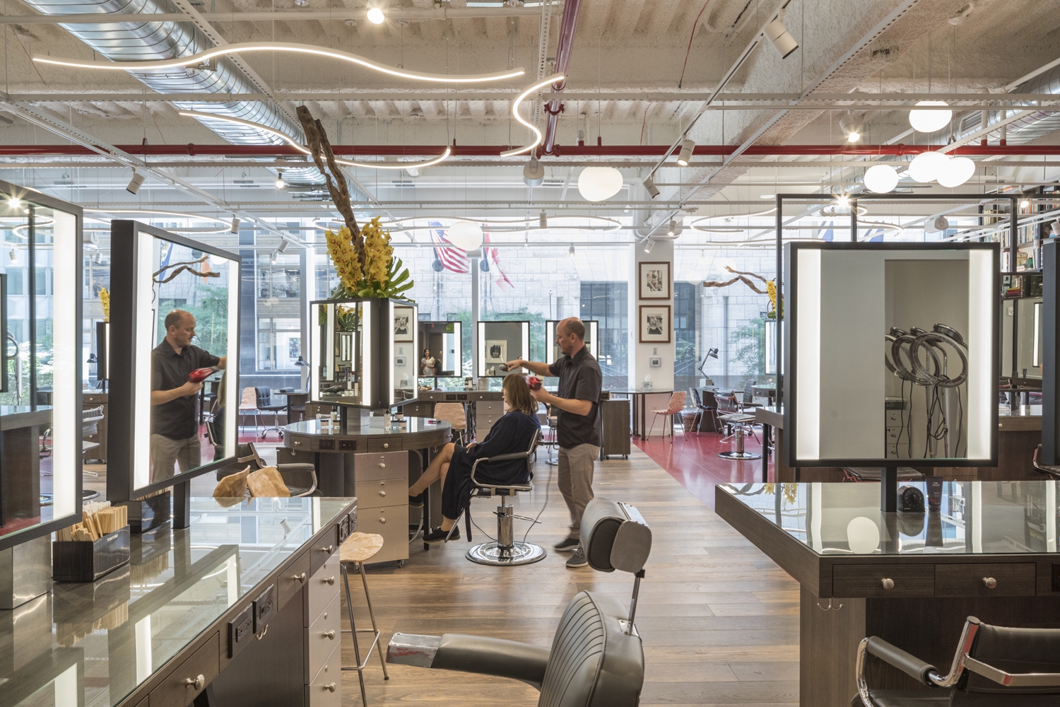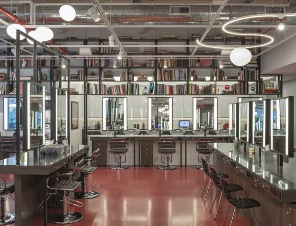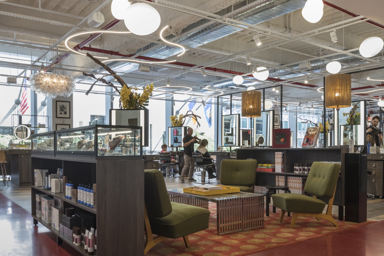 The main salon is ringed with red terrazzo floors inset with wide-plank oak. Squiggly LED light fixtures, decorative bubble lamps and track lighting illuminate the space. An antique hand-blown glass chandelier reigns over the make-up area.