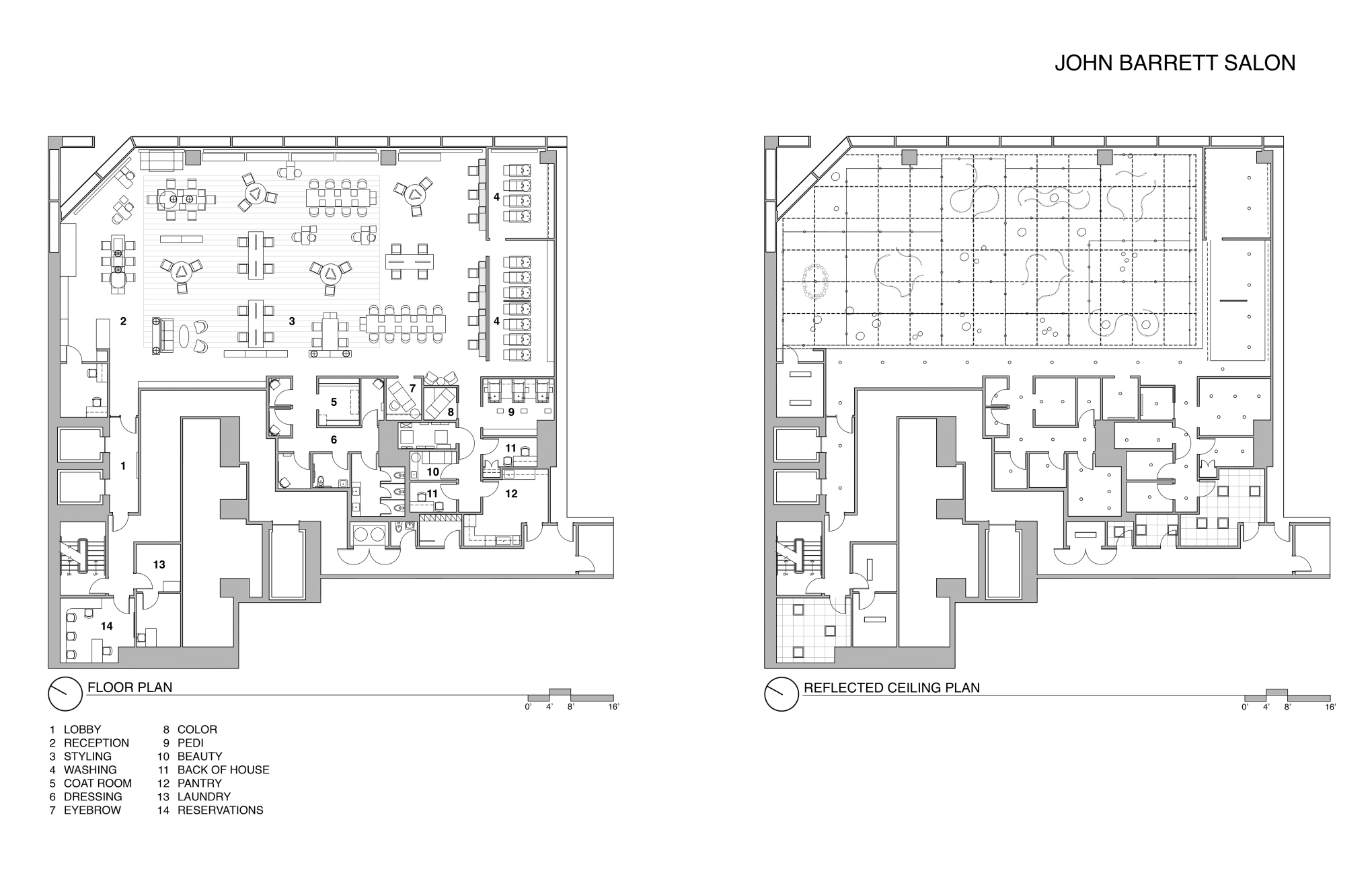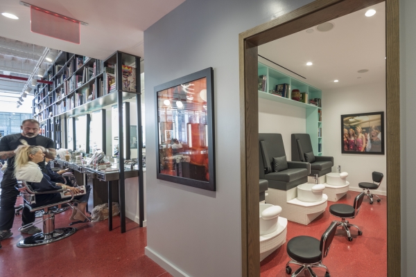 The colorists are arranged by the windows to take advantage of the abundant natural light while styling stations are scattered throughout. Hair-washing is separated by a clear glass wall. A private VIP room and manicure/pedicure room are located off the main salon.