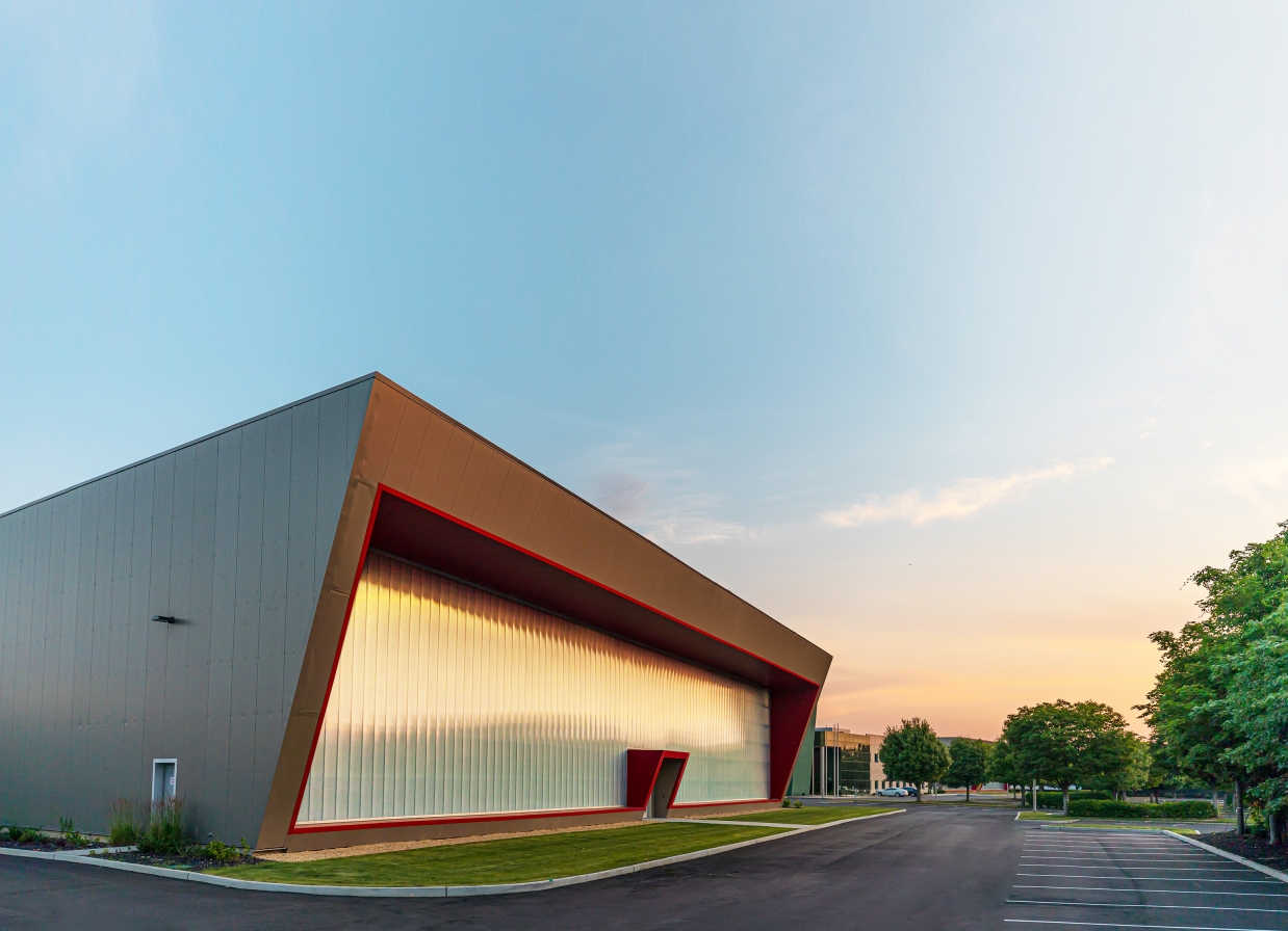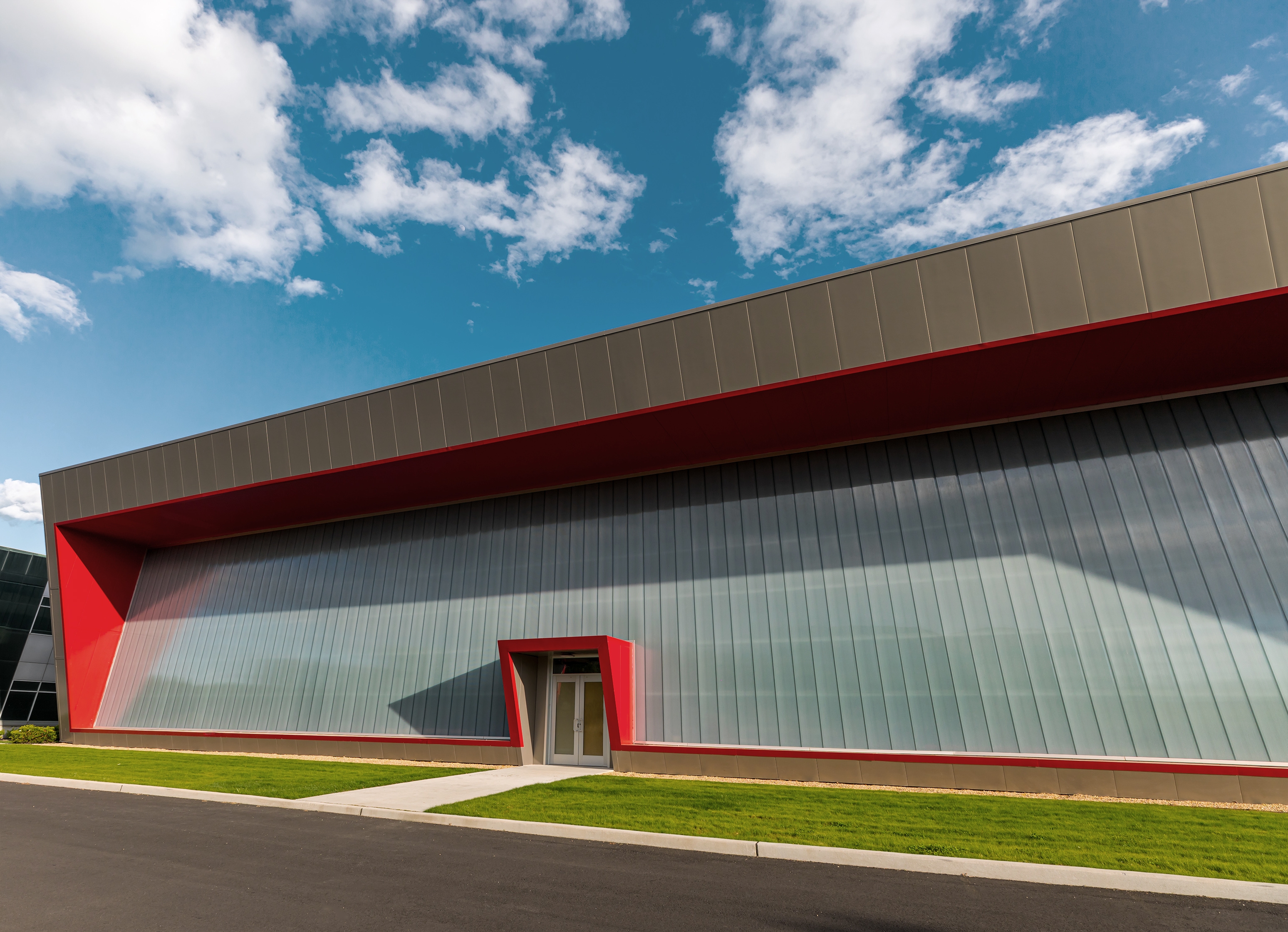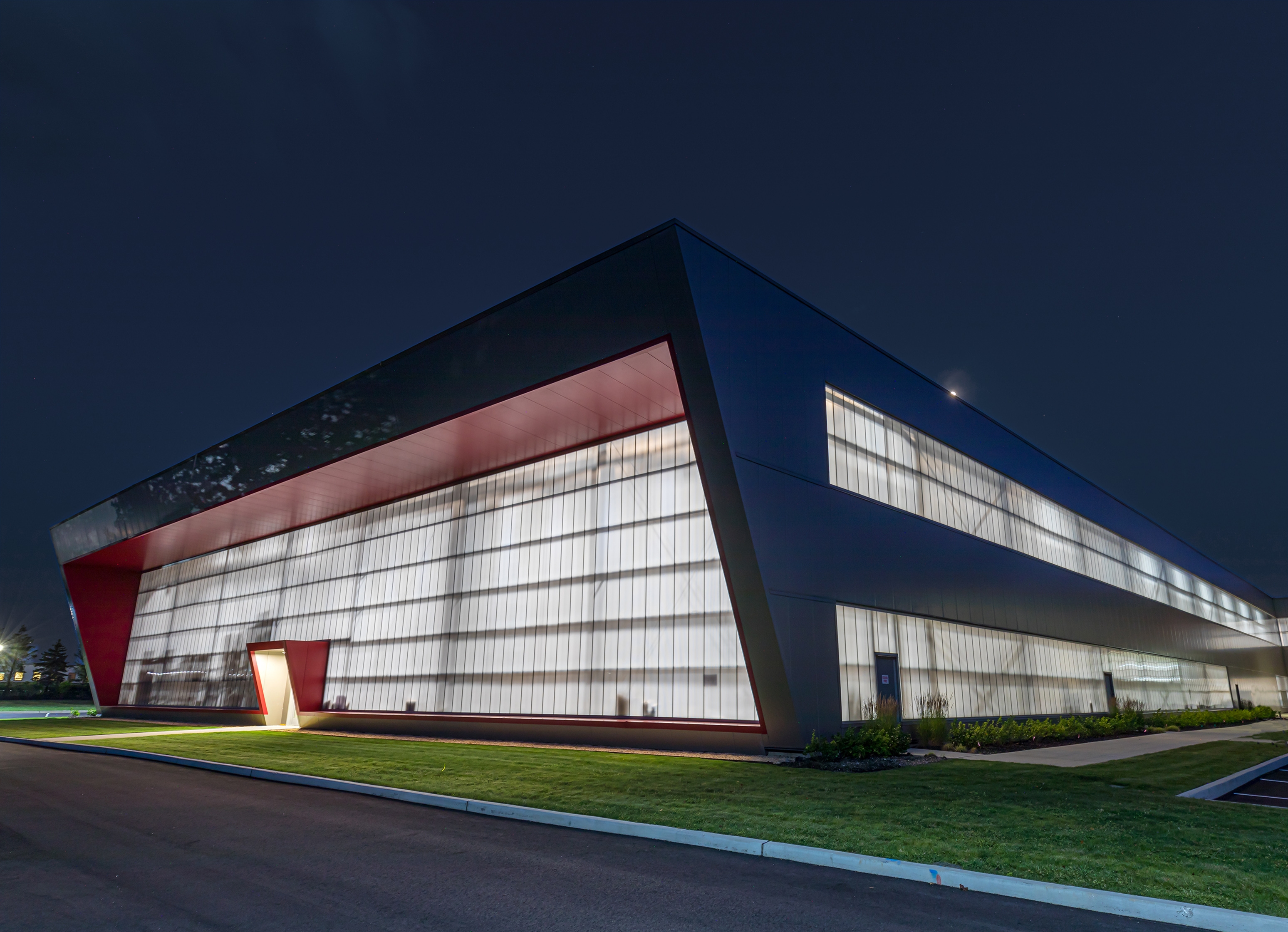 The new warehouses, clad with MBCI metal panels and punctured with bands of polycarbonate sheets allow diffused light into the 33' high spaces. The angled cantilevered front facades provide a canopy above the recessed translucent walls, framing them with red ribboning panels that accentuate the entry facades which glow at night.