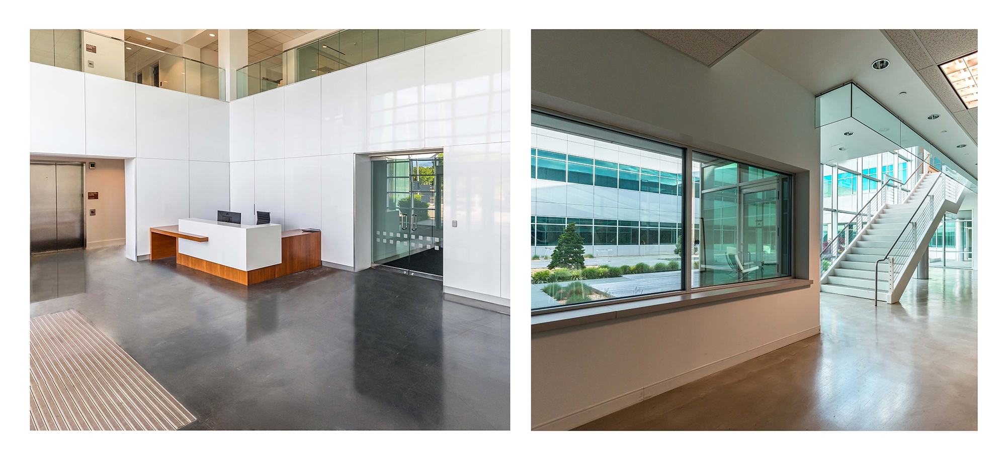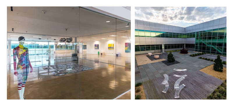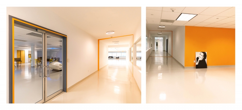 The existing central structure was converted to warehouse spaces, production spaces, administrative offices, dining halls and lounge areas. The entire complex is connected via breezeways and courtyards that provide natural light and air. Bold accent colors were incorporated to create different zones within the building.