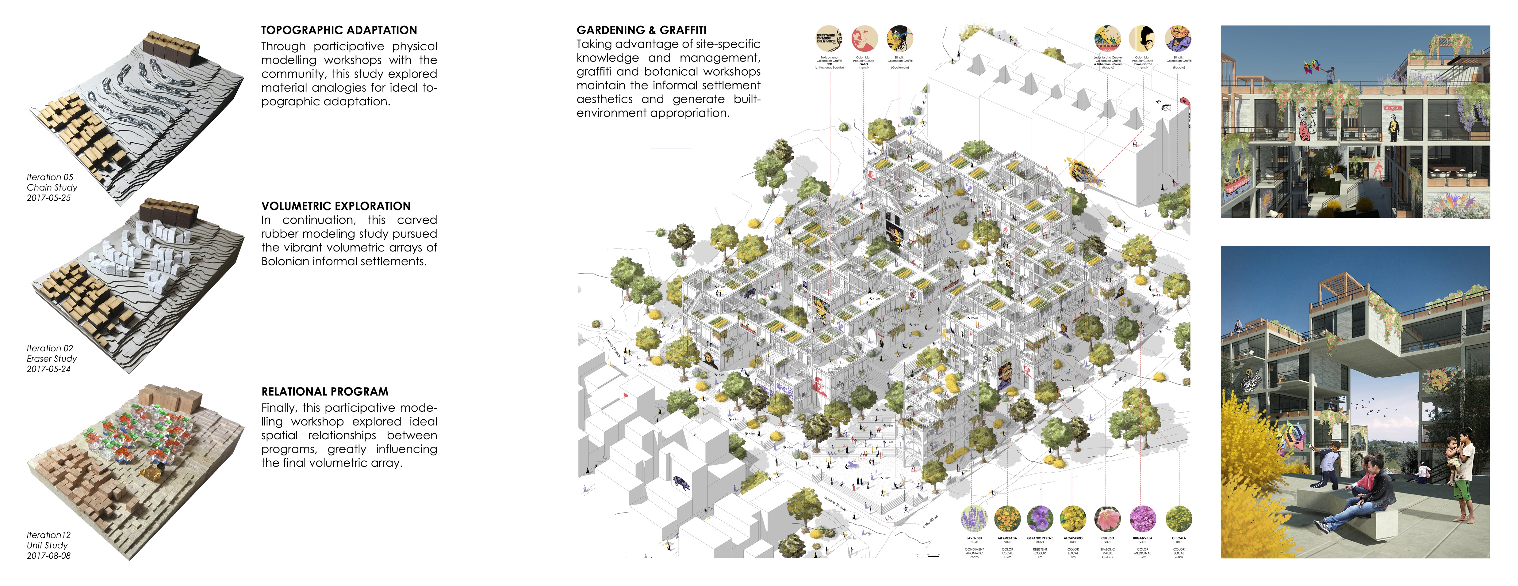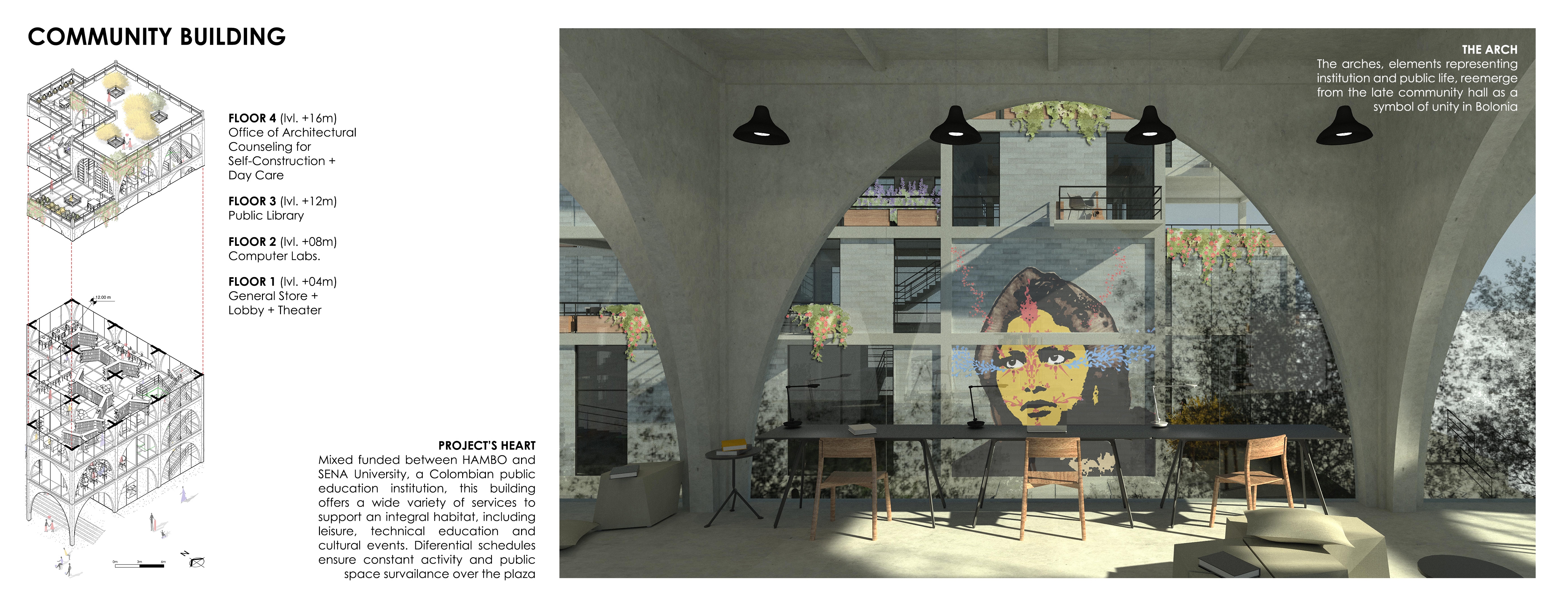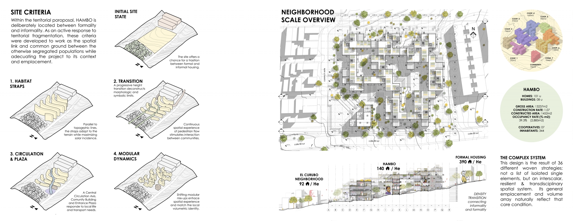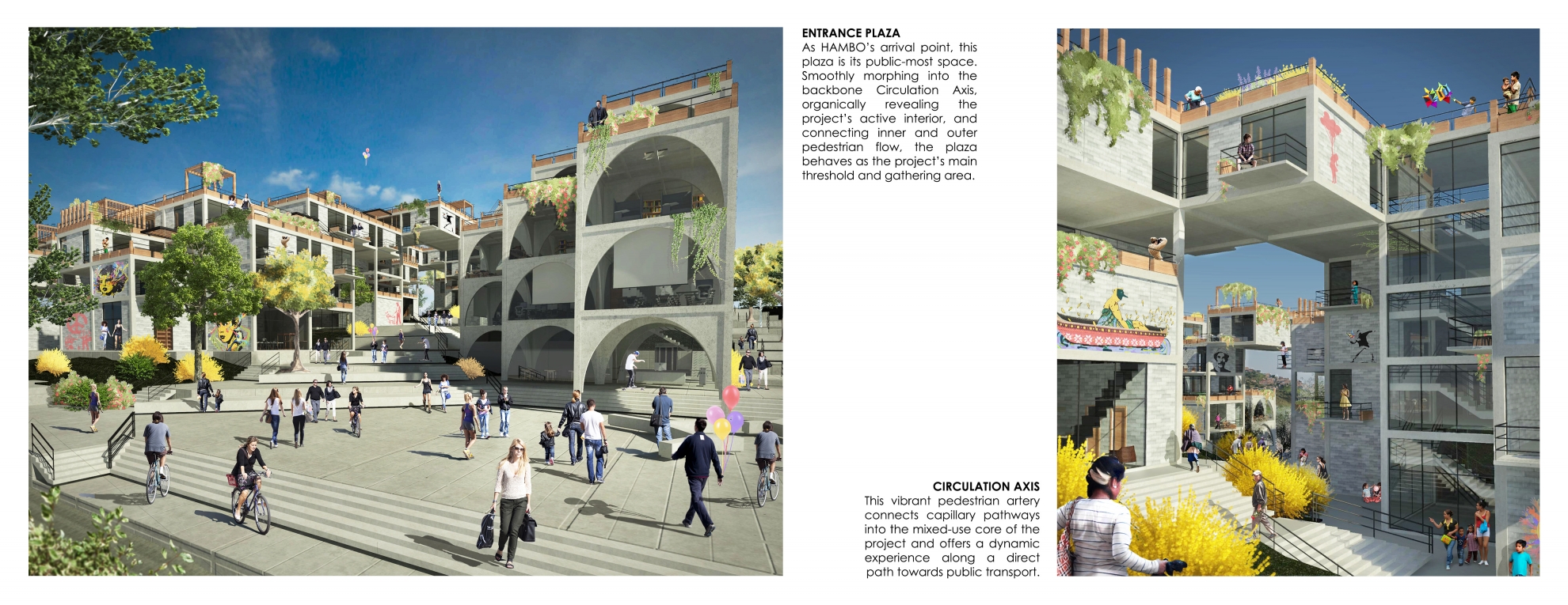 HAMBO is an experimental multidimensional project for socially vulnerable population located in Bogota, Colombia. Grounded on an in-depth 3-year participative study of the marginal neighborhoods of Bolonia, Usme, and on Complexity Theory, this project challenges Colombia’s simple social-housing monetary-cap policies with an alternative sustainable complex strategy system. By fusing urban connectivity, architectural flexibility, collective management, urban productivity, participative design, and informal spatial attributes, HAMBO is able to conceive and fund an innovative, complete, mixed-use, transdisciplinary, and resilient housing solution for vulnerable population tailored-maded to embroil within its territorial context and juncture. Its dynamic pathways, colorful surfaces, multi-level gardens, and ever-changing spatiality evoke the captivating experience lived within informal settlements and reflect the distinctive synergy of their vibrant communities.
