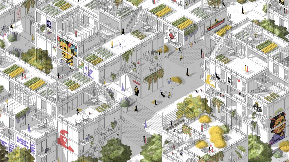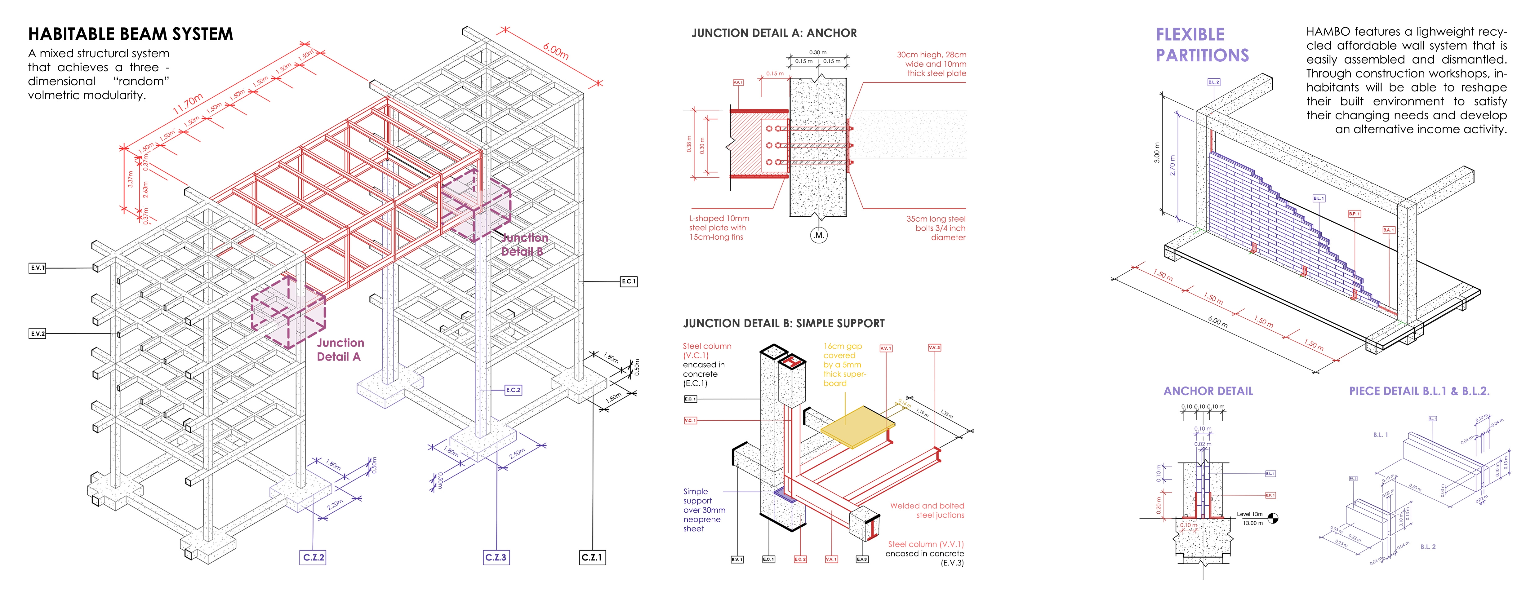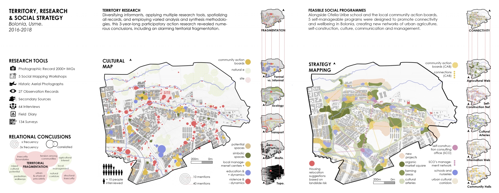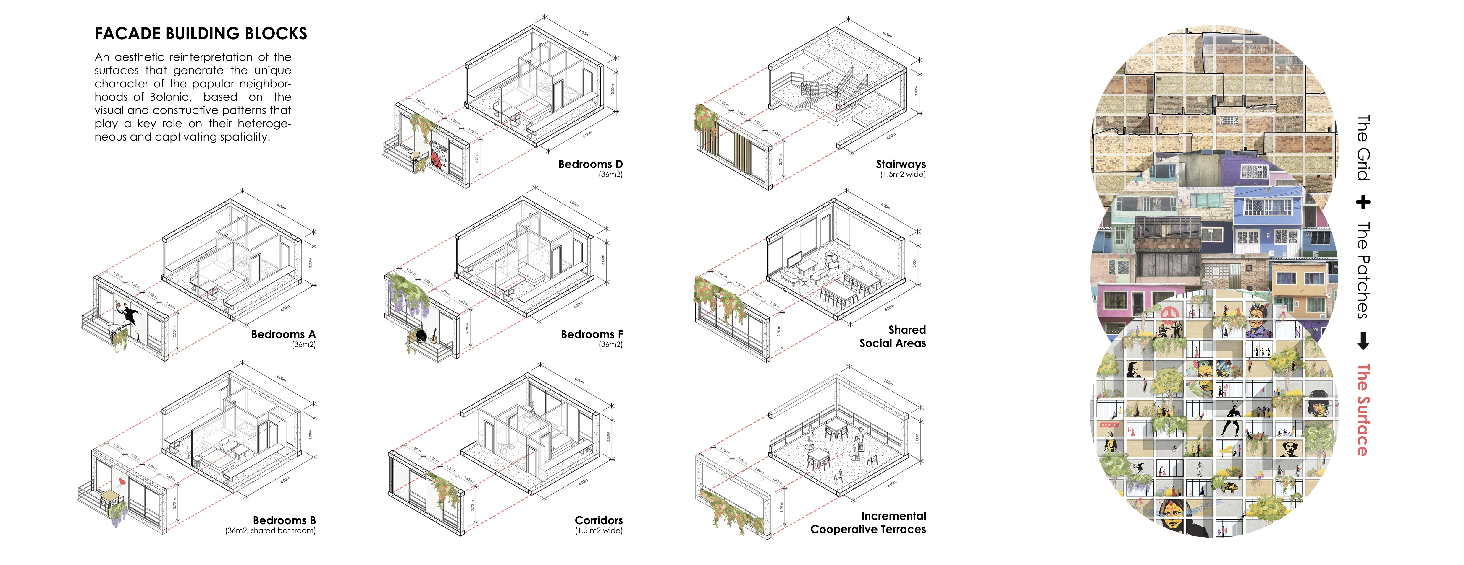 HAMBO is an experimental multidimensional project for socially vulnerable population located in Bogota, Colombia. Grounded on an in-depth 3-year participative study of the marginal neighborhoods of Bolonia, Usme, and on Complexity Theory, this project challenges Colombia’s simple social-housing monetary-cap policies with an alternative sustainable complex strategy system. By fusing urban connectivity, architectural flexibility, collective management, urban productivity, participative design, and informal spatial attributes, HAMBO is able to conceive and fund an innovative, complete, mixed-use, transdisciplinary, and resilient housing solution for vulnerable population tailored-maded to embroil within its territorial context and juncture. Its dynamic pathways, colorful surfaces, multi-level gardens, and ever-changing spatiality evoke the captivating experience lived within informal settlements and reflect the distinctive synergy of their vibrant communities.
