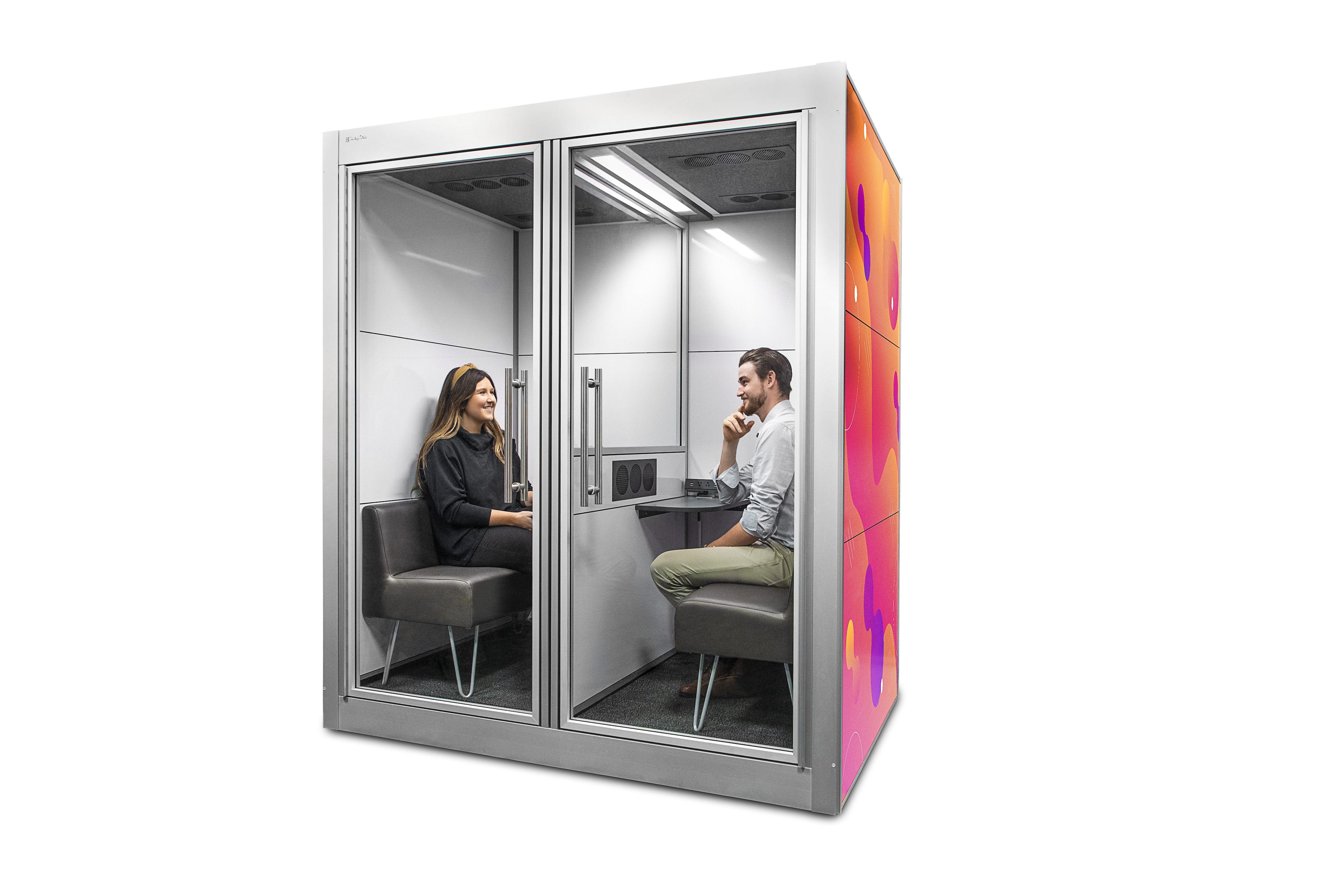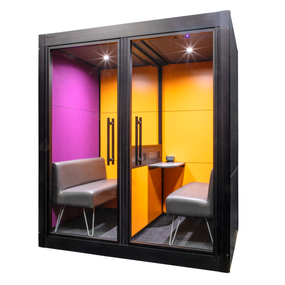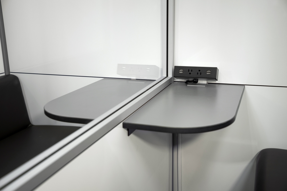 The SnapCab Consult allows for safe, face-to-face consultation and collaboration – no masks required! This rolling mobile pod features a glass partition, separating it into two separate rooms with two doors and two dedicated HEPA filters in the ceiling. With its customizable frame, panels, finishes, colors, furniture and accessories, the Consult can be adapted to fit any environment. Upgrade your panels with synthetic felt for an enhanced acoustic experience, or with Corning® Gorilla® Glass for a beautiful whiteboard surface.