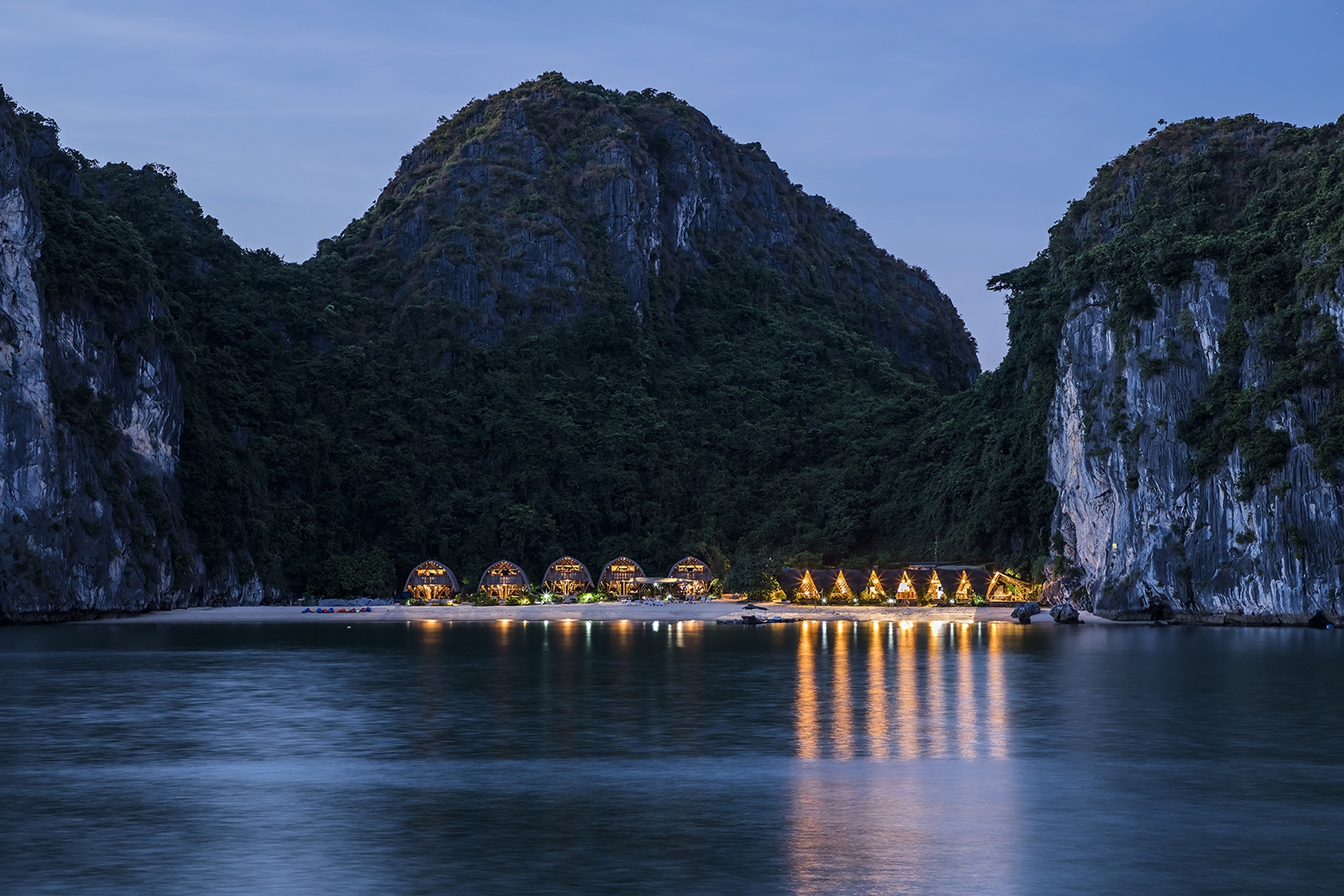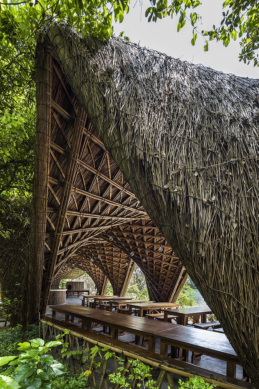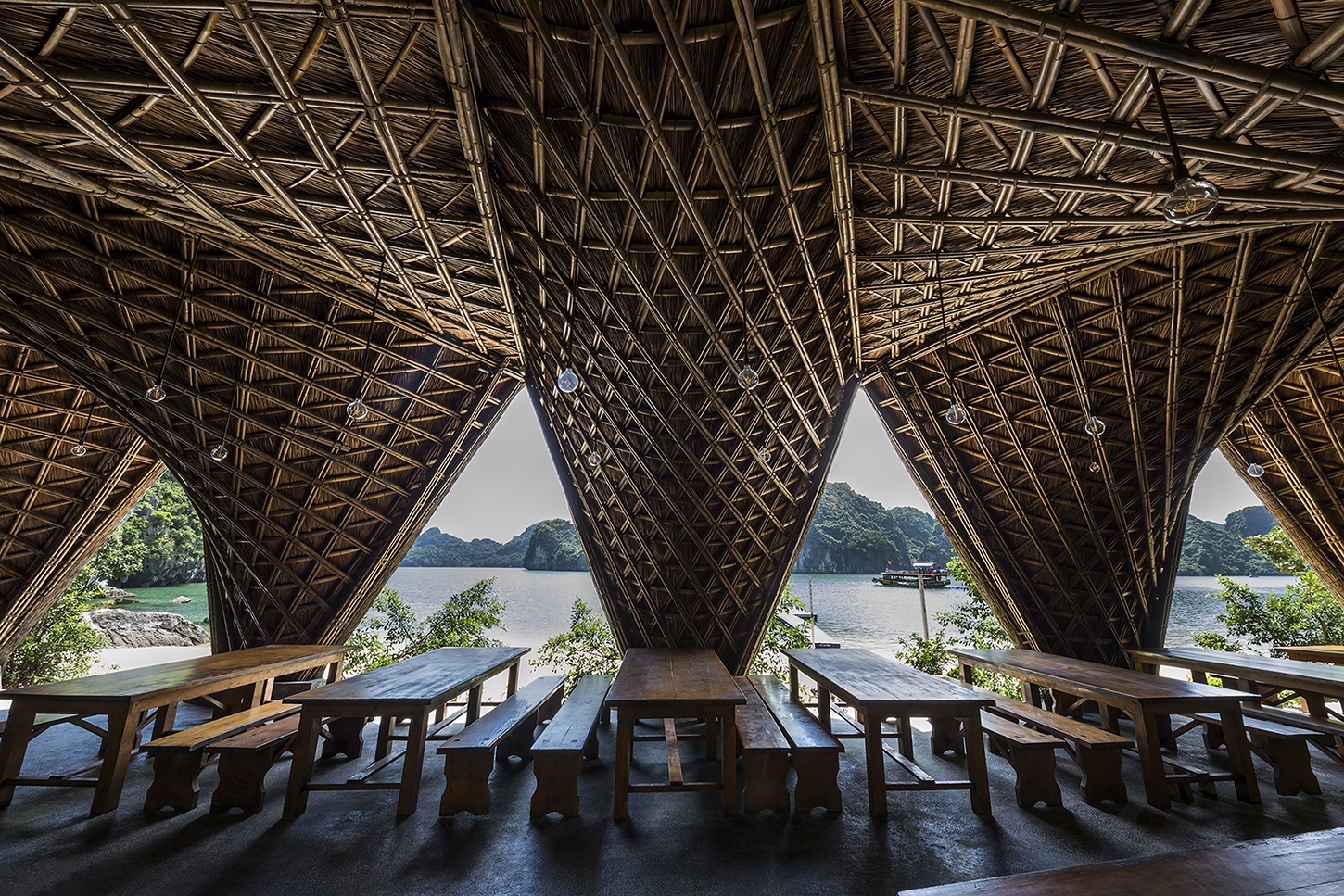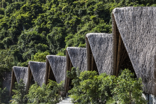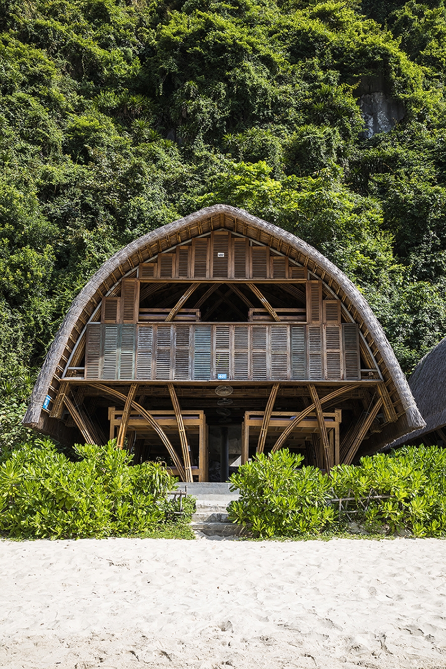 It consists of five huts, a restaurant and a pavilion. Bamboo is used for the project, an environmental-friendly material that can integrate in and be easily removed afterwards without affecting the natural beautiful gulf at the site where the project is built. The bamboo are assembled by bamboo dowel nail and then tightened by rope. They are treated with a natural traditional method developed at a Vietnamese craft village, which involves soaking the bamboo in mud and smoking afterwards. The whole structure is covered with thatched roof, offering authentic Vietnamese cultural experience as well as reducing environmental impact.