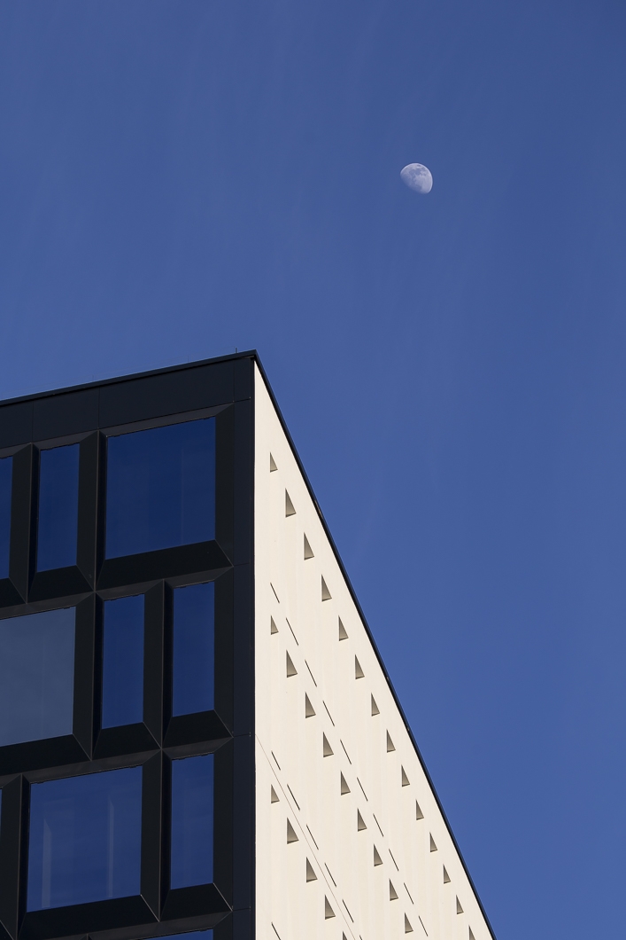 Rhythm, sequence, matter, colour, volume that are now excavated in an obsessive bas-relief, white and infinite, become extruded into a variable series of blue bow windows. The intention was to reinforce the nature of the building constructed with an intense and repetitive structural pattern. The elevation is created as a continuous part of it, indicating simple traces of this "vertical" growth.