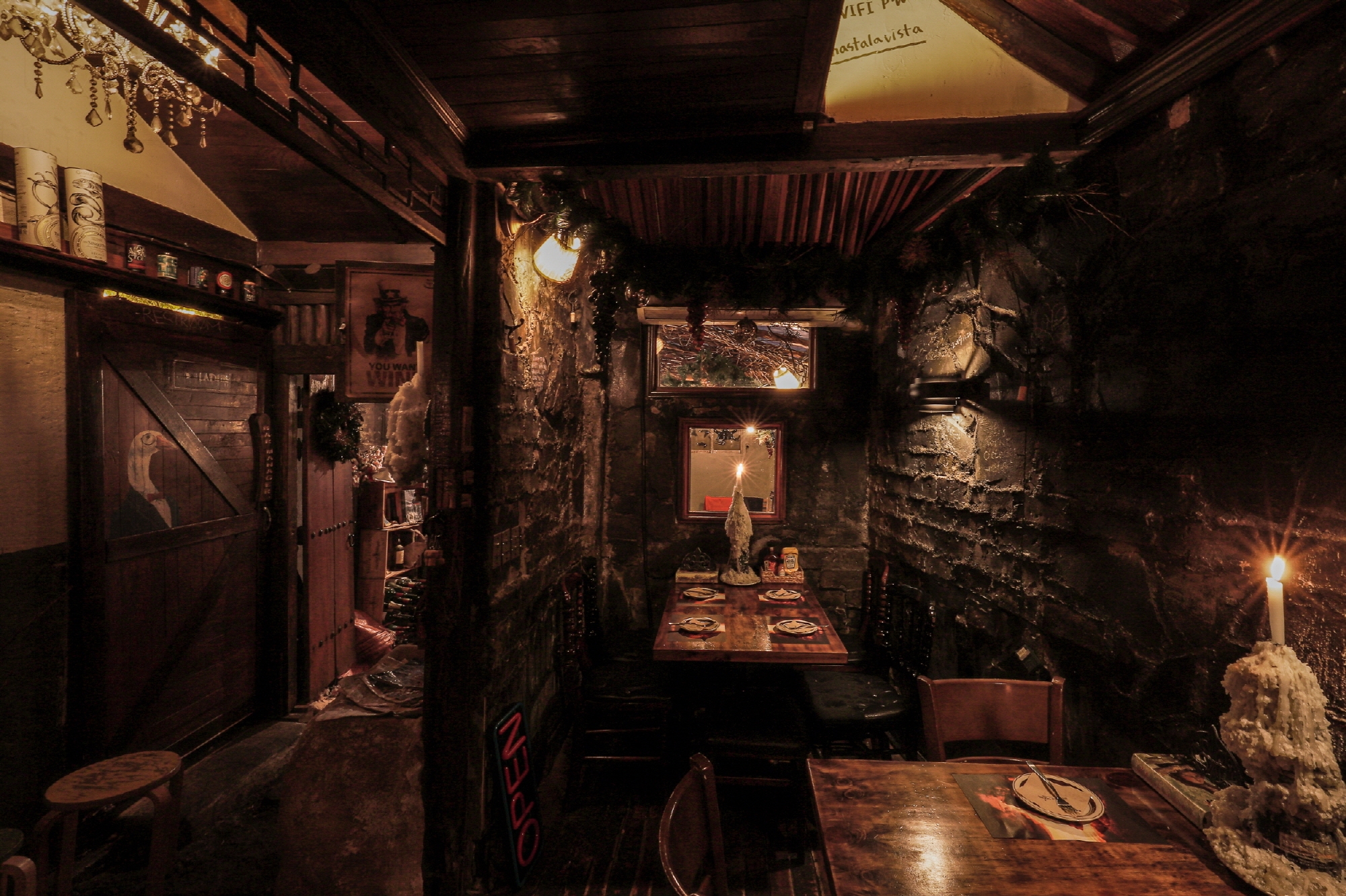There is a transitional space connecting the entrance and the interior of the wine bar.