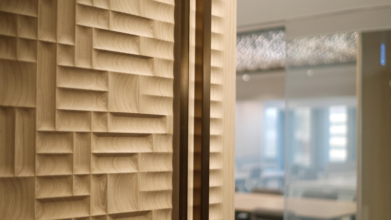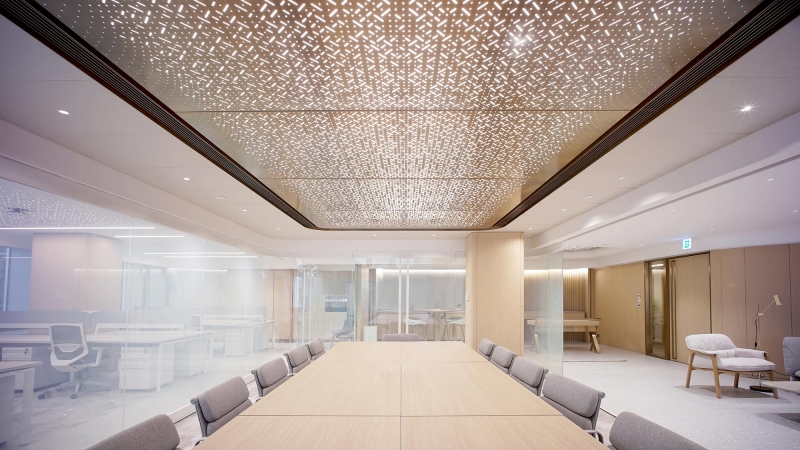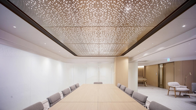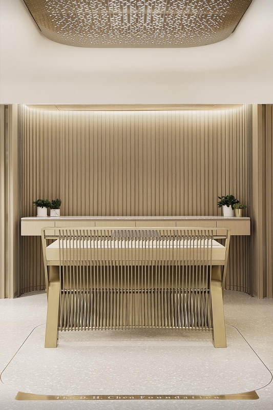 Inspired by the history of the D.H. Chen Foundation as a major contributor of the textile industry in Hong Kong, elements of the textile industry are embroidered into the office to intensify its character. From the reception table that symbolized the manufacture process of weaving machine to the knitting pattern ‘embroidered’ on the ceiling light box and pin-board wall, are all the representation in respect of the past and founder of the foundation.