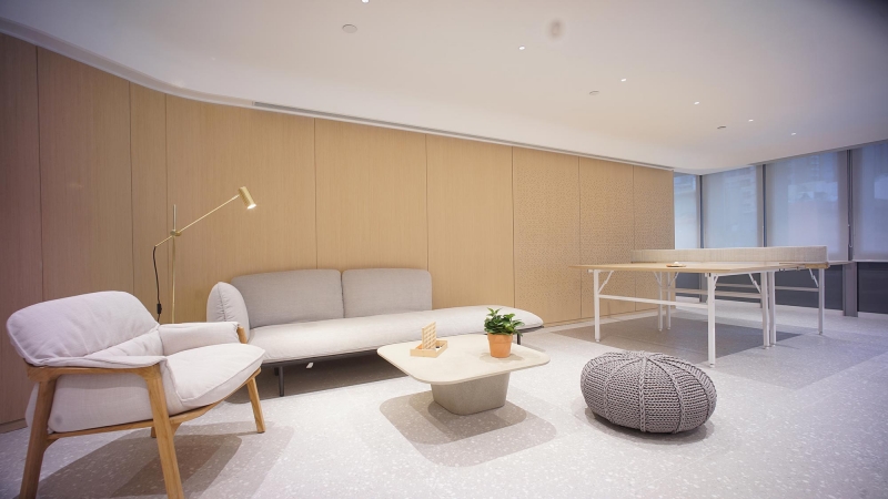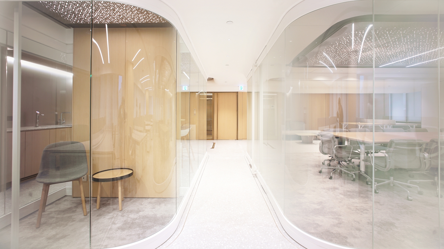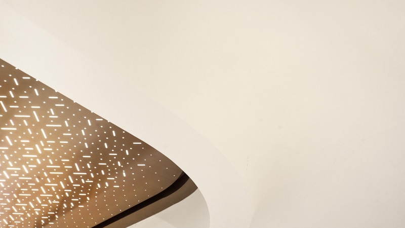 The space itself is a piece of fabric seamlessly interlacing the ceiling, the wall and floor by bringing curve as the primary solution to corners. Through minimizing sharp edges and drawing on light-toned scheme, the space signified an impression of smoothness and softness. This essence of fluidity does not confine only on physical treatment, but also with its spatial circulation.
