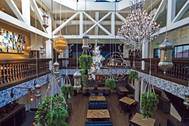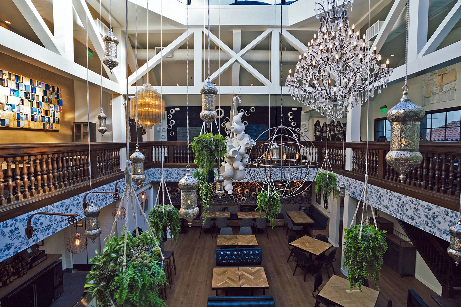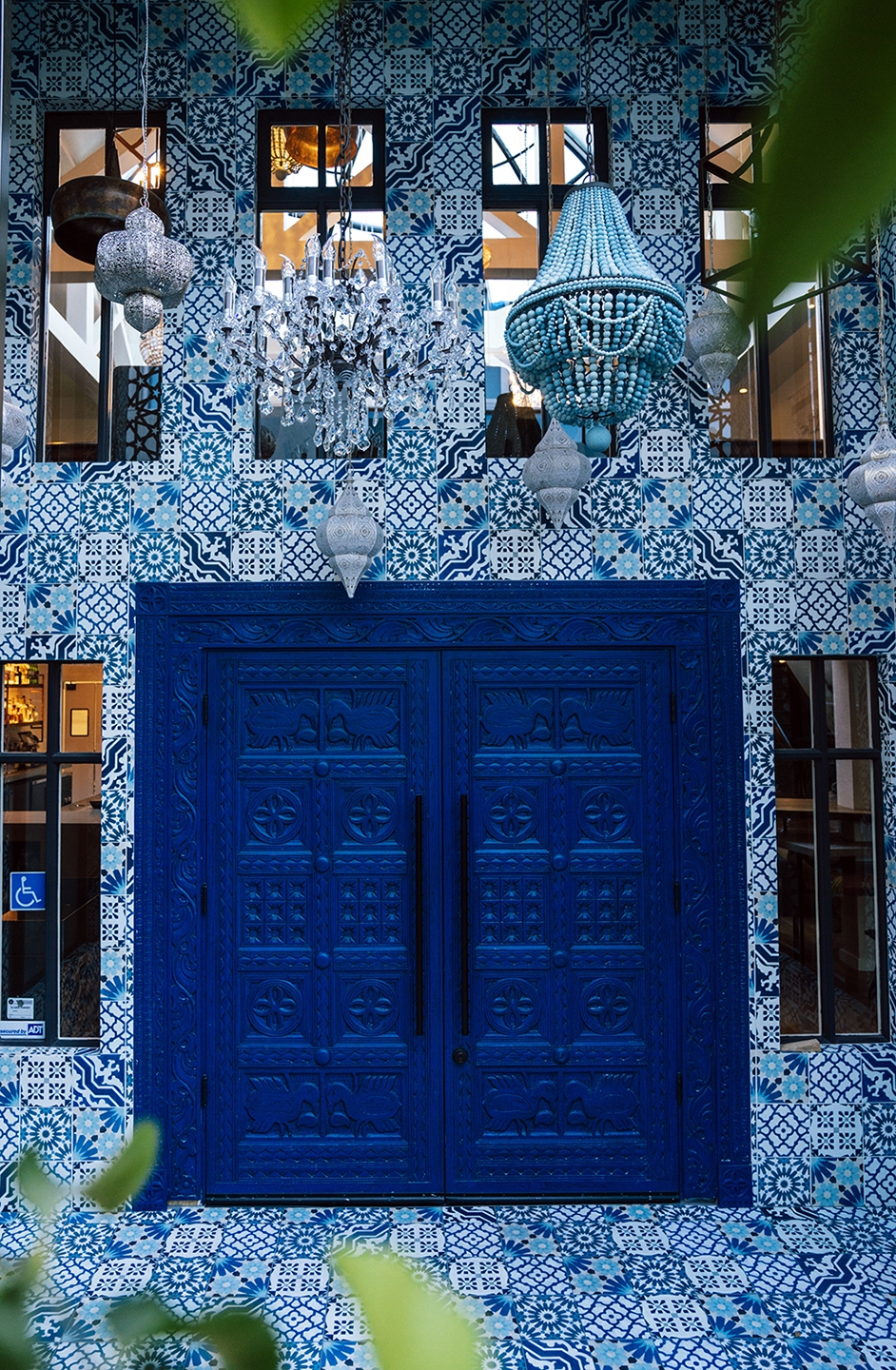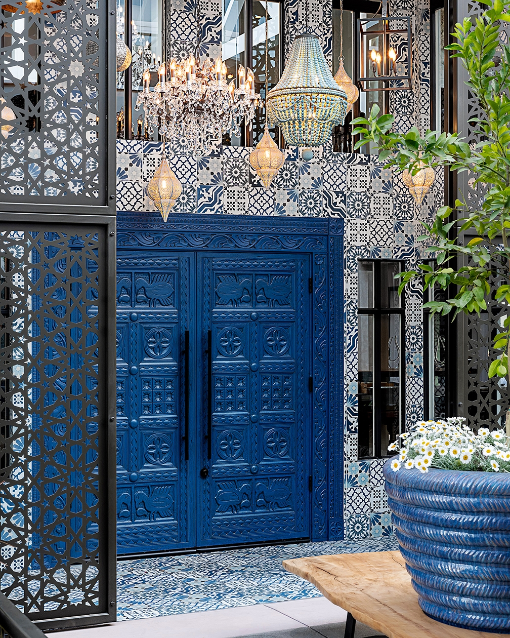 We created a transition from the downtown pedestrian alley into the vintage-inspired interiors is done through a shocking blue entryway. A hand-carved wood door painted a deep indigo blue is surrounded on all sides (including the floor) by random patterned blue and white tiles. An eclectic array of light fixtures, from brass Indian drops to crystal chandeliers, lights your way to the journey ahead.