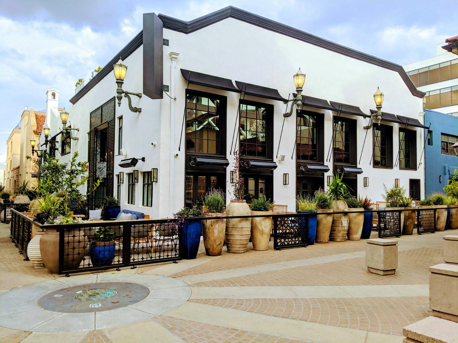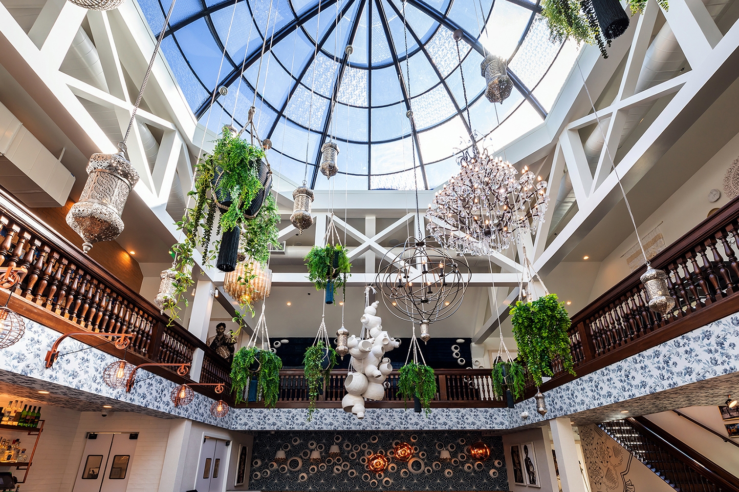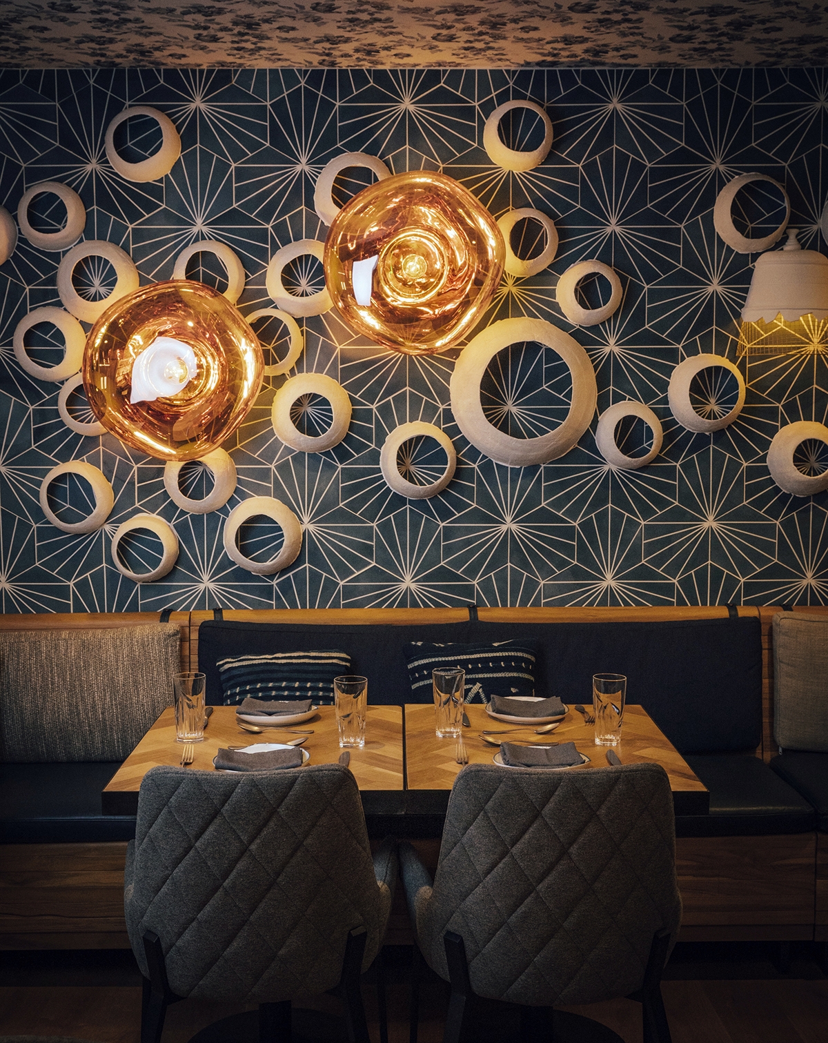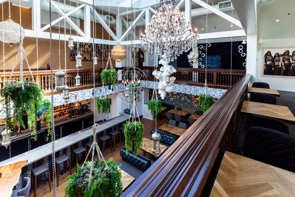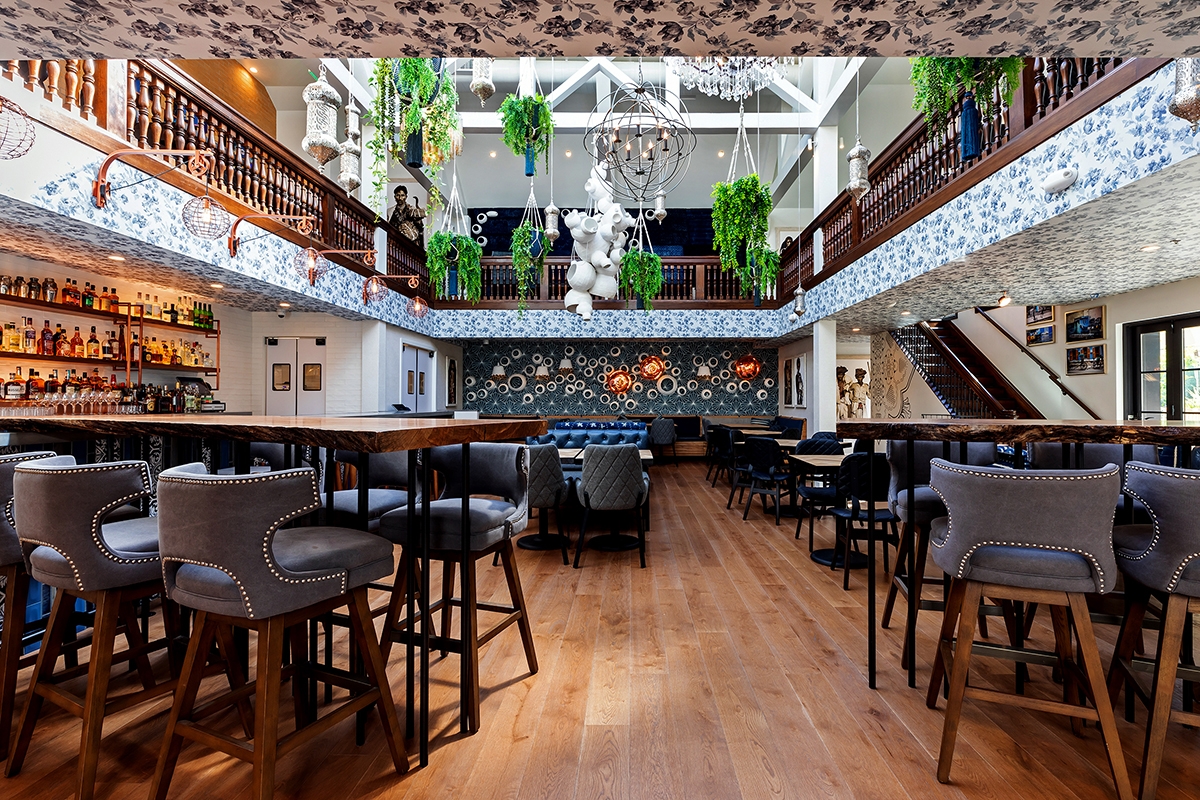 We created a transition from the downtown pedestrian alley into the vintage-inspired interiors is done through a shocking blue entryway. A hand-carved wood door painted a deep indigo blue is surrounded on all sides (including the floor) by random patterned blue and white tiles. An eclectic array of light fixtures, from brass Indian drops to crystal chandeliers, lights your way to the journey ahead.