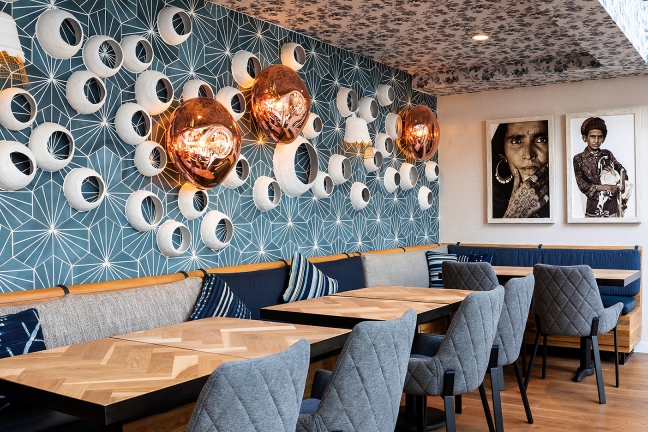 The intention was to design a restaurant that was upscale, yet comfortable enough for people to visit multiple times a month. Our approach was to evoke the senses through color, texture and pattern, while staying true to the deep-rooted heritage found in Indian culture. The indigo colors and textures hint to how the original textiles where dyed and processed generations ago. Combining these elements, along with more refined details, created a truly sophisticated yet welcoming space.