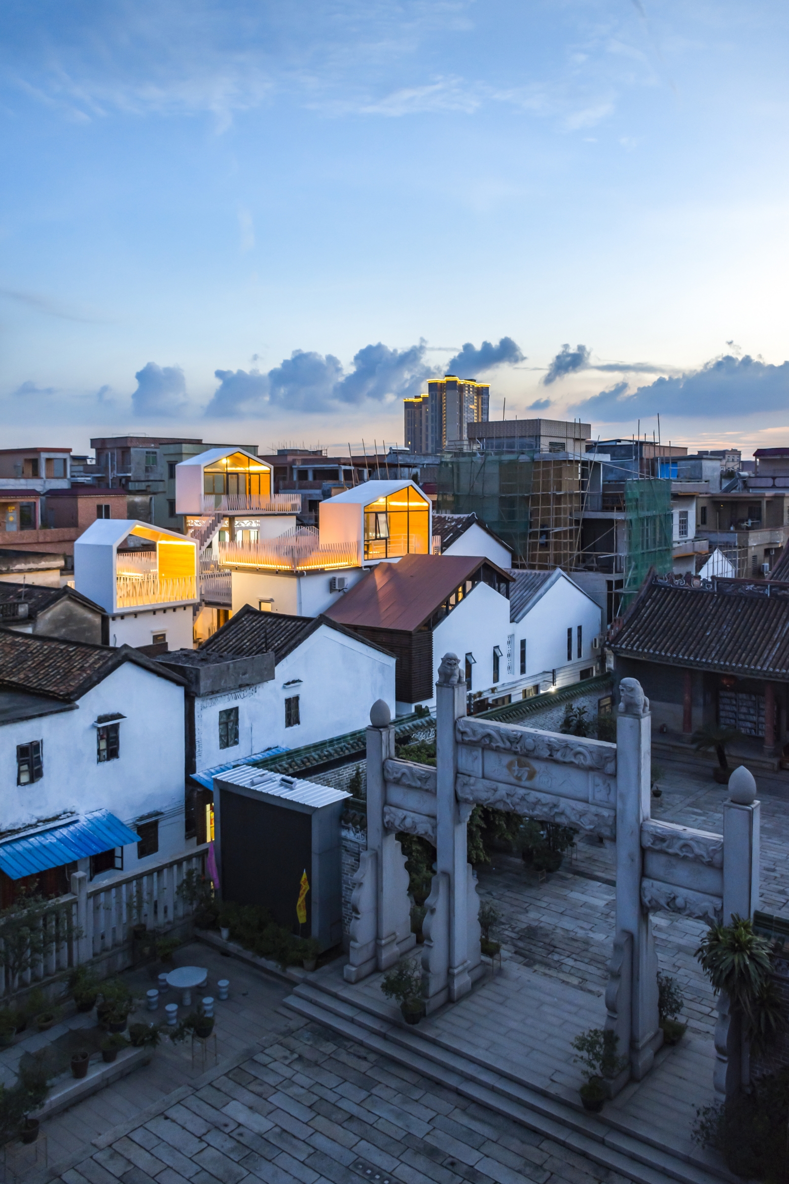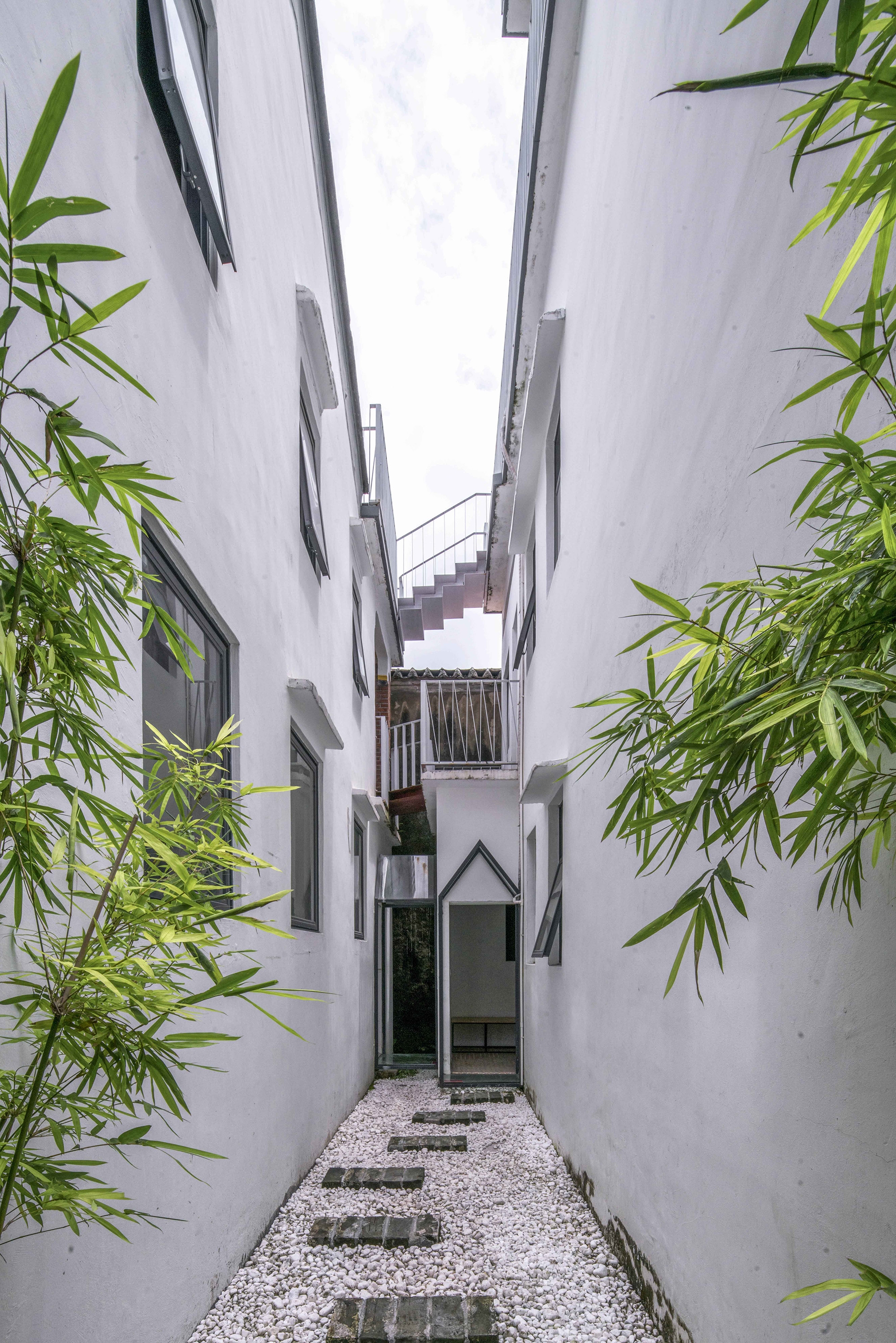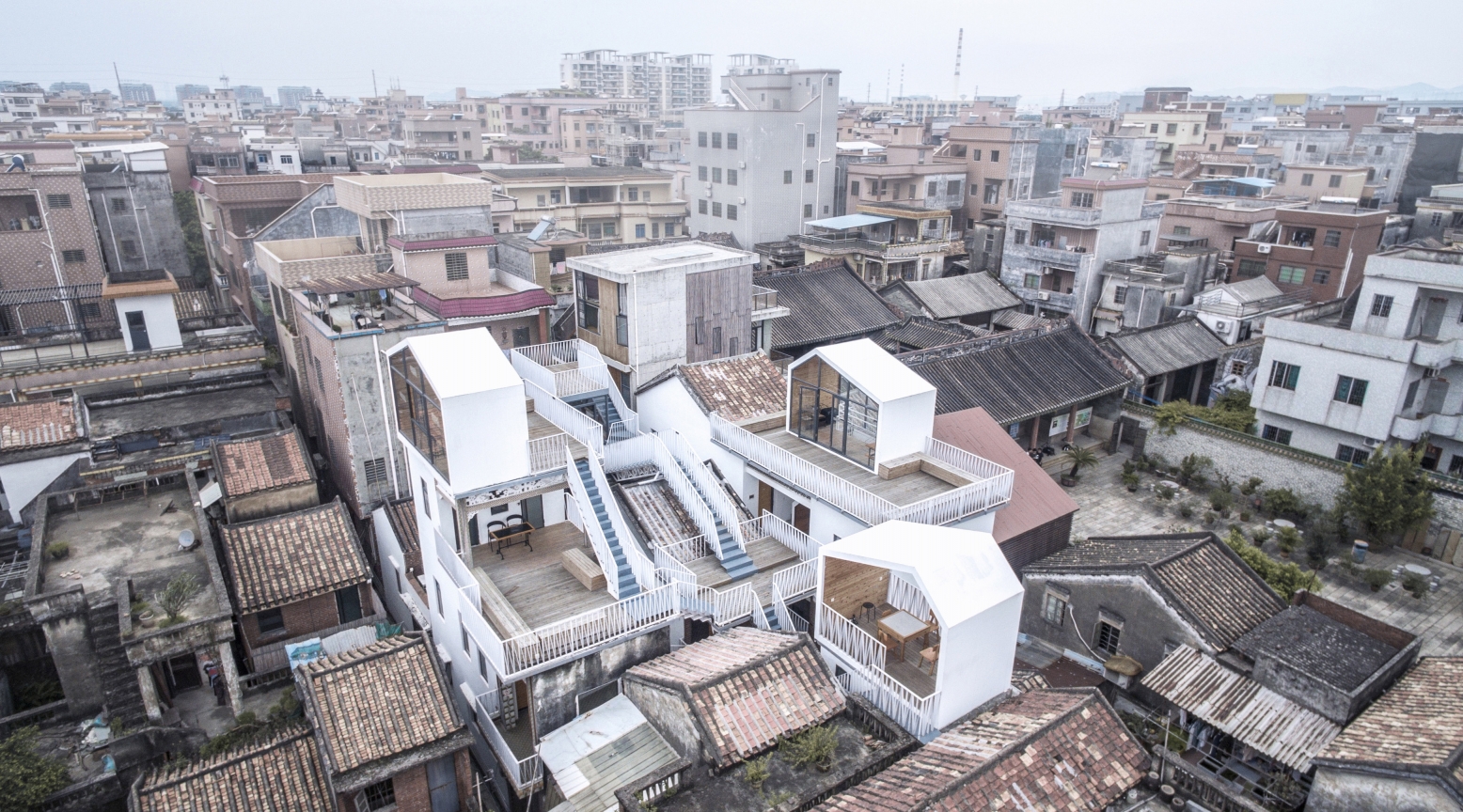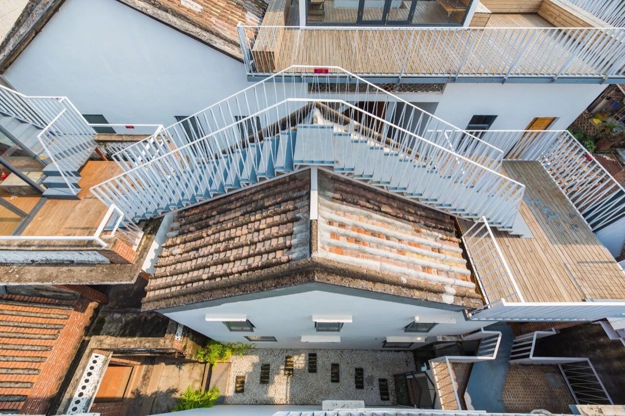 The most crucial method of the White House Homestay project is to integrate the roof terrace space of the four independent houses that were originally owned by different owners. This, in turn, creates a rare public space in a high-density village. Built with a new spatial structure, the public space is floating in the air and transform the private living space into a public space, making it possible to solve the problem of the lack of public space in the village creatively and demonstrate how the old buildings could be adapted to the new function.