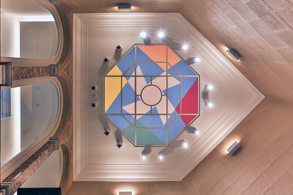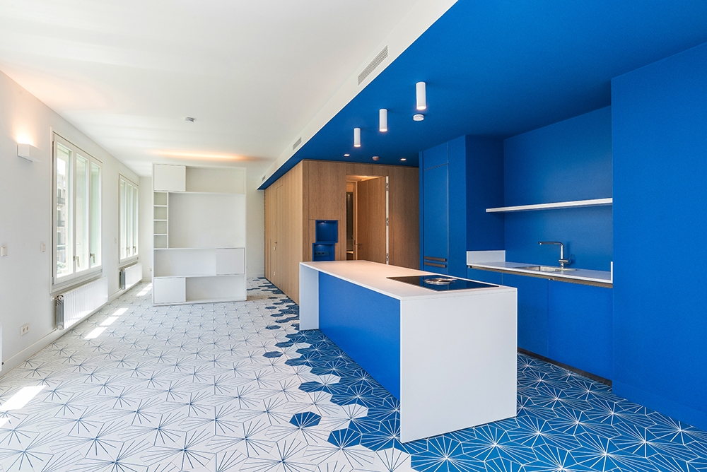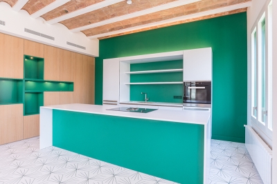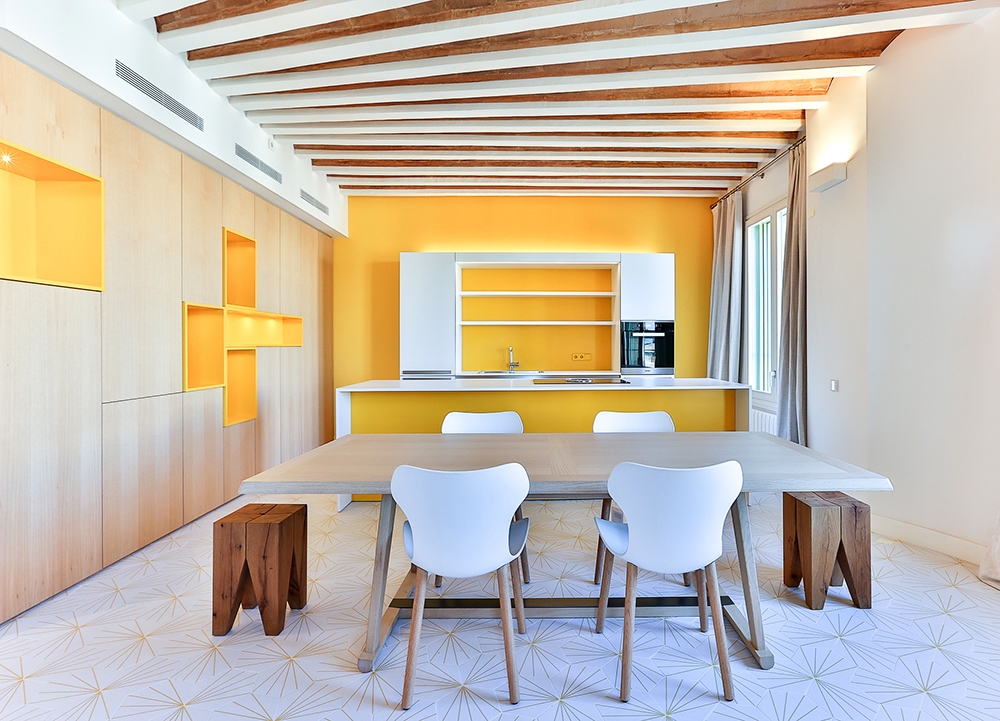 The interior design preserves and restores traditional architectural elements such as the Catalan vault in the ceilings and custom tiles on the floors, as well as opening up the spaces to make the most of the brightness and the pleasant weather of Barcelona. The overall white palette is broken by Le Corbusier ‘s colour palette up with interesting features like bespoke shelved walls which divide the spaces without closing them up.