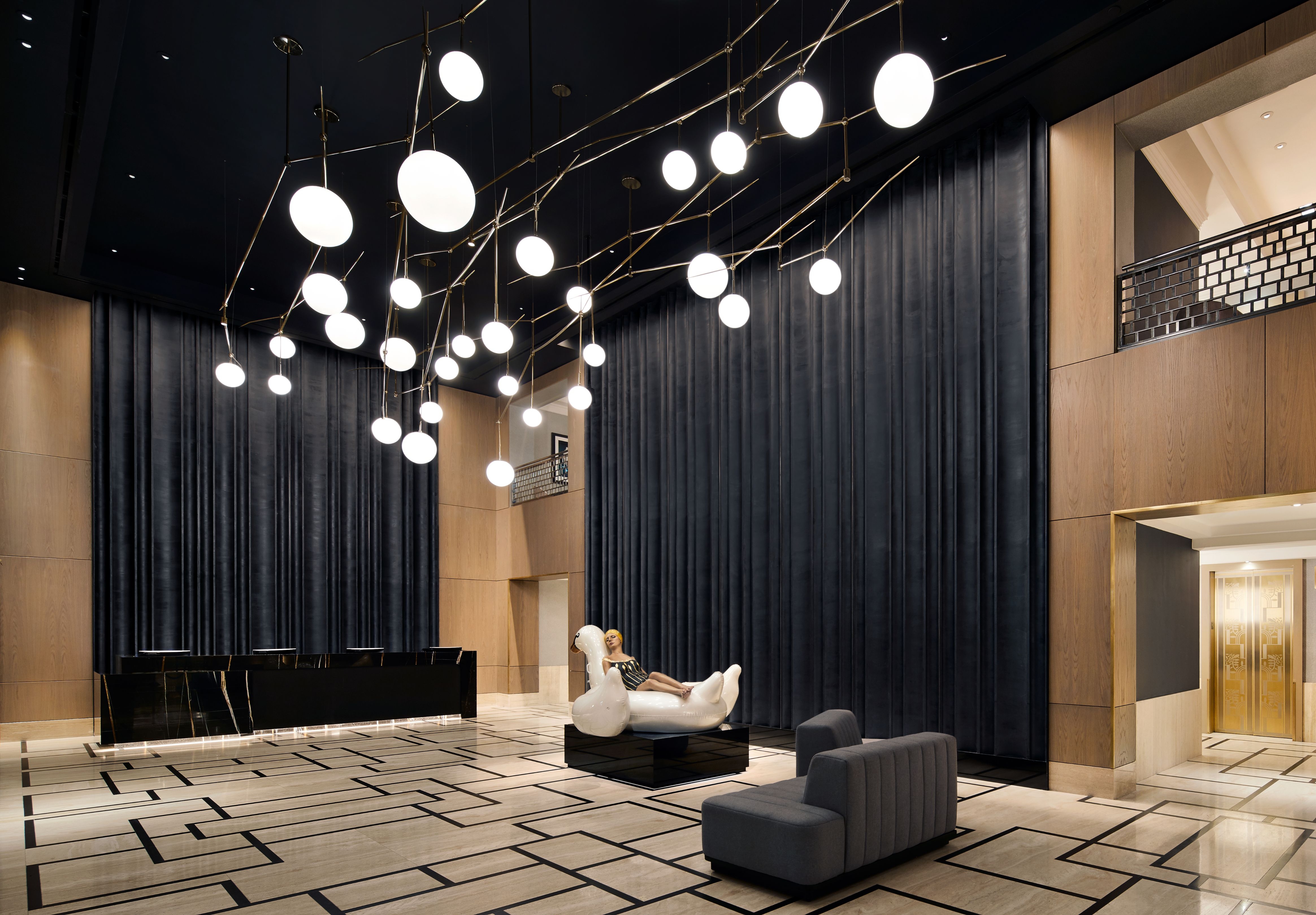 Guest are greeted in the lobby by a large, lifelike sculpture, ‘Leda and the Swan’ by Carole A. Feuerman, which was acquired by the hotel. Museum-style lighting contrasted with dark surrounding walls highlights this special piece while emphasizing it as a gallery space.