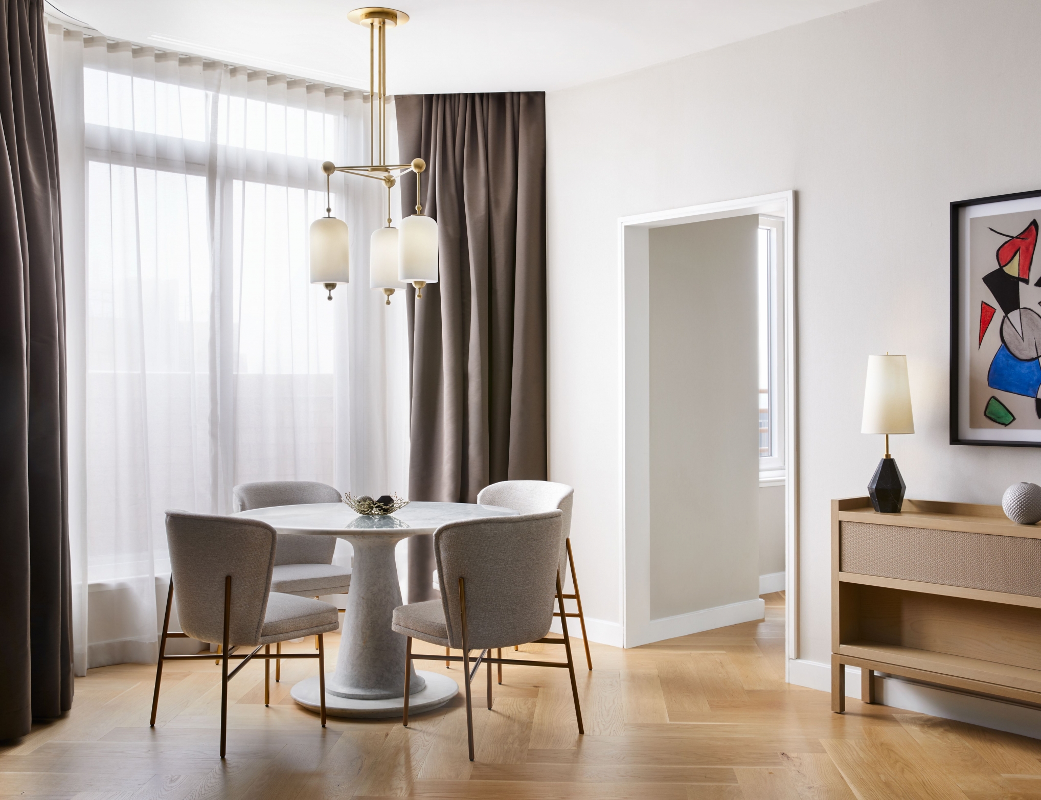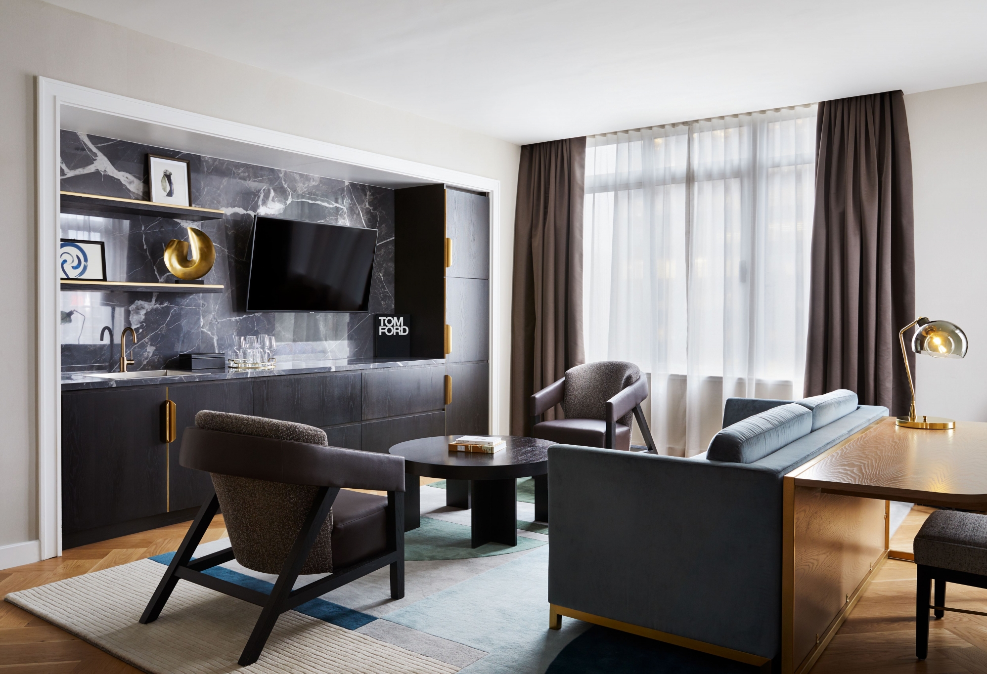 Guest suites feature luxurious textures and materials in a neutral palette, such as herringbone wood floors, hand tufted wool rugs, leather dining chairs and a sleek coffee table with sculptural legs. The all-suite rooms provide guests the sense of being in a private pied-a-terre, consisting of separate living and sleeping spaces. The hotel also features a collection of four apartment-style suites, six sky suites, one atrium suite and one split-level penthouse.