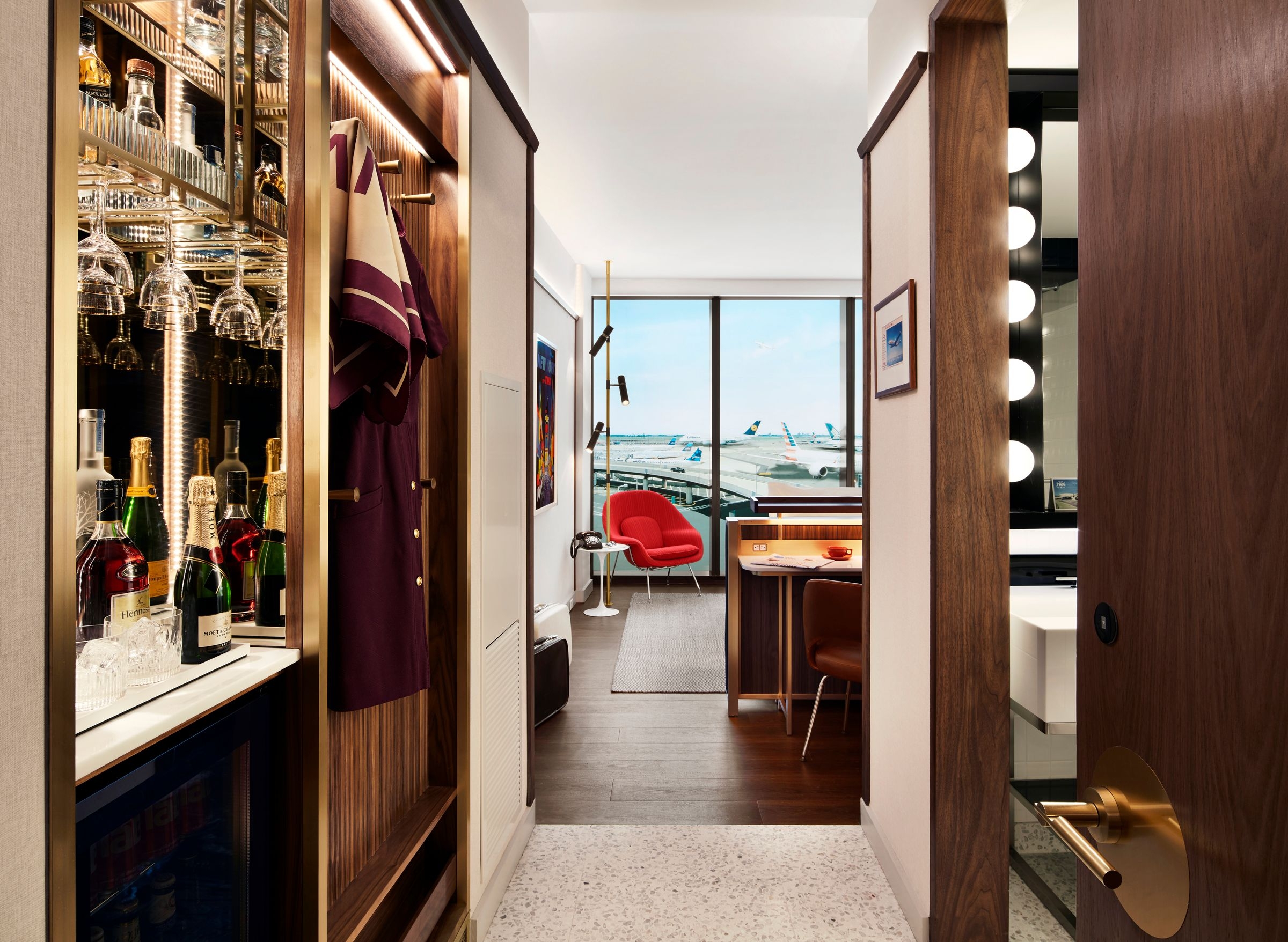 Stonehill Taylor, the interior designers for the hotel’s 512 guest rooms, Sunken Lounge, and other public spaces, restored the excitement for air travel by maximizing comfort. Sixties-inspired elements in the guest rooms include select Saarinen-designed Knoll furnishings, a martini bar, vintage rotary phone and gleaming terrazzo tiles in the bathroom. In many of the rooms, beds are positioned to let guests enjoy the rhythm of the runway or the glory of Saarinen’s TWA Flight Center. With the TWA Hotel offering stays for as few as four hours, their design approach to the guest rooms was mindful of the fact that guests might only stay long enough to change clothes, nap or take a quick shower.