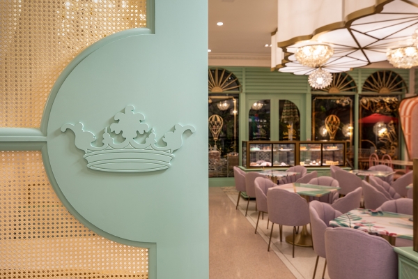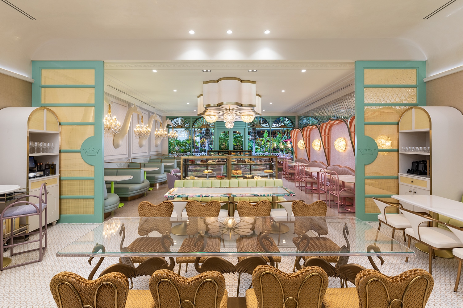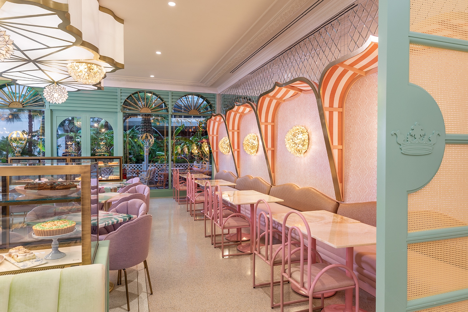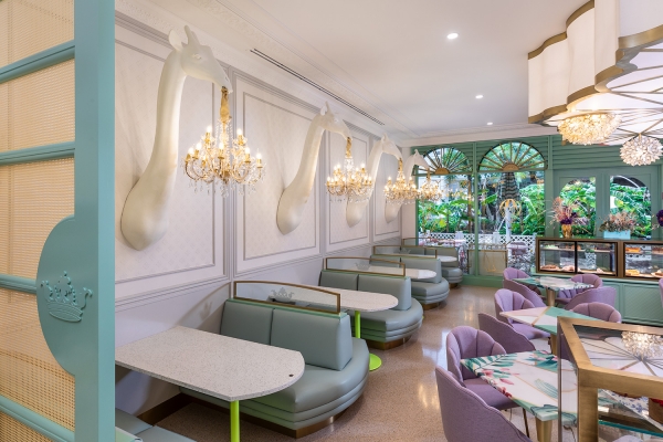 As the space is demur, the interior is anything but. The mash up of finishes, colors and curated custom design cues create an energy and initial design dislocation which feels totally connected when assembled. The sheer combination of disparate design styles come together to create a space that just makes you smile. The juxtaposition of traditional and modern blends seamlessly, but the standout is the immersive design wow, wonder and surprise to see such an eclectic mix of styles harmonizing as one. A calming palette that feels vaguely familiar yet is new and unique, just like the Bakery goods. A bold and commitment to pastel colors, gilt trim, a colorful jungle mural, and giant giraffe wall sconces, the restaurant was designed to be a haven for foodie Instagrammers which indeed it is. From the Giraffe Sconces, to the C and C cut Crowns and Gold plated Flamingo table bases, we call it a fantasy bakery where the interior reflects the spirit of the Cakes, pastries and other colorful edibles. The eclectic palate is a combination of pastels along with fantasy like elements which are soft yet lively representing a calm and vibrant spirit to the interior.