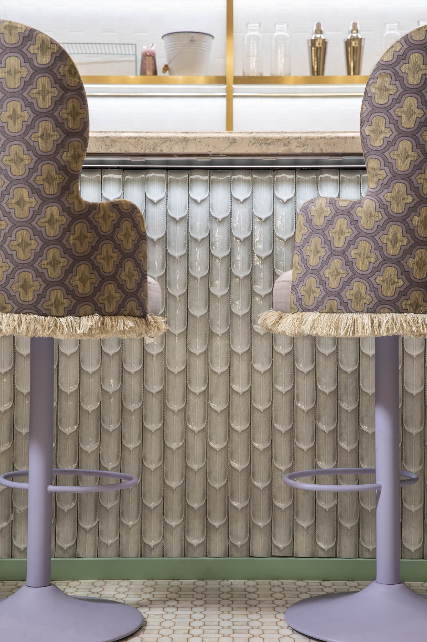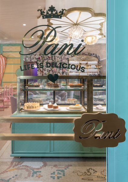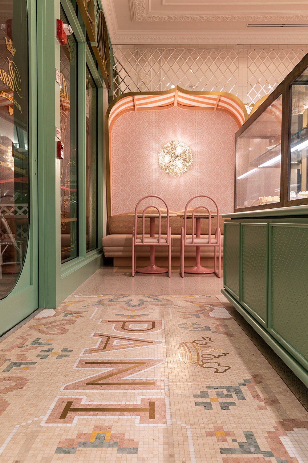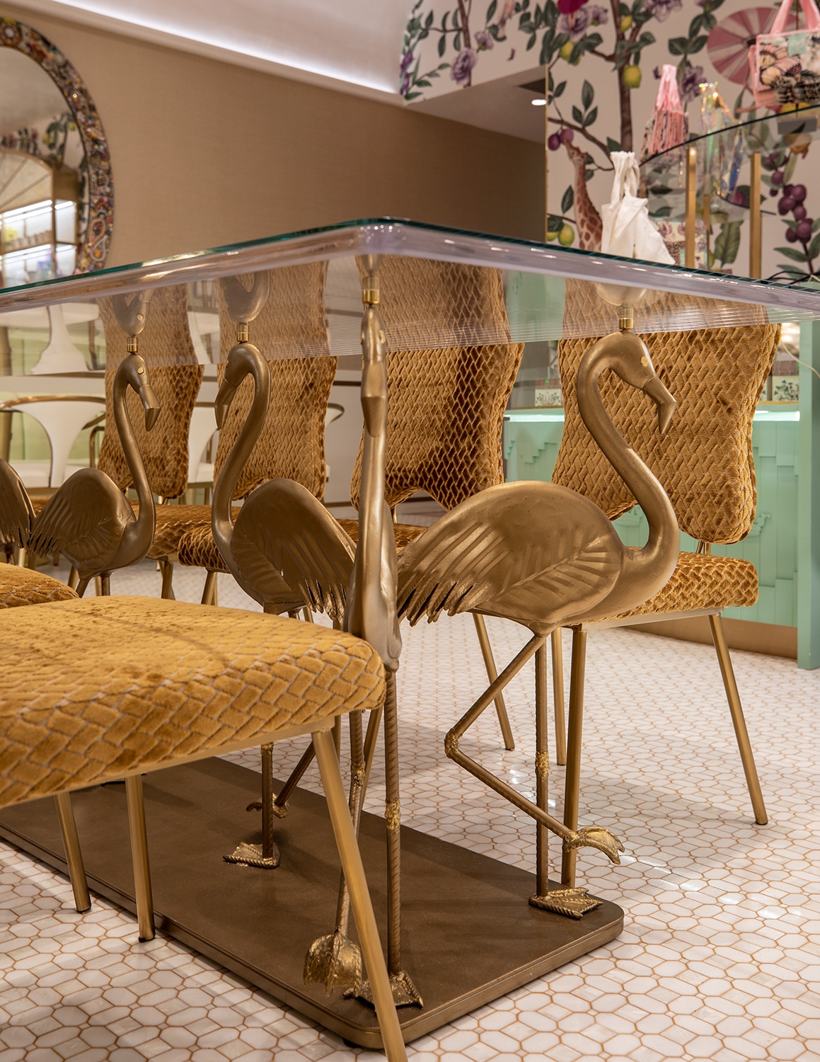 As the space is demur, the interior is anything but. The mash up of finishes, colors and curated custom design cues create an energy and initial design dislocation which feels totally connected when assembled. The sheer combination of disparate design styles come together to create a space that just makes you smile. The juxtaposition of traditional and modern blends seamlessly, but the standout is the immersive design wow, wonder and surprise to see such an eclectic mix of styles harmonizing as one. A calming palette that feels vaguely familiar yet is new and unique, just like the Bakery goods. A bold and commitment to pastel colors, gilt trim, a colorful jungle mural, and giant giraffe wall sconces, the restaurant was designed to be a haven for foodie Instagrammers which indeed it is. From the Giraffe Sconces, to the C and C cut Crowns and Gold plated Flamingo table bases, we call it a fantasy bakery where the interior reflects the spirit of the Cakes, pastries and other colorful edibles. The eclectic palate is a combination of pastels along with fantasy like elements which are soft yet lively representing a calm and vibrant spirit to the interior.