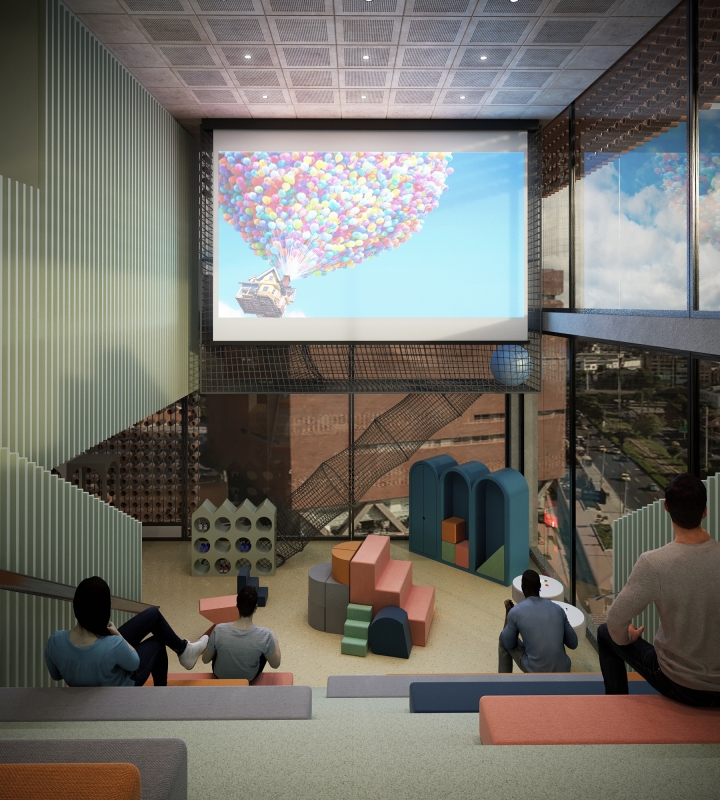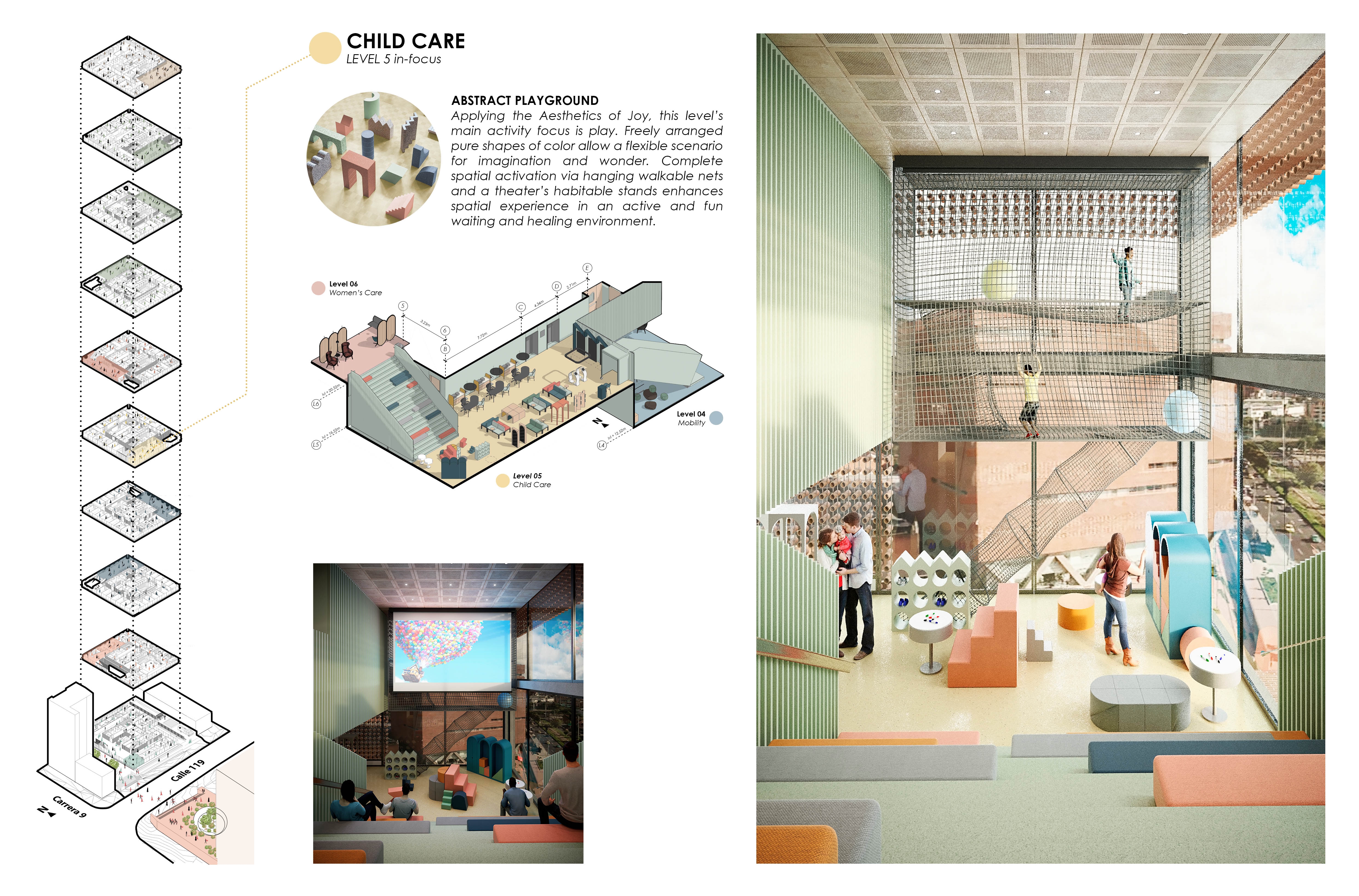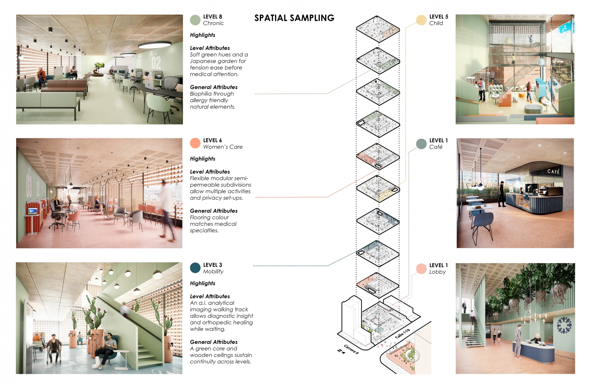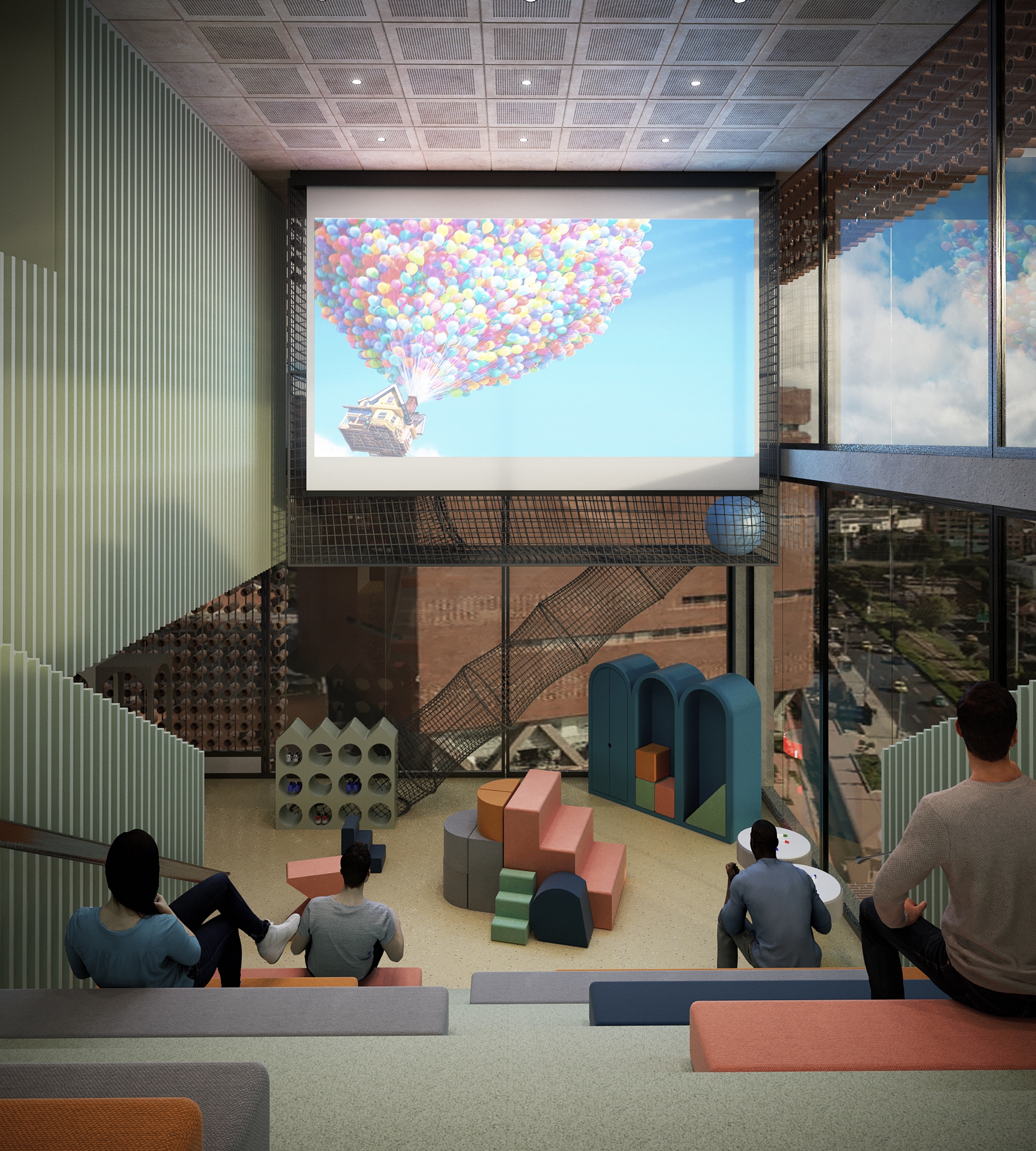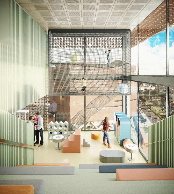 Fundación Santa Fe Outpatient Care Tower is located across a semi-pedestrianized street from the hospital’s iconic brick plaza and gardens. A receiving courtyard and an array of green stairways interconnect the public spaces of the tower in an ascending interior pedestrian spiral that elevates throughout the 10-story building. Drawing from a year-long in-depth local research, and scientific evidenced-based design studies, different health-promoting spatial attributes were merged into unique healing atmospheres tailored-made for each medical specialty level. Featuring a spatial framework for sensory comfort and wellbeing, an approachable service and information system, and activity as a means for dynamic healing and engagement, the project generates a vibrant, appealing, and diverse pathway of wellbeing environments.