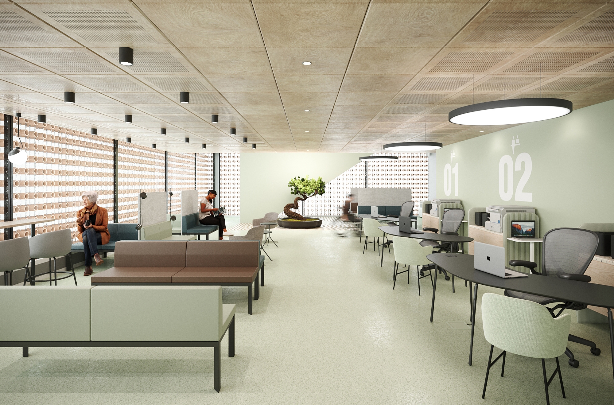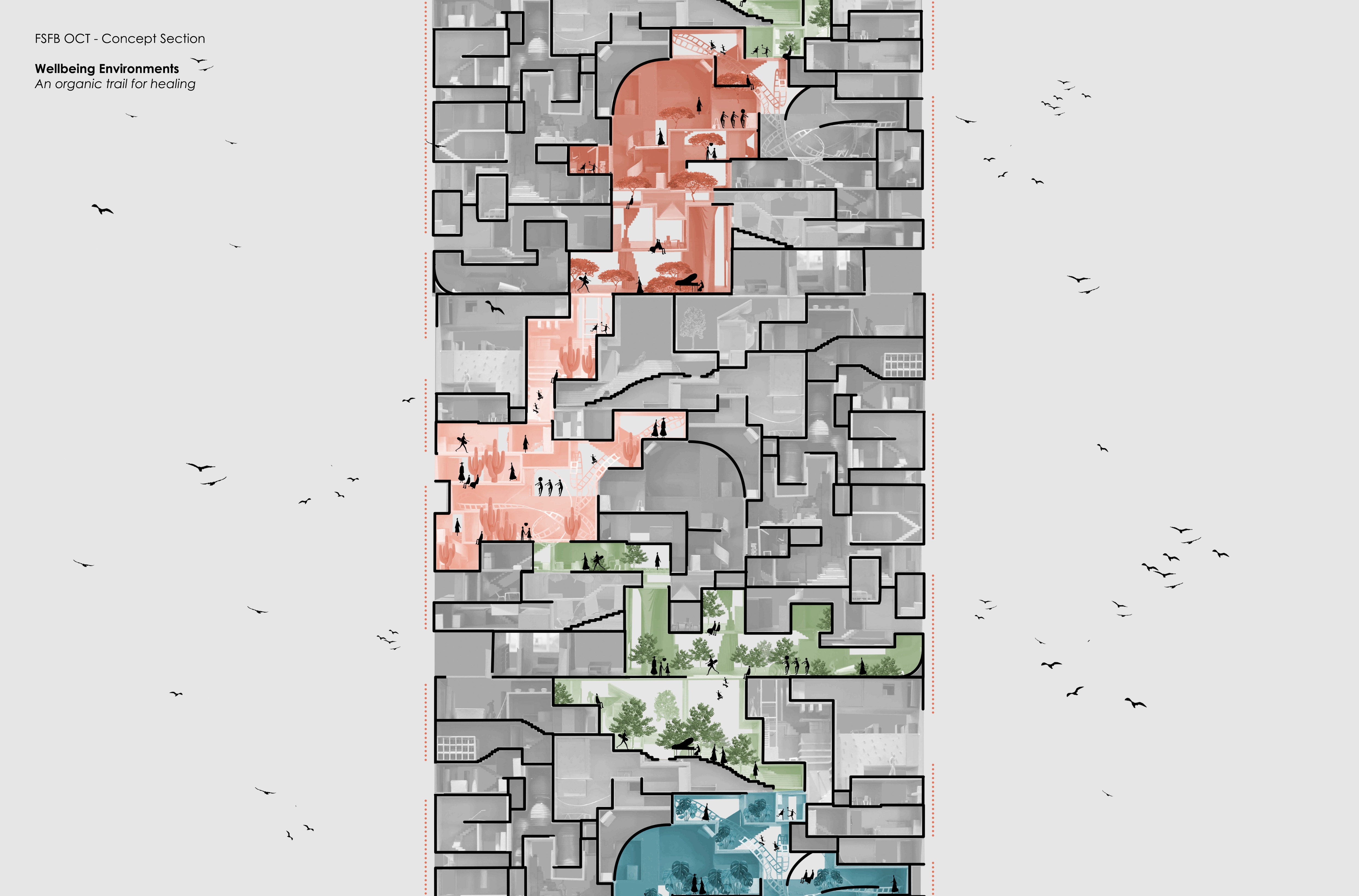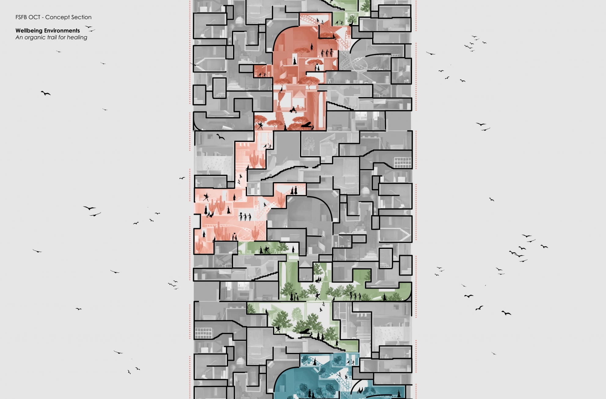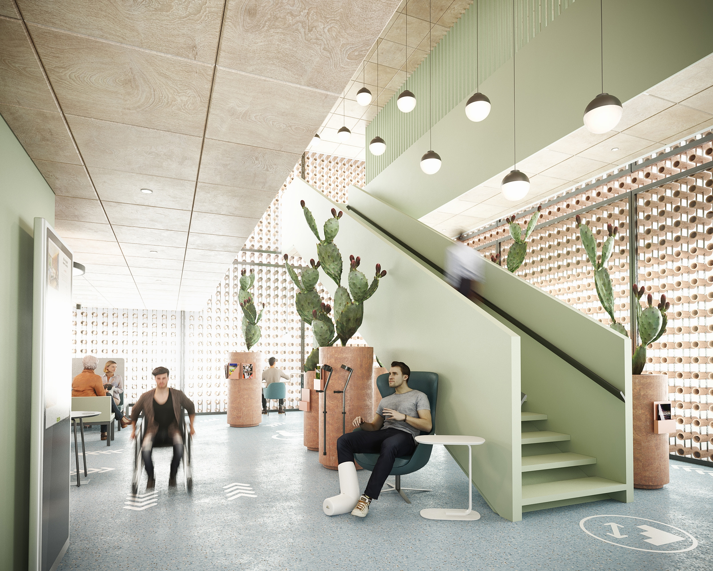 Fundación Santa Fe Outpatient Care Tower is located across a semi-pedestrianized street from the hospital’s iconic brick plaza and gardens. A receiving courtyard and an array of green stairways interconnect the public spaces of the tower in an ascending interior pedestrian spiral that elevates throughout the 10-story building. Drawing from a year-long in-depth local research, and scientific evidenced-based design studies, different health-promoting spatial attributes were merged into unique healing atmospheres tailored-made for each medical specialty level. Featuring a spatial framework for sensory comfort and wellbeing, an approachable service and information system, and activity as a means for dynamic healing and engagement, the project generates a vibrant, appealing, and diverse pathway of wellbeing environments.
