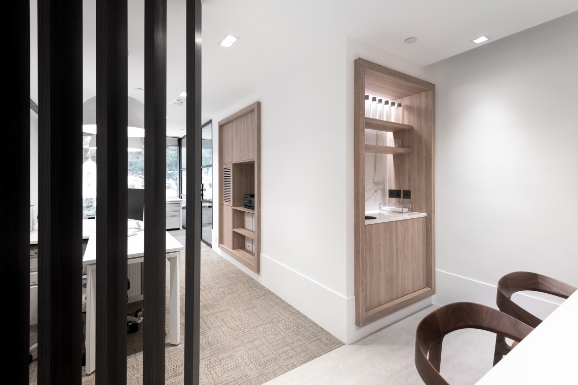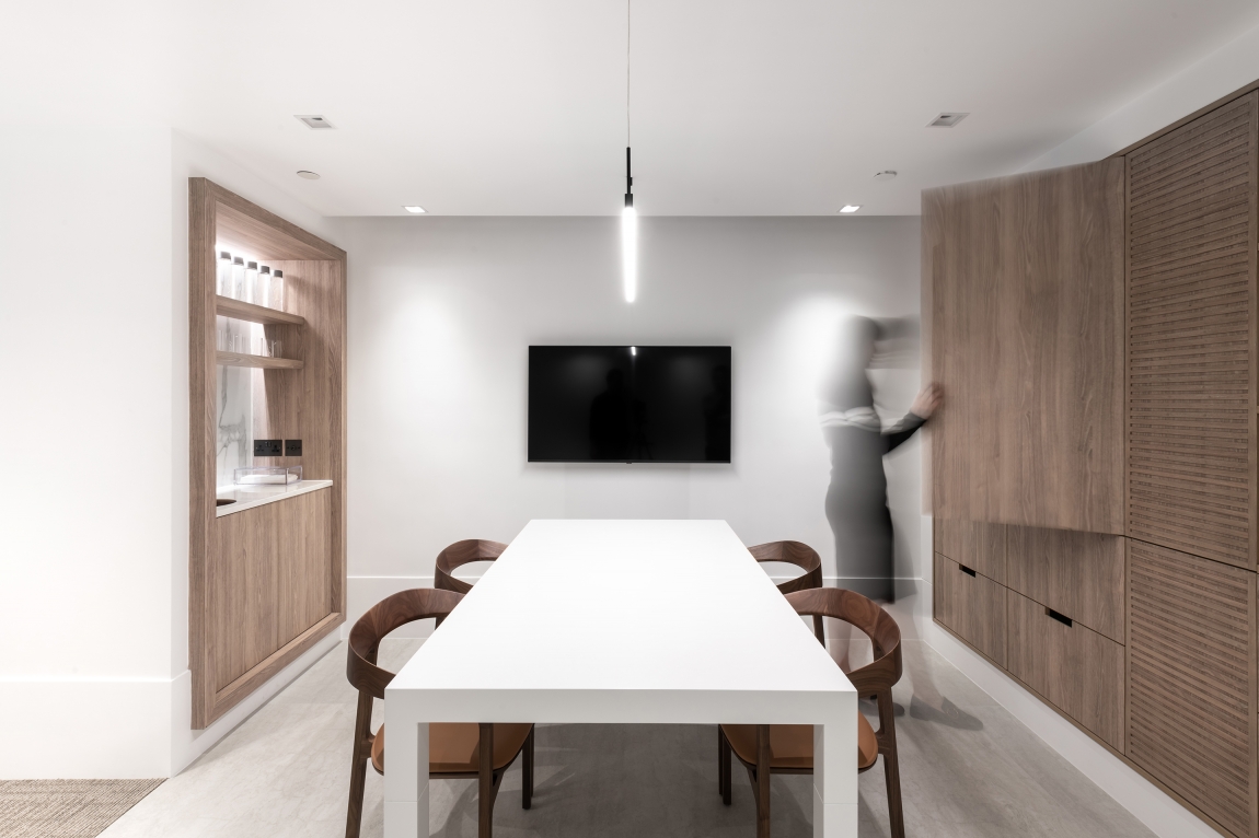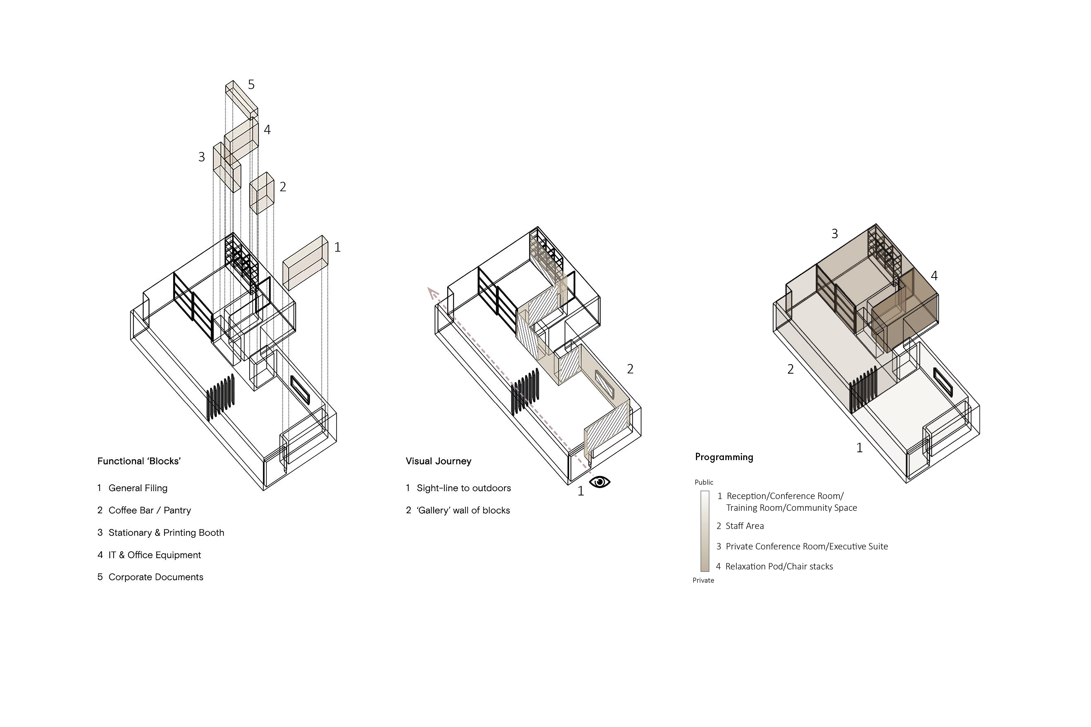 Such space needed to flex with diverse occupancies (4 -18) despite a tight enclosure (41 sq m) and low ceilings (7’4”). The solution: taking a cue from the early 20th C style - Prairie School. Horizontality in this style evoked the vast plains of the American Midwest, and here, horizontal bands of objects and lines direct the inhabitant’s gaze to the “horizontal” expanse of the office in spite of the ceiling height to reveal the potential community within. Cabinetry are conceived as a series of floating “functional blocks” embedded along a gallery-like wall that invites occupants to follow its path, and are each able to fulfill an essential purpose, such as “stationary & printing” or “F&B". Remaining areas promote flexible programming and spatial efficiency, e.g. a reception that is also a training room.