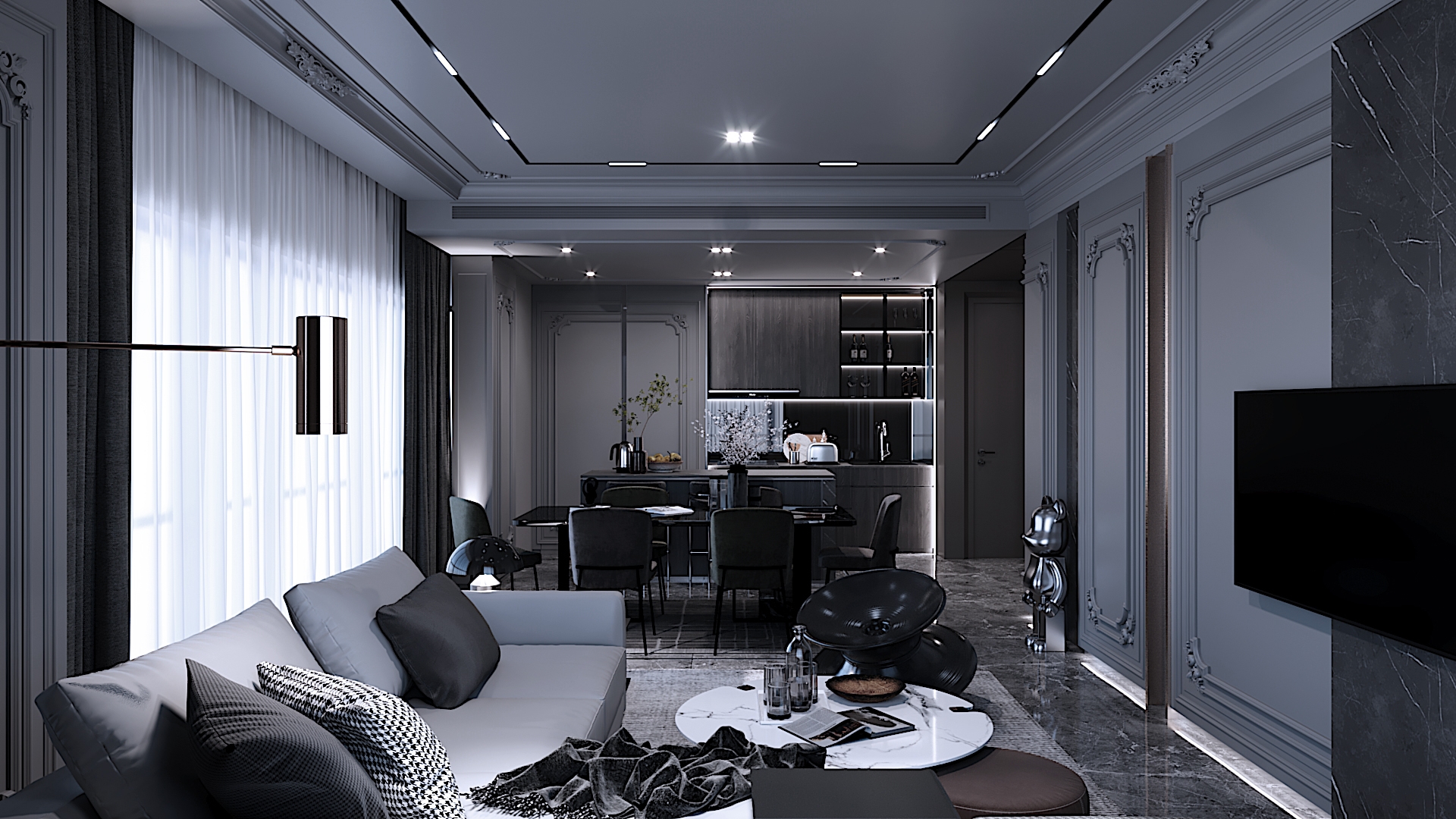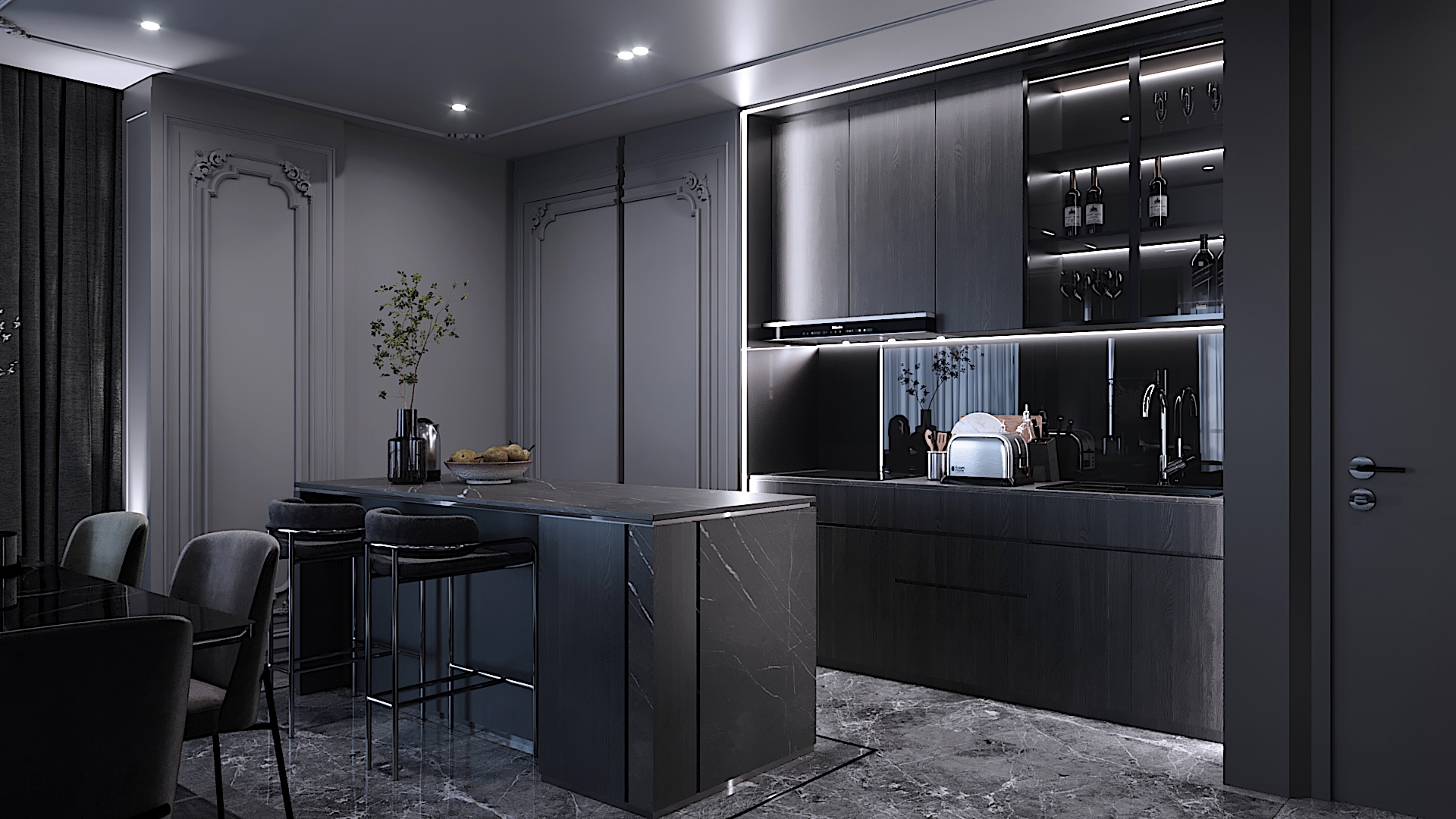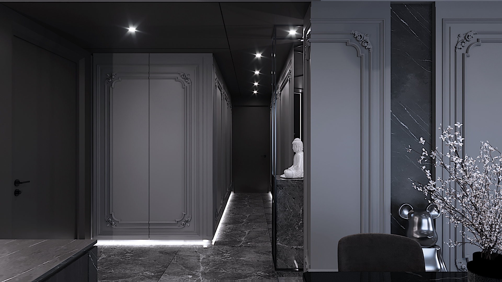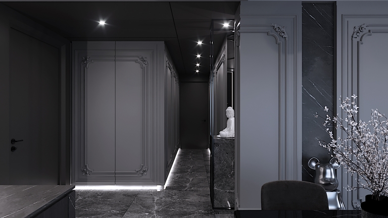 Project aimed to bring out the exotic feeling of modern classic within a provided space that is rarely done before. High end materials and vast conceptual minds are put into process in order to suits client preference. Interior atmosphere stand towards a darker ambience with a touch of cold elements. Upon entrance will be guided by a magnificent altar design using only raw marble material as overall stand and black frame to hold its ground. Each wall panel has its purpose in maintaining the overall design with each carved flower pattern to strongly emphasize classical interior elements. Hallway equipped with floor lights hidden under wall panel to further illuminates the walkway and bring out a rather luxurious ambience while proceeding down the hallway. This project is set to fully maximize its space and bombard every corner with functional design approach.