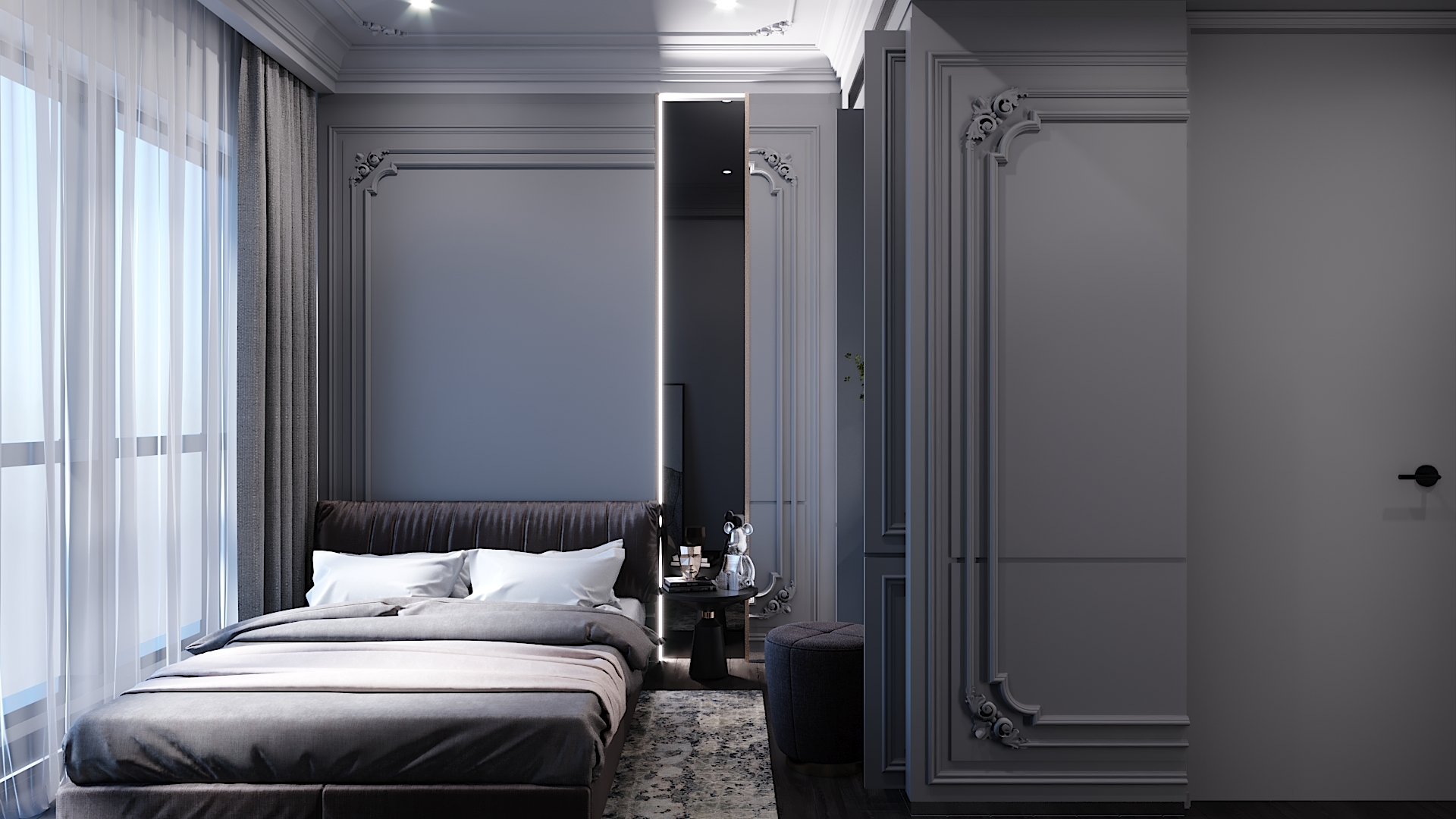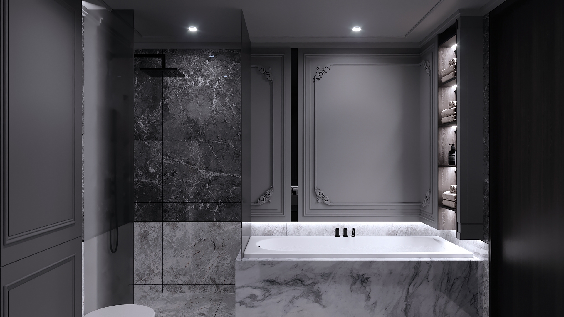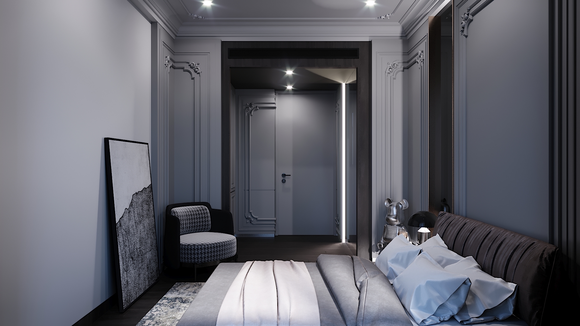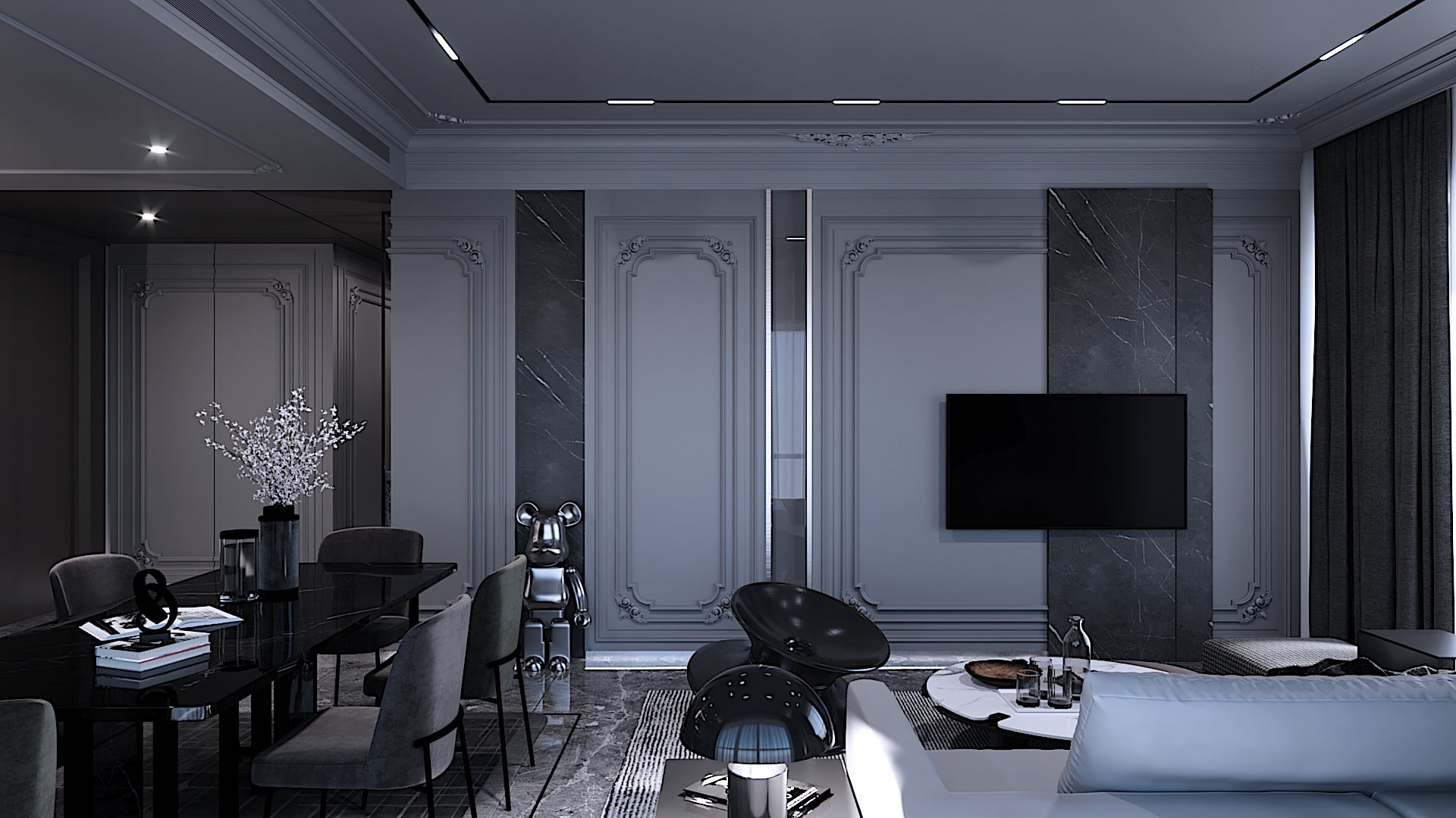 Project aimed to bring out the exotic feeling of modern classic within a provided space that is rarely done before. High end materials and vast conceptual minds are put into process in order to suits client preference. Interior atmosphere stand towards a darker ambience with a touch of cold elements. Upon entrance will be guided by a magnificent altar design using only raw marble material as overall stand and black frame to hold its ground. Each wall panel has its purpose in maintaining the overall design with each carved flower pattern to strongly emphasize classical interior elements. Hallway equipped with floor lights hidden under wall panel to further illuminates the walkway and bring out a rather luxurious ambience while proceeding down the hallway. This project is set to fully maximize its space and bombard every corner with functional design approach.