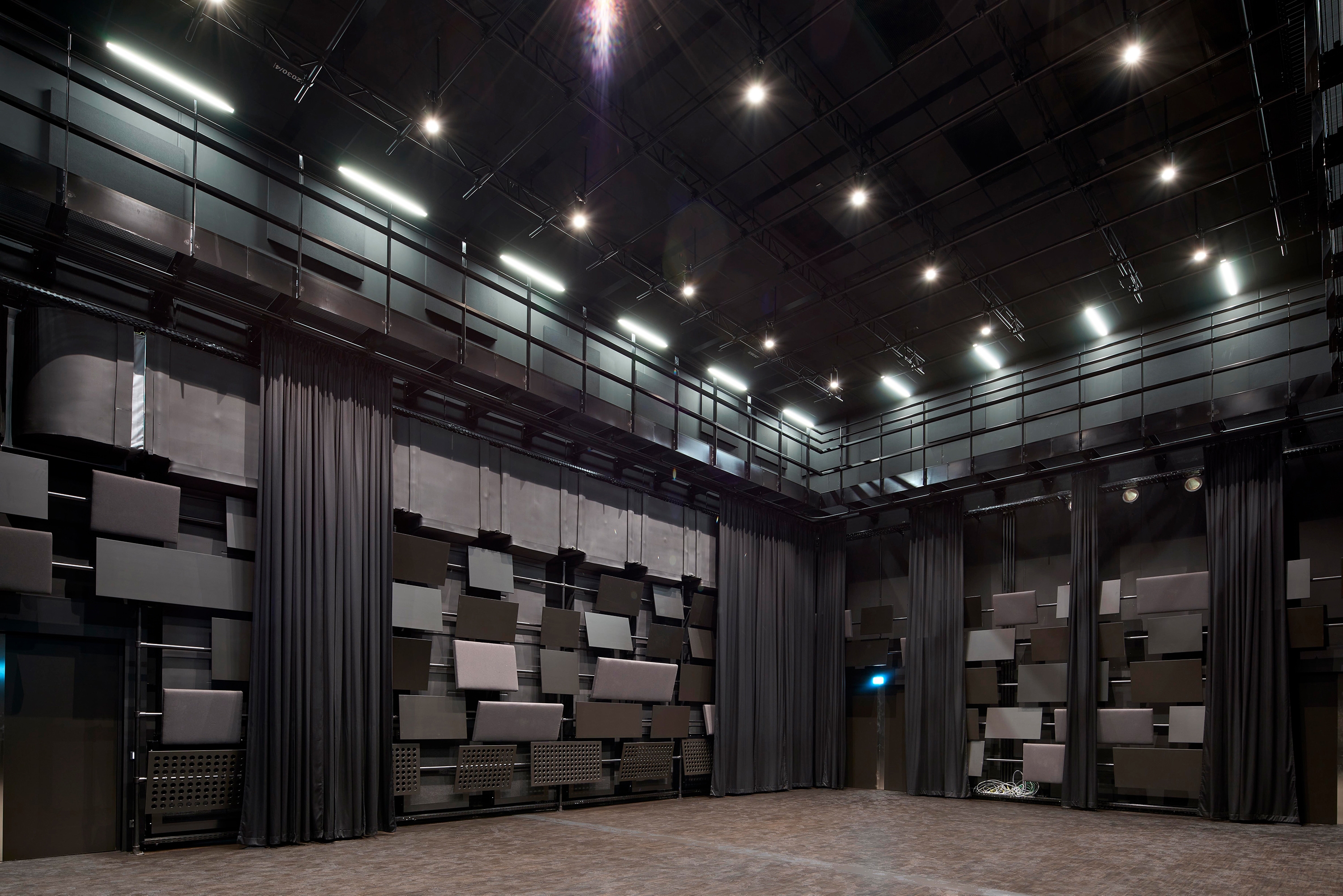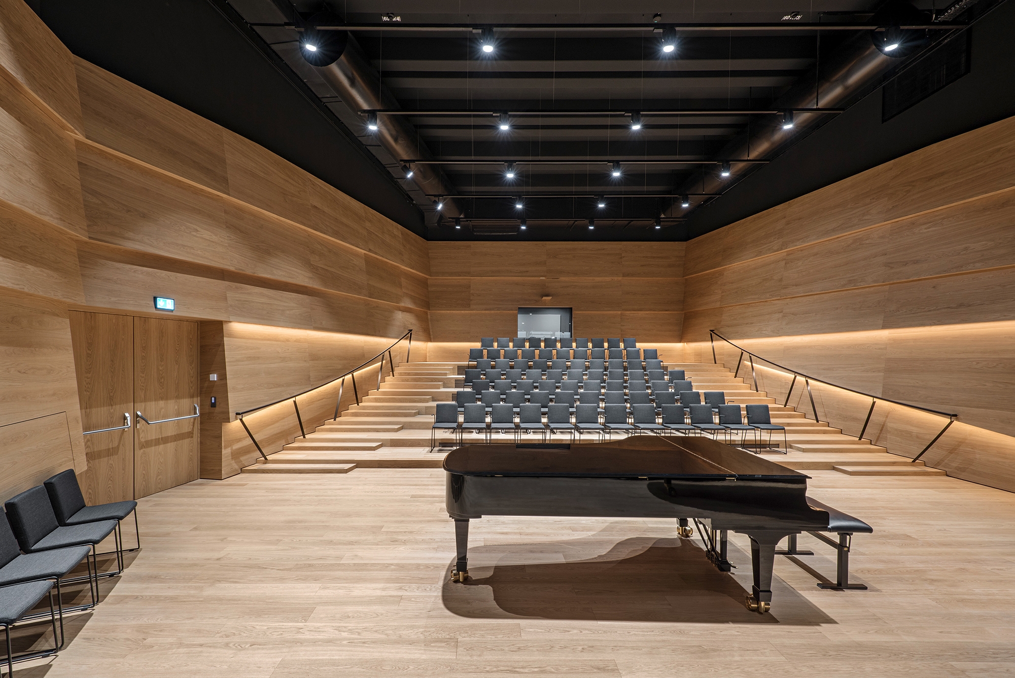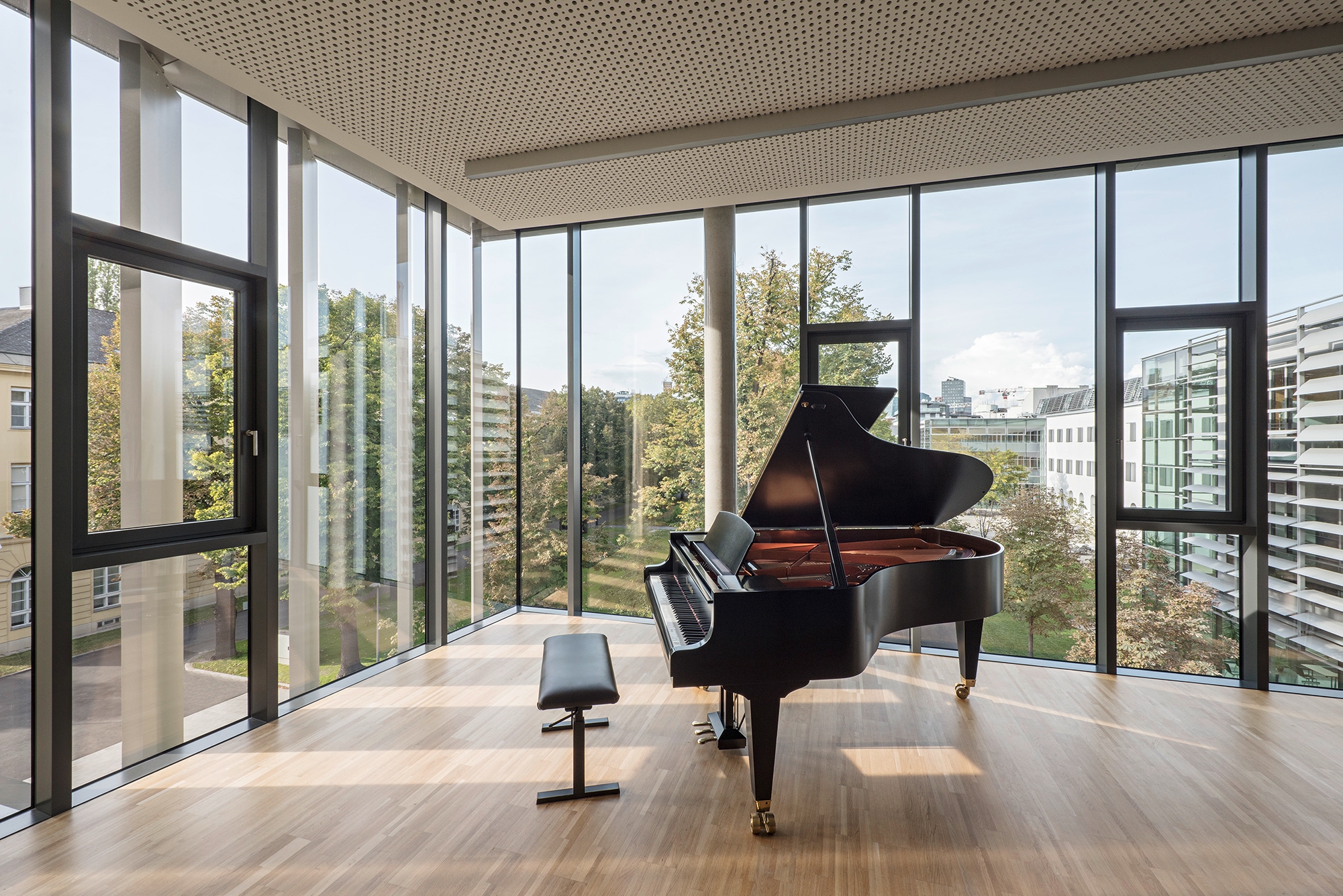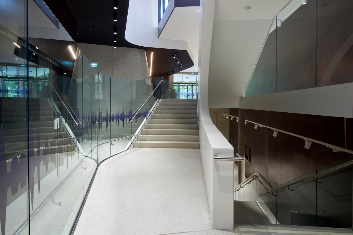 For reasons of acoustics the Institute for Electro-acoustic Music and Composition with the large halls (the Klangtheater and the recording hall) which form its nucleus is placed at basement level, along with a generously sized foyer zone.