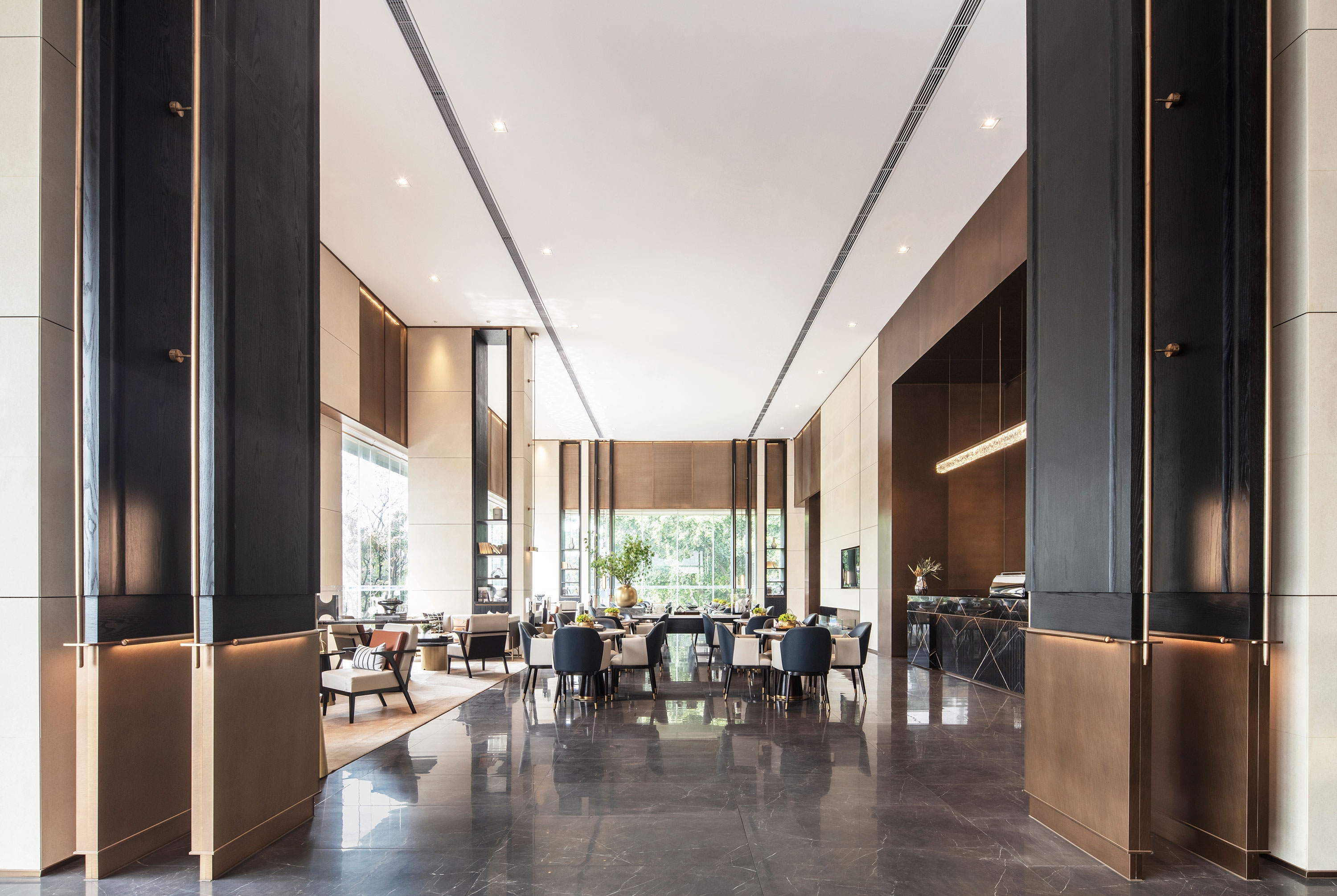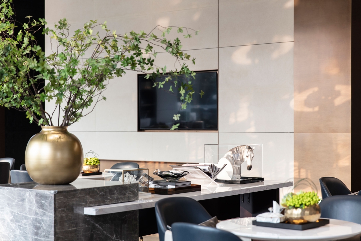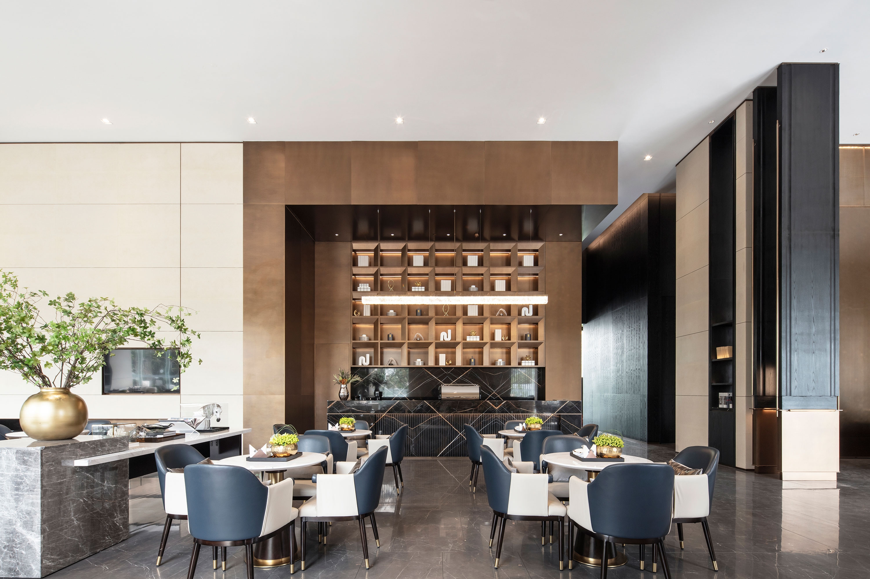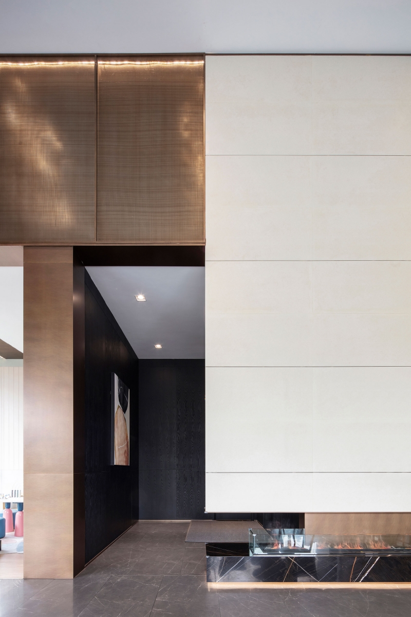 The entrance presents a stainless steel background wall with the visual identity of the residential development. The copper color of the stainless steel serves as the dominant hue of space, which not only extends the tone of the facade, but also evokes the visual memory of the Buddha statue from the cultural aspect. In this way, it helps achieve the integrity of space and architecture and gives a nod to the cultural impressions of the city.