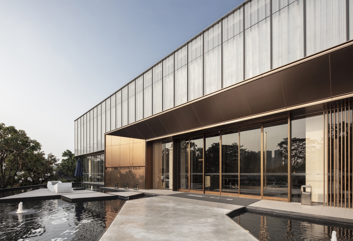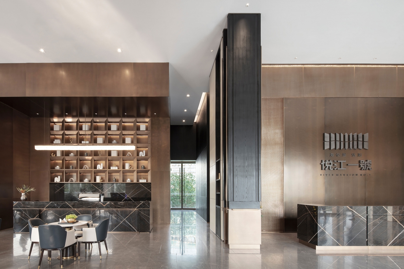 Based on the characteristics of the city and the era, the designers continued the simplistic, lively design languages that feature the residential building and used modern but dignified materials such as natural stones, stainless steel, wood veneer and perforated plates to create a trendy, powerful and solid sales center, while also incorporating the antique copper into space and subtly extending the logo elements of the River Mansion No.1, thus creating a fashionable but dignified modern urban space that inherits the cultural heritages.